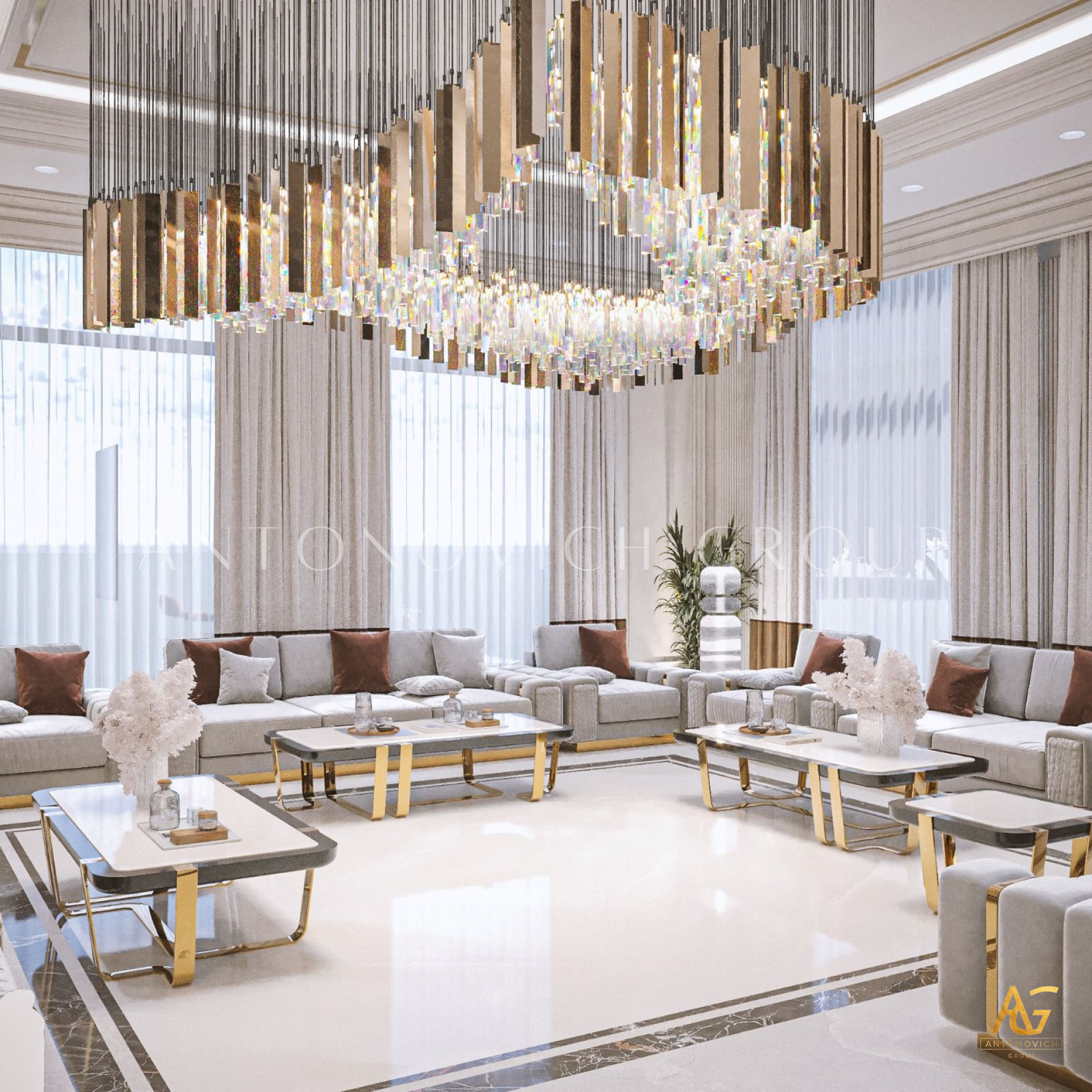 The basis of a beautiful and luxurious interior story that interior designers Abu Dhabi told, became a living room . Here closely and harmoniously the interior design of the living room and dining hall are intertwined. Cuddly and festive mood is set with the luxurious staircase with graceful contours. Hall welcomes guests with an exquisite fountain, a massive crystal chandelier and a cozy seating area by the fireplace. The living room design gives a clear idea that this house belongs to the people with impeccable taste and a keen understanding of beauty. Interior Designers Abu Dhabi offered a lot of unique beauty solutions. This based an exclusive and luxurious character of the house interior. Masterly performing the original architectural solutions with the help of the living room design stressed the advantages of planning of the multi-level floors and ceilings. The decor of the walls look elegant with marble columns with stucco capitals, added with a gloss mirrored panels with facet. Separate semicircular portal is dedicated to musical evenings. The composition with white piano on a carved marble floor looks very expressive. Dining area is located on a low podium, which is emphasized with lines of blue LED backlight. In general palette of warm shades with rich colors furniture blended that is upholstered in noble velvet of shade of red wine. Living room design harmoniously integrates respectable classics and festive art deco. Luxury mood that is created with the interior designers Abu Dhabi reflects the love of life, understanding of the world of luxury by home owners.