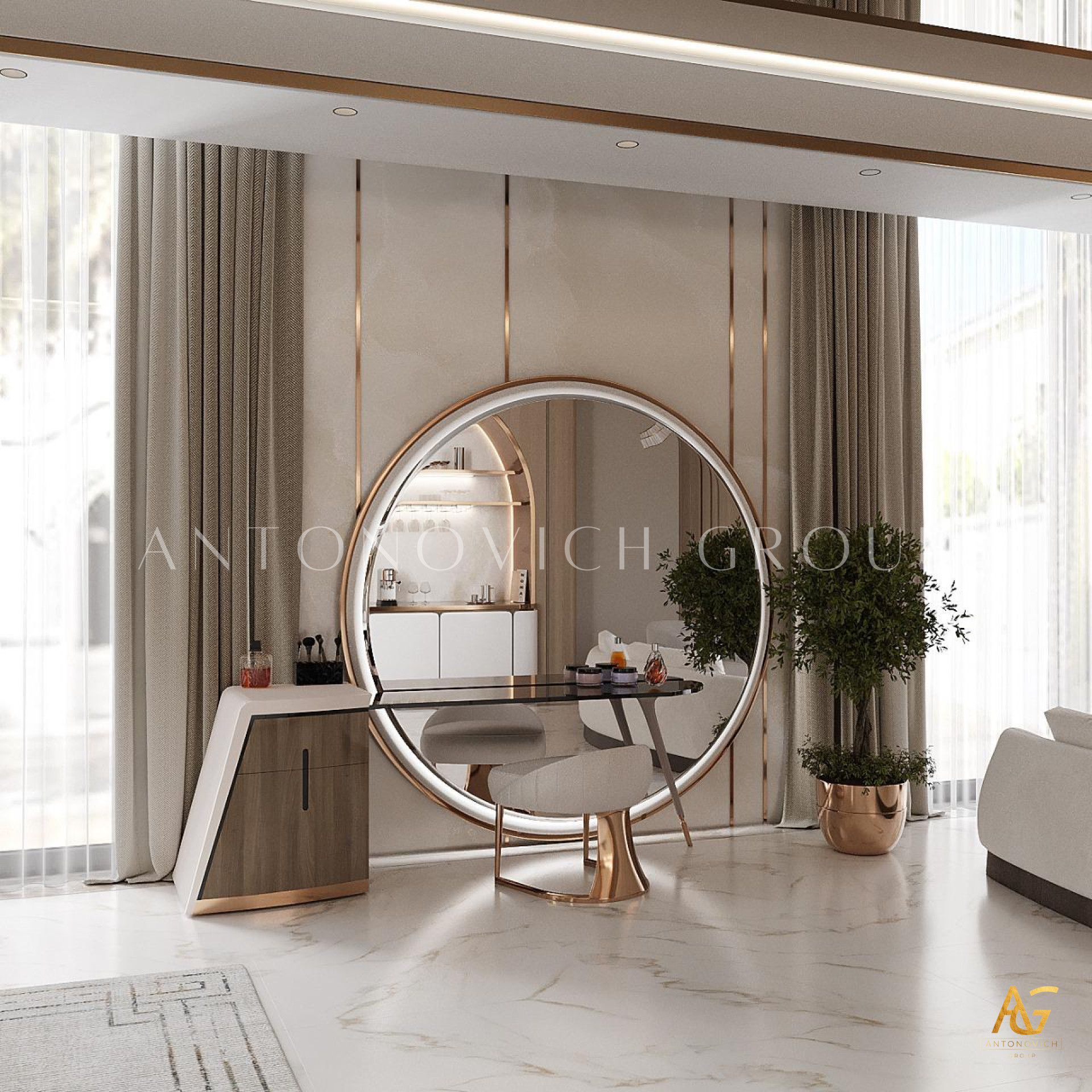 Bedroom Interior design is in a contemporary style. Harmony and cozy laconism inherent in the concept of interior design continues in the rest of the apartment. The interior bedroom is dominated by pleasant beige shades. Interior Designers Dubai perfectly organized space and highlighted the benefits of the architectural plan. Bedroom design combines the warmth of home comfort and a wonderful atmosphere for a relaxing stay at the luxurious surroundings. Interior design in a modern style best reflects how wonderful influence of modern technology on interiors is. New materials and new lighting techniques in conjunction with the author's ingenious design ideas become the basis for each new project and its bright individual image. The bedroom interior design radiates a pleasant warmth of nature. Wonderful natural wood of valuable species contributes to it, that designers use in the decoration of walls and floors. To emphasize the fact that in the bedroom interior a major role is played with a comfortable bed, interior designers Dubai make other furnishings as a wonderful addition of the bed. Functionality of the interior is added with a large sliding door wardrobe, which, thanks to the smooth glossy façade literally dissolves in the space of the cozy bedroom. High soft headboard, as if gently hugs its contours and visually keeps exquisite bedside tables with elegant sconces. In the wall decor interior designers Dubai use glossy panel of milk chocolate color, which complements the cozy mood of the bedroom interior.