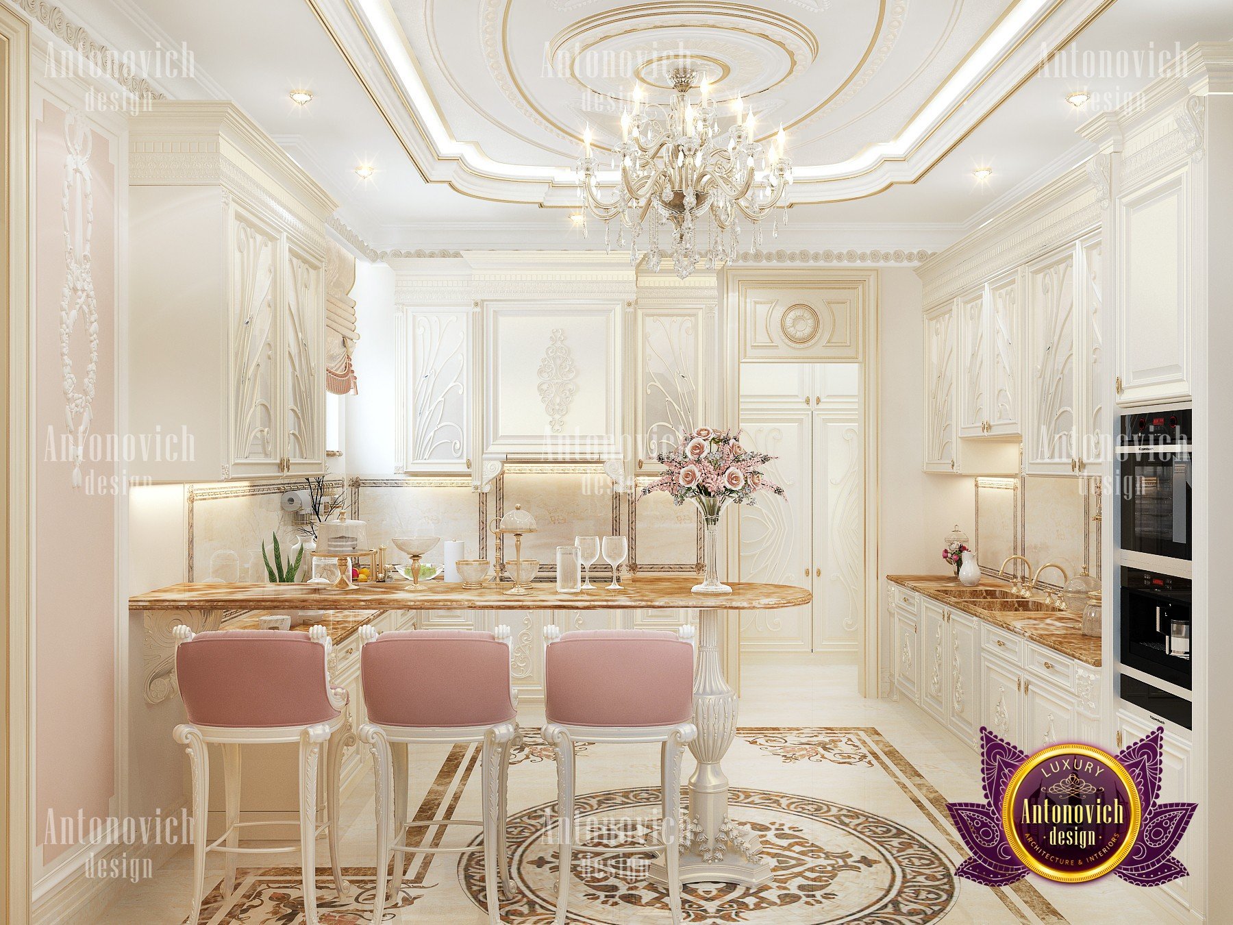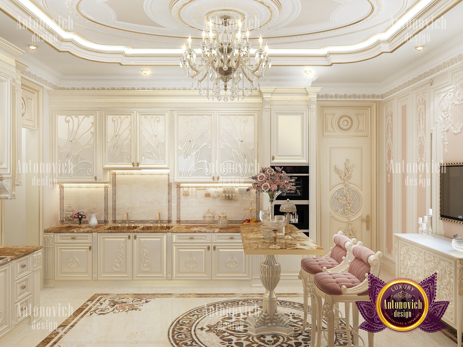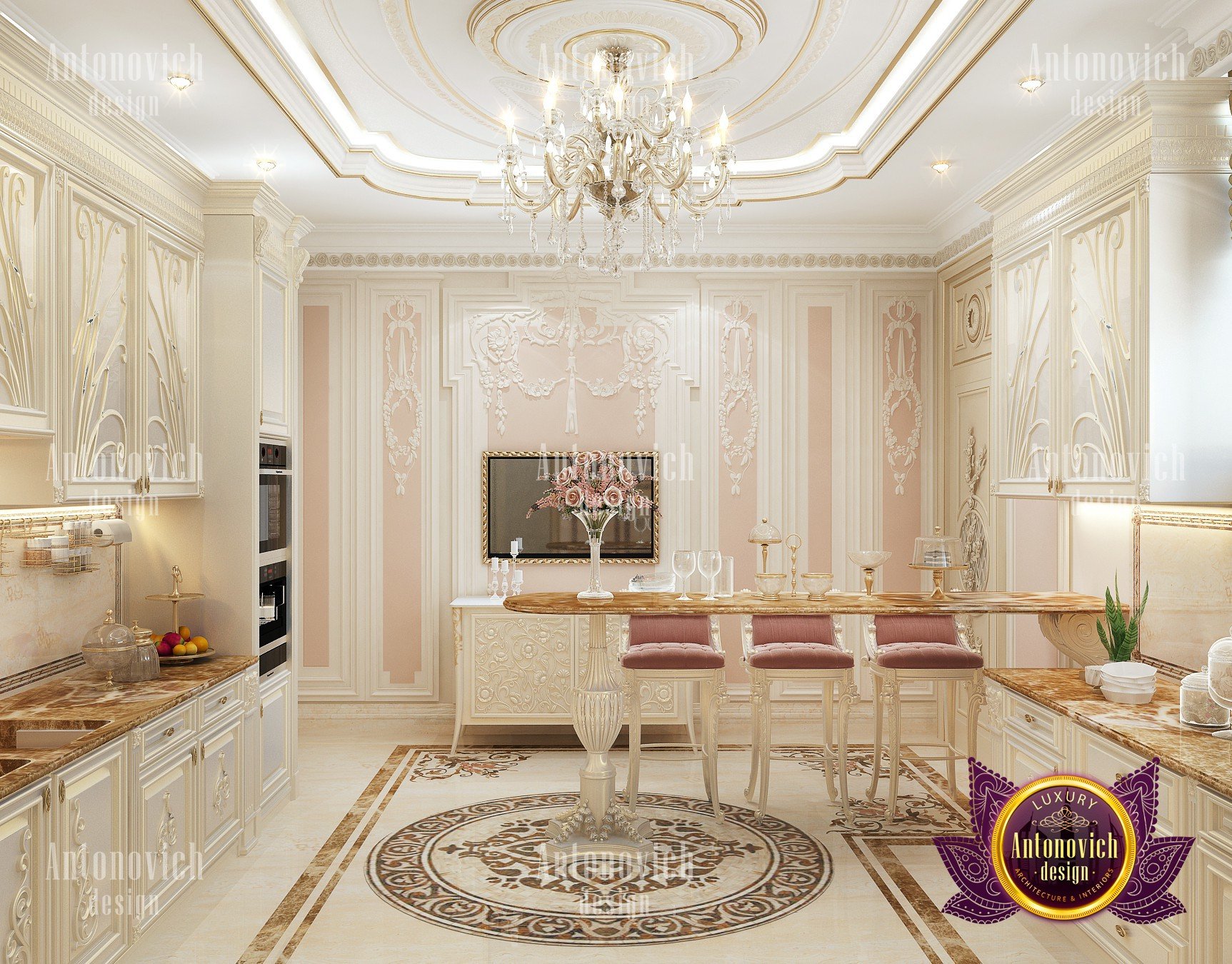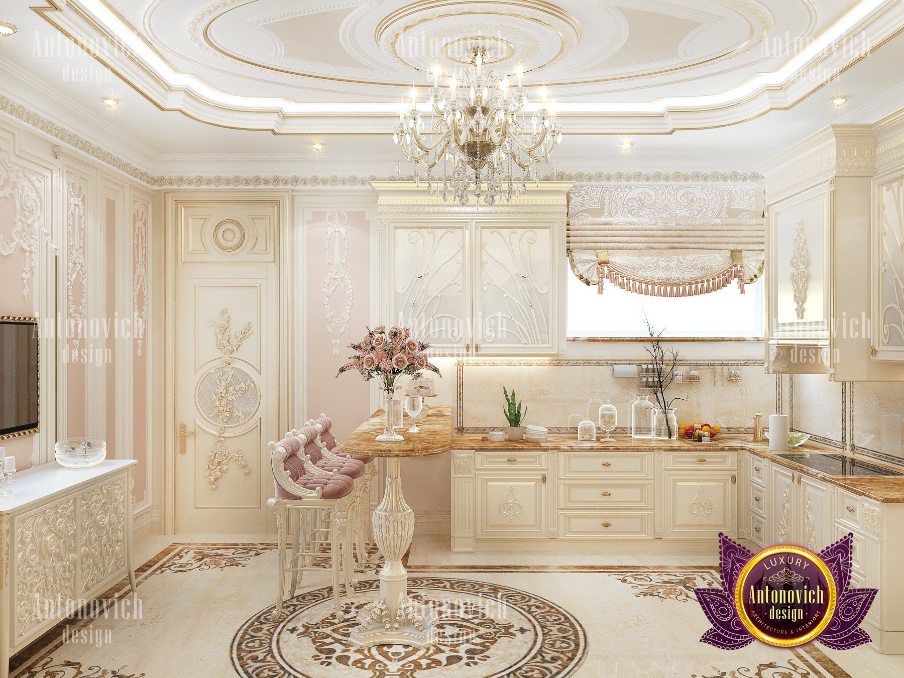 The interior designers of Dubai Studio Luxury Antonovich Design offered very cozy and laconic kitchen interior in modern style. The purity of shapes and lines in the interior is simply mesmerizing, giving a sense of aesthetic pleasure. To create a unique image of warmth, comfort and cozy interior designers Dubai offered range of warm colors from cream to brown. Kitchen interior design is always a combination of luxury and functionality. Laconic furniture facades made of natural wood veiled latest storage systems and modern kitchen appliances. Furniture in the interior does not load space with its presence, but rather stylish shades other, more vivid details. Only a line of soft lighting, which complemented the kitchen, makes it brighter and more stylish. Bright marble floor is in perfect harmony with a laconic ceiling decor. Interior Designers Dubai combine modern and traditional ways of lighting and the chandelier. In the working area the ceiling is outlined with narrow niches with built-in ceiling lights. This laconic at minimalist level smoothly flows into the more elegant and stylish dining area. The center of the space is defined by elegant chandeliers from a variety of silver chains. High chairs are upholstered in soft velvet of noble creamy.
