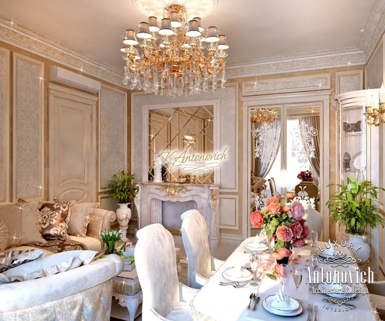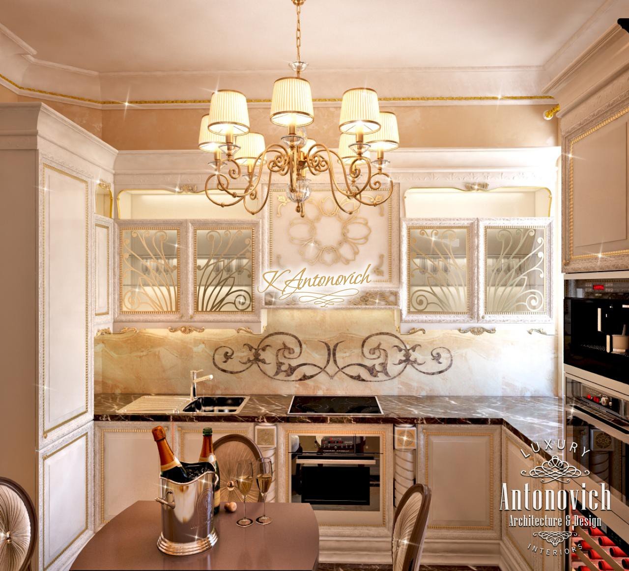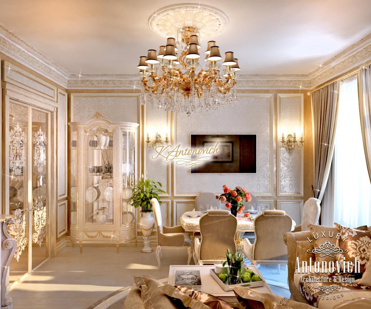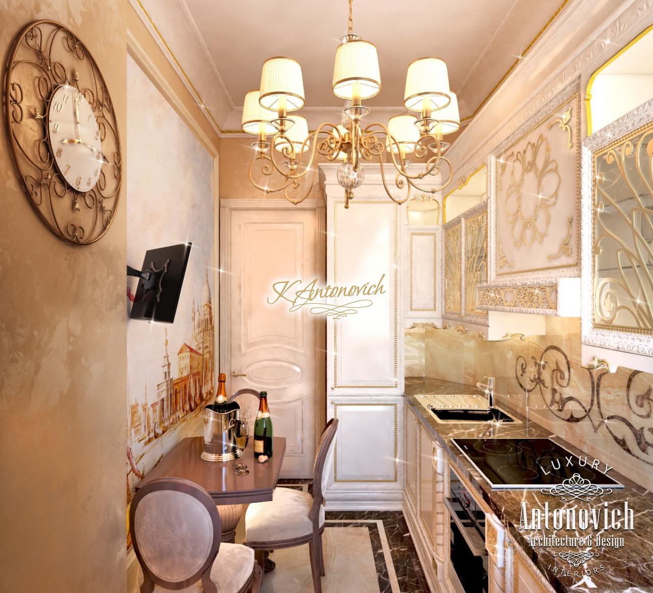 Authors of a project from a studio Luxury Antonovich Design have created apartment interior design, which you can easily compare with a royal luxury of a palace. In a cozy living room tenderness and warmth of home comfort reign. In a modern interior trend towards unification of spaces is becoming more and more popular. The living room looks quite harmonious with a dining area. As a rule, the dining area is located at the window, to enjoy fine dining, enjoy the beautiful scenery outside the window. The luxurious apartment interior gives no less refined aesthetic pleasure, which corresponds to a perfect canons of modern classics. Ceiling design is quite traditional. Elegant stucco and elegant chandelier, as well as a wide molding that outlines the ceiling around the perimeter look great. For the decoration of the walls in the living room interior designers offered luxurious silk wallpaper with delicate lace ornaments. Furniture is upholstered in noble silk and velvet. Dining room is separated from the rest of the apartment with fine doors made of transparent glass with elaborate patterns. Interior designers Dubai didn't miss such a constant attribute of the hearth, like a fireplace. Luxurious fireplace of white marble looks especially well, thanks to wall decor in the form of a large panel with a mirror facet. The kitchen has an exquisite image and excellent functionality. The white facades of kitchen furniture, which are inlaid with gold carved decor, contrast elegantly with working surfaces of dark natural marble.