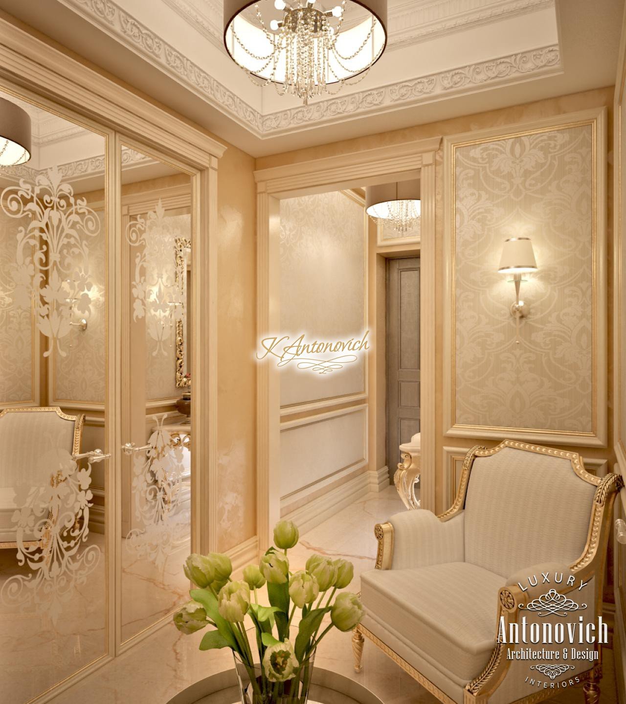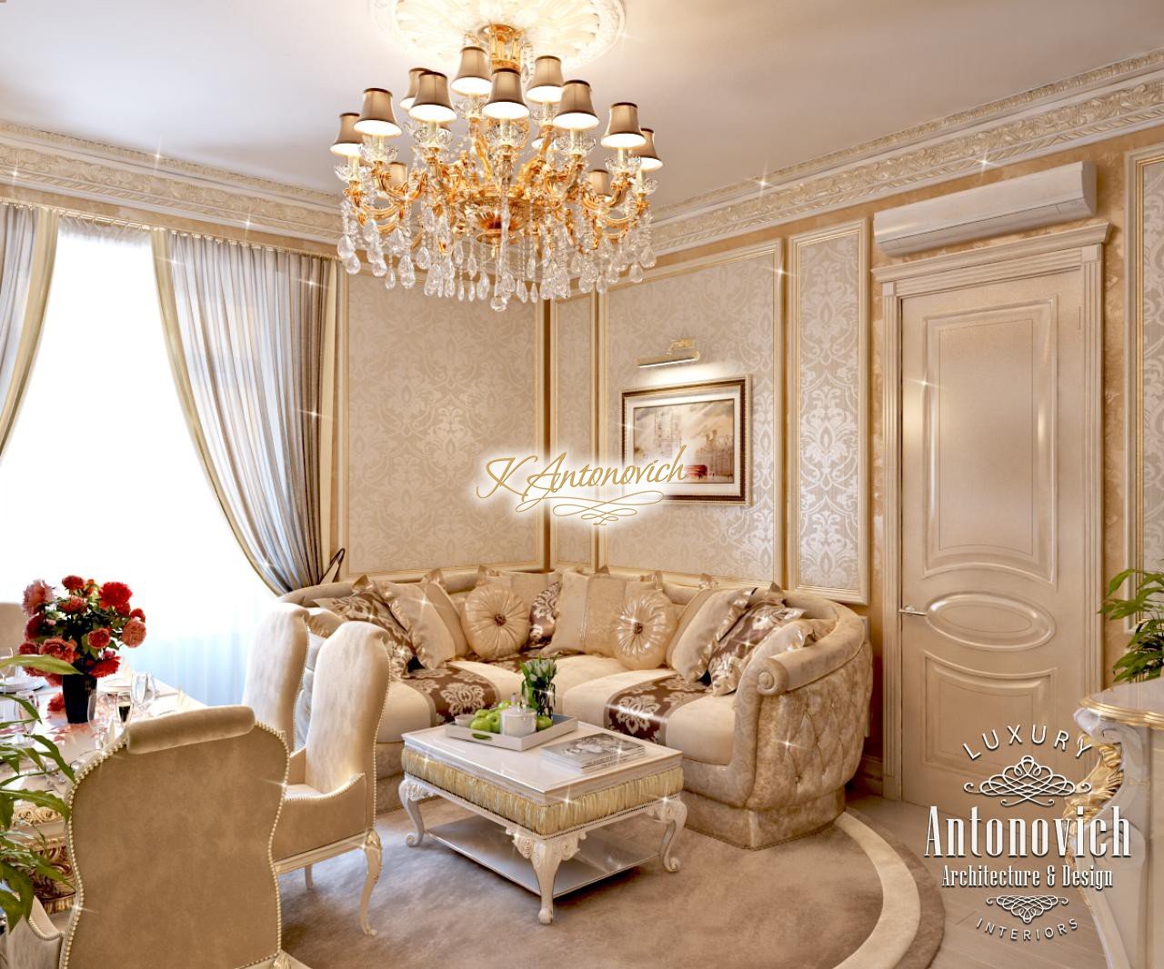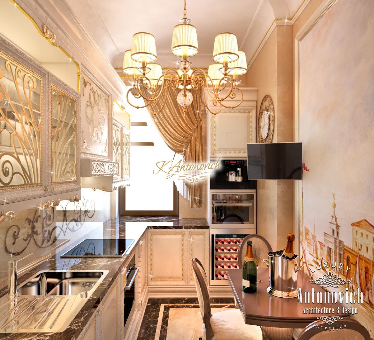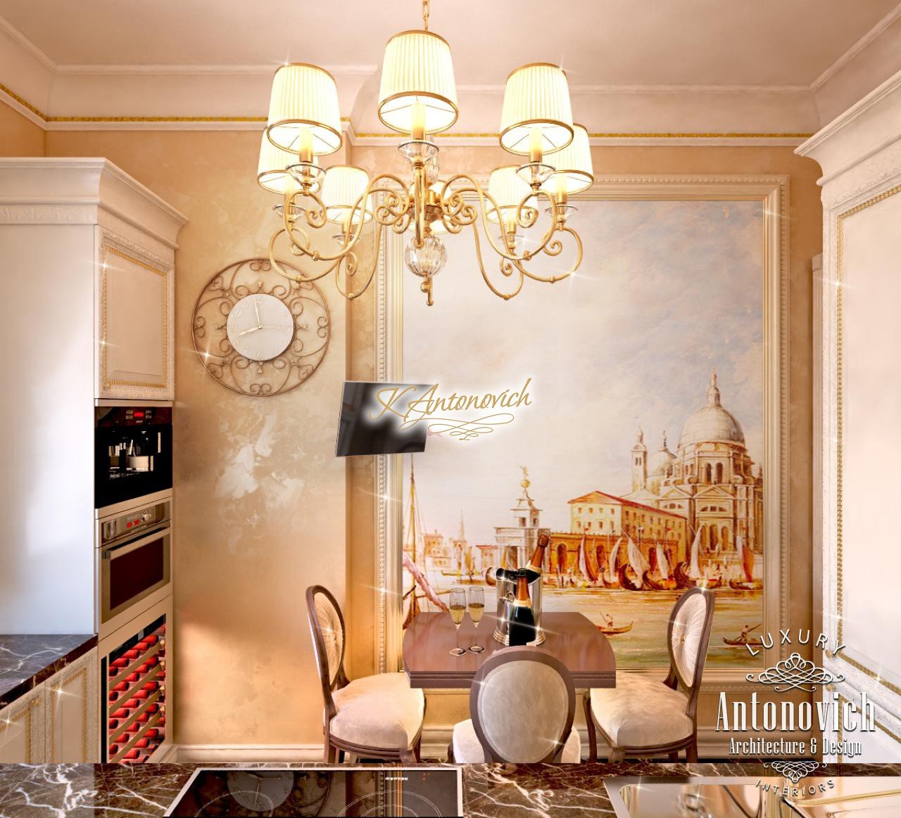 Authors of a project from a studio Luxury Antonovich Design have created apartment interior design, which you can easily compare with a royal luxury of a palace. In a cozy living room tenderness and warmth of home comfort reign. In a modern interior trend towards unification of spaces is becoming more and more popular. The living room looks quite harmonious with a dining area. As a rule, the dining area is located at the window, to enjoy fine dining, enjoy the beautiful scenery outside the window. The luxurious apartment interior gives no less refined aesthetic pleasure, which corresponds to a perfect canons of modern classics. Ceiling design is quite traditional. Elegant stucco and elegant chandelier, as well as a wide molding that outlines the ceiling around the perimeter look great. For the decoration of the walls in the living room interior designers offered luxurious silk wallpaper with delicate lace ornaments. Furniture is upholstered in noble silk and velvet. Dining room is separated from the rest of the apartment with fine doors made of transparent glass with elaborate patterns. Interior designers Dubai didn't miss such a constant attribute of the hearth, like a fireplace. Luxurious fireplace of white marble looks especially well, thanks to wall decor in the form of a large panel with a mirror facet. The kitchen has an exquisite image and excellent functionality. The white facades of kitchen furniture, which are inlaid with gold carved decor, contrast elegantly with working surfaces of dark natural marble.