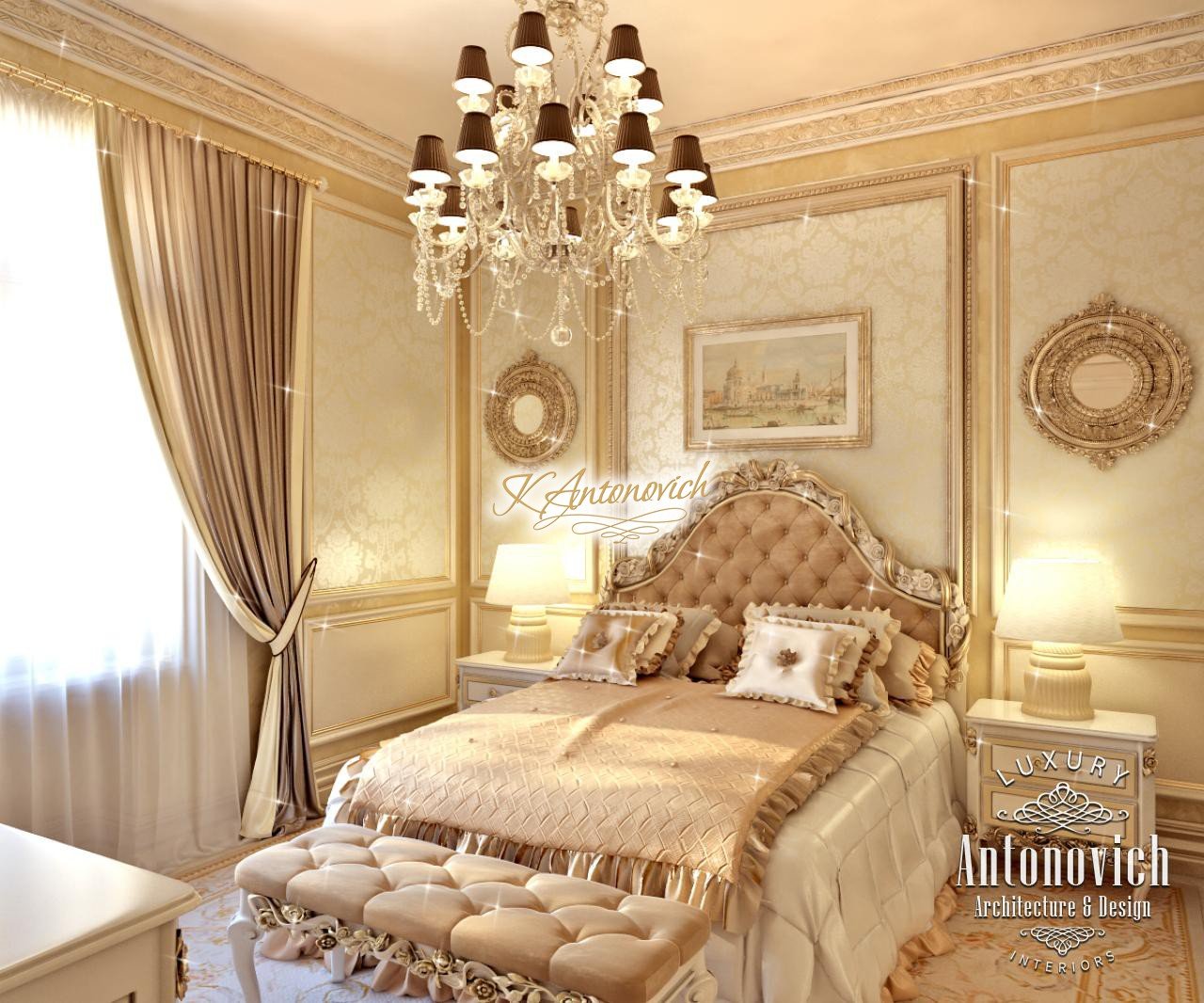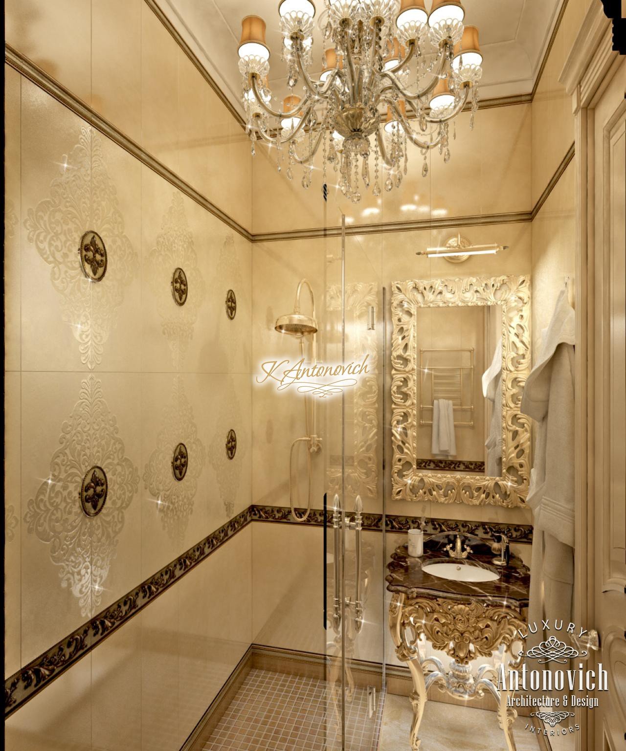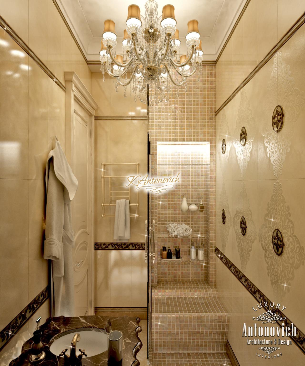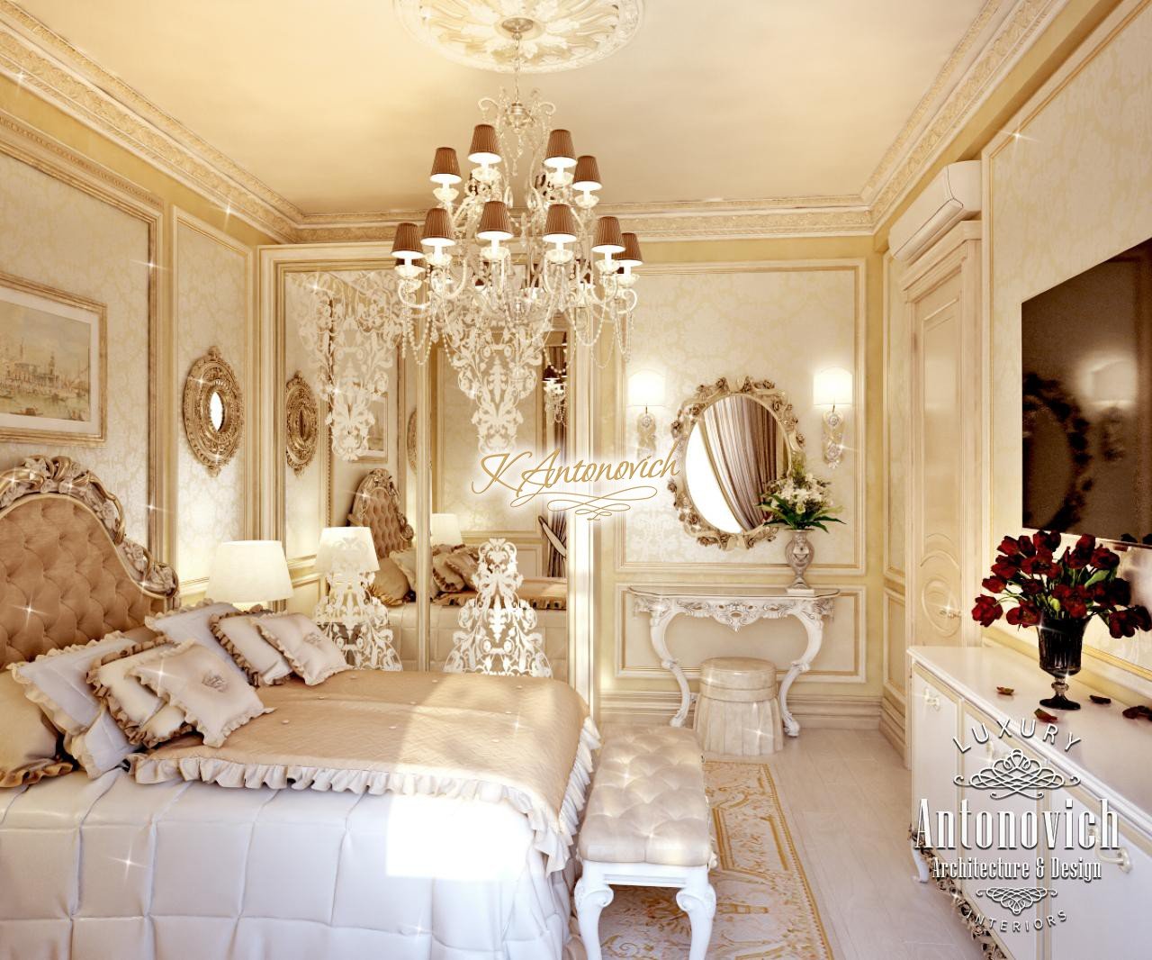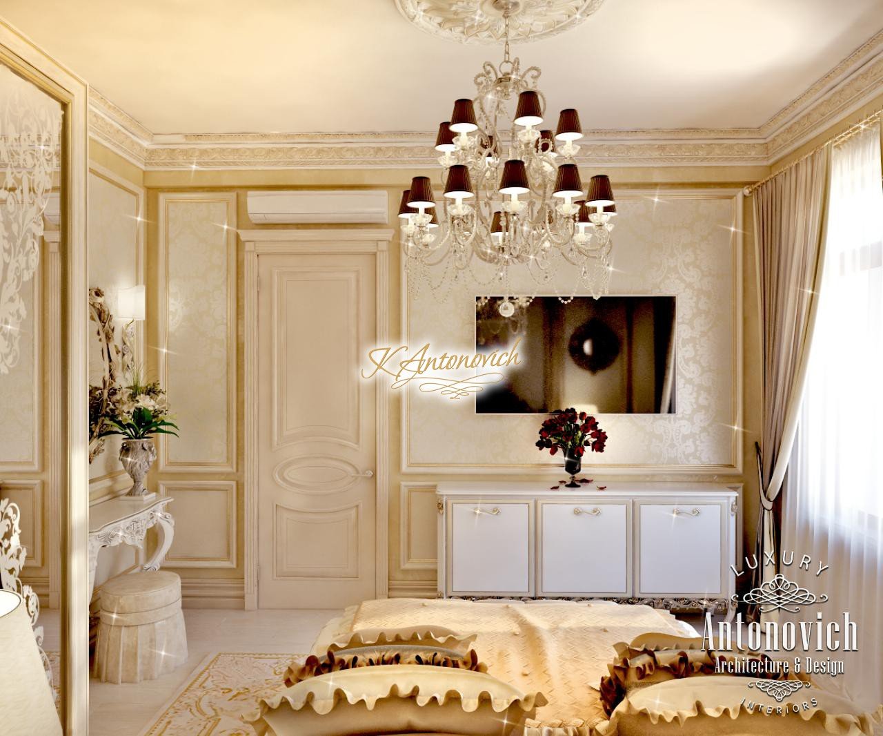Authors of a project from a studio Luxury Antonovich Design have created apartment interior design, which you can easily compare with a royal luxury of a palace. In a cozy living room tenderness and warmth of home comfort reign. In a modern interior trend towards unification of spaces is becoming more and more popular. The living room looks quite harmonious with a dining area. As a rule, the dining area is located at the window, to enjoy fine dining, enjoy the beautiful scenery outside the window. The luxurious apartment interior gives no less refined aesthetic pleasure, which corresponds to a perfect canons of modern classics. Ceiling design is quite traditional. Elegant stucco and elegant chandelier, as well as a wide molding that outlines the ceiling around the perimeter look great. For the decoration of the walls in the living room interior designers offered luxurious silk wallpaper with delicate lace ornaments. Furniture is upholstered in noble silk and velvet. Dining room is separated from the rest of the apartment with fine doors made of transparent glass with elaborate patterns. Interior designers Dubai didn't miss such a constant attribute of the hearth, like a fireplace. Luxurious fireplace of white marble looks especially well, thanks to wall decor in the form of a large panel with a mirror facet. The kitchen has an exquisite image and excellent functionality. The white facades of kitchen furniture, which are inlaid with gold carved decor, contrast elegantly with working surfaces of dark natural marble.