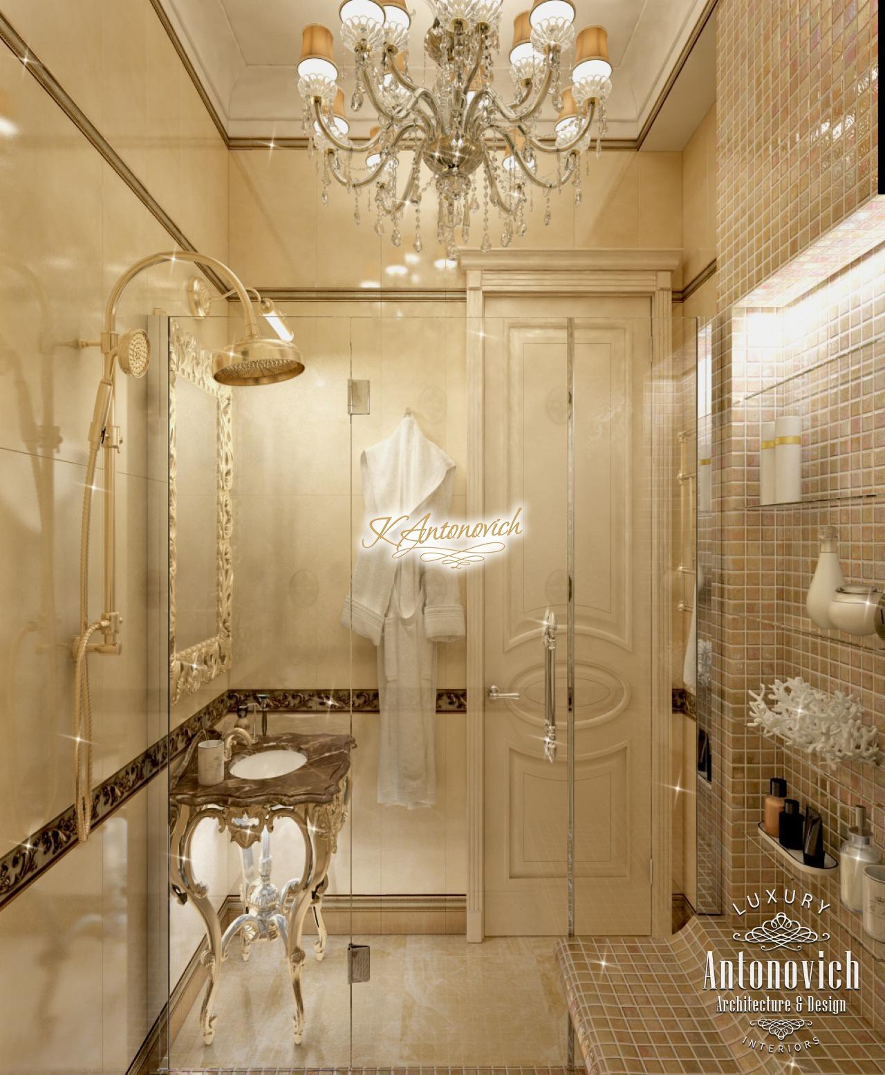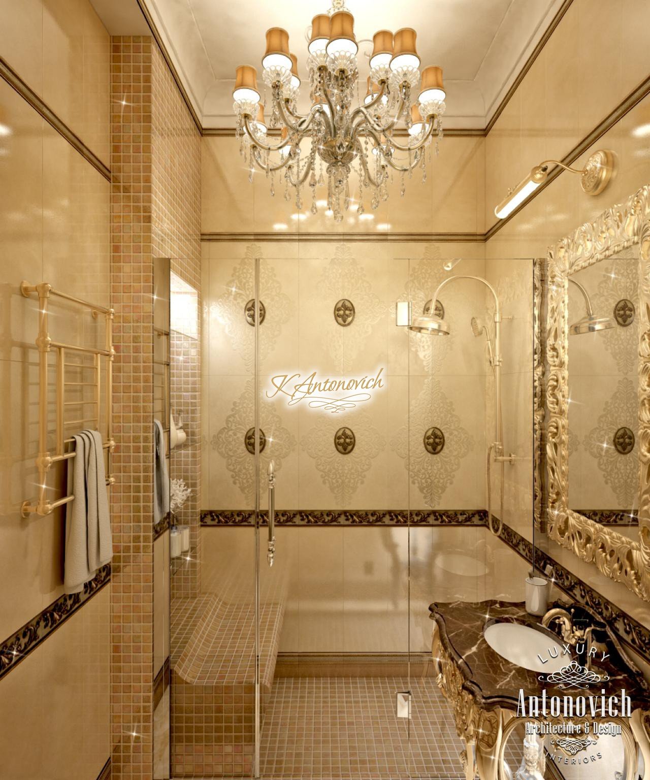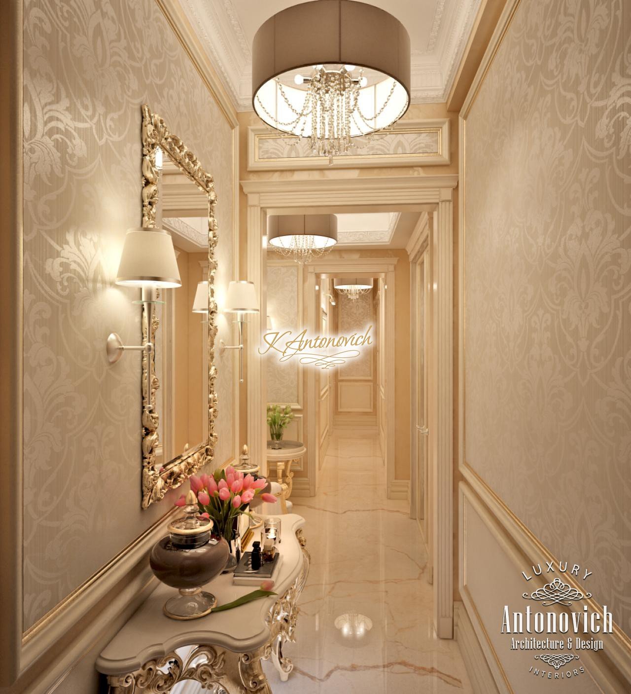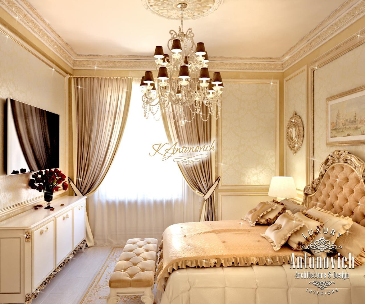 Authors of a project from a studio Luxury Antonovich Design have created apartment interior design, which you can easily compare with a royal luxury of a palace. In a cozy living room tenderness and warmth of home comfort reign. In a modern interior trend towards unification of spaces is becoming more and more popular. The living room looks quite harmonious with a dining area. As a rule, the dining area is located at the window, to enjoy fine dining, enjoy the beautiful scenery outside the window. The luxurious apartment interior gives no less refined aesthetic pleasure, which corresponds to a perfect canons of modern classics. Ceiling design is quite traditional. Elegant stucco and elegant chandelier, as well as a wide molding that outlines the ceiling around the perimeter look great. For the decoration of the walls in the living room interior designers offered luxurious silk wallpaper with delicate lace ornaments. Furniture is upholstered in noble silk and velvet. Dining room is separated from the rest of the apartment with fine doors made of transparent glass with elaborate patterns. Interior designers Dubai didn't miss such a constant attribute of the hearth, like a fireplace. Luxurious fireplace of white marble looks especially well, thanks to wall decor in the form of a large panel with a mirror facet. The kitchen has an exquisite image and excellent functionality. The white facades of kitchen furniture, which are inlaid with gold carved decor, contrast elegantly with working surfaces of dark natural marble.
