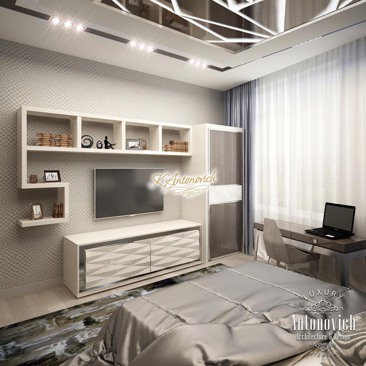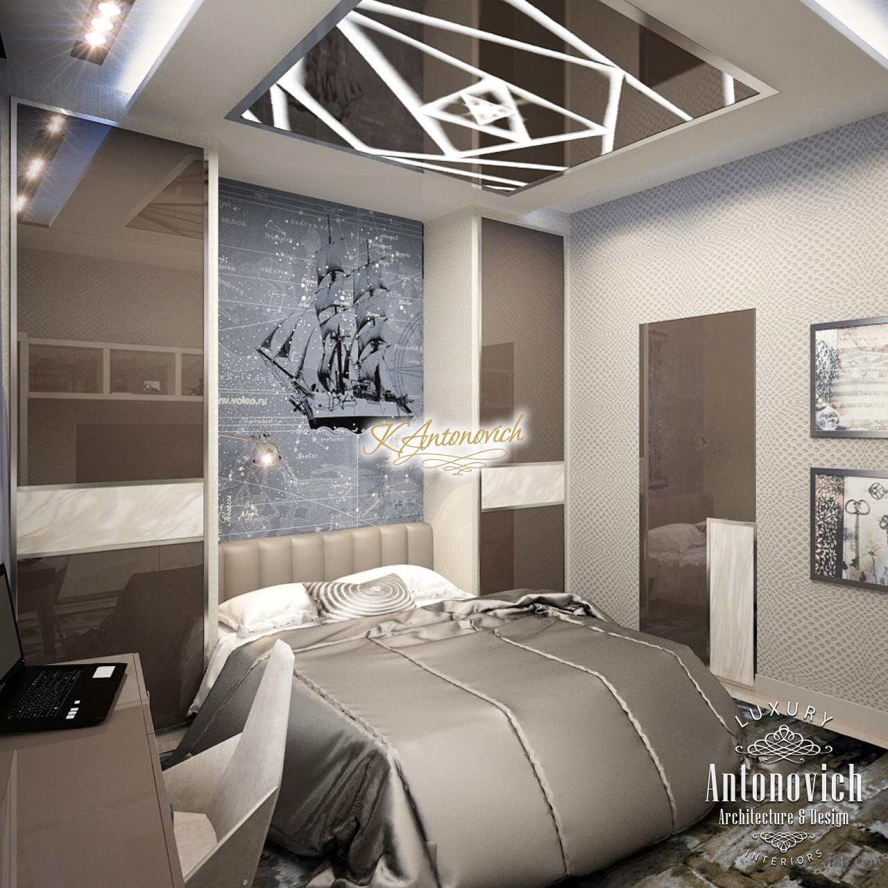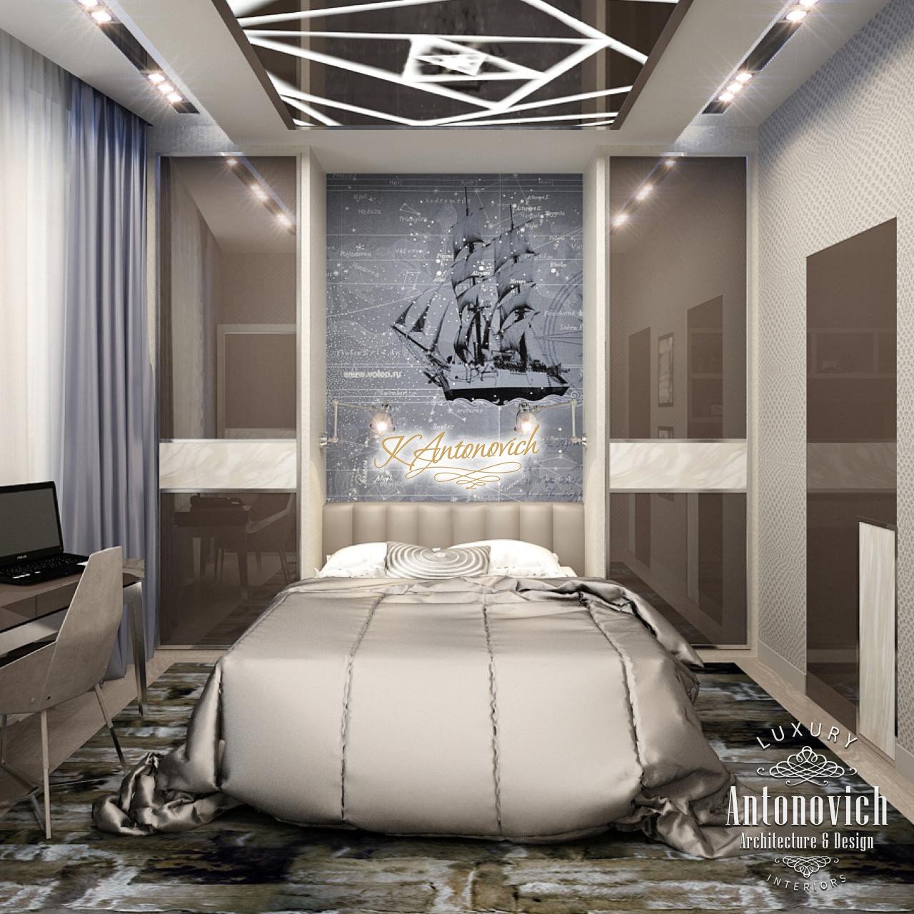 Modern style with a touch of high-tech perfectly fits for the realization of this bedroom project. This bedroom is designed for the eldest son of the owners of the apartment. And if the whole apartment interior is made in a lush and elegant Art Deco style, in the bedroom interior for the teenager designers offered to withdraw completely from the overall design concept and devote dreams and desires of the owner of the room. The interior has an expressive and dynamic character. The dynamics of the interior is set with the original ceiling design. Glossy panel with an abstract pattern is surrounded by additional ceiling lights. The outlines of a decorative element visually repeat the perimeter of the sleeping area. Comfortable bed, which is covered with silk steel shade, look stylish at the background of artistic mural on a wall with a graphic image of the ship through the star chart. The interior is dominated by a nice range of cool colors. To smooth this sensation of coolness and to complement the bedroom interior with warmth, interior designers Dubai offered for decoration natural wood floor and a large fluffy carpet. These exquisite moments of the author's project emphasize the respectability of the apartment, keeping their stylistic orientation. Bedroom interior design also has excellent functionality and ergonomics. The furniture in cream colors with glossy and voluminous façades complement the interior with bright accents. The bright colors in the decoration of the walls visually expand the space.