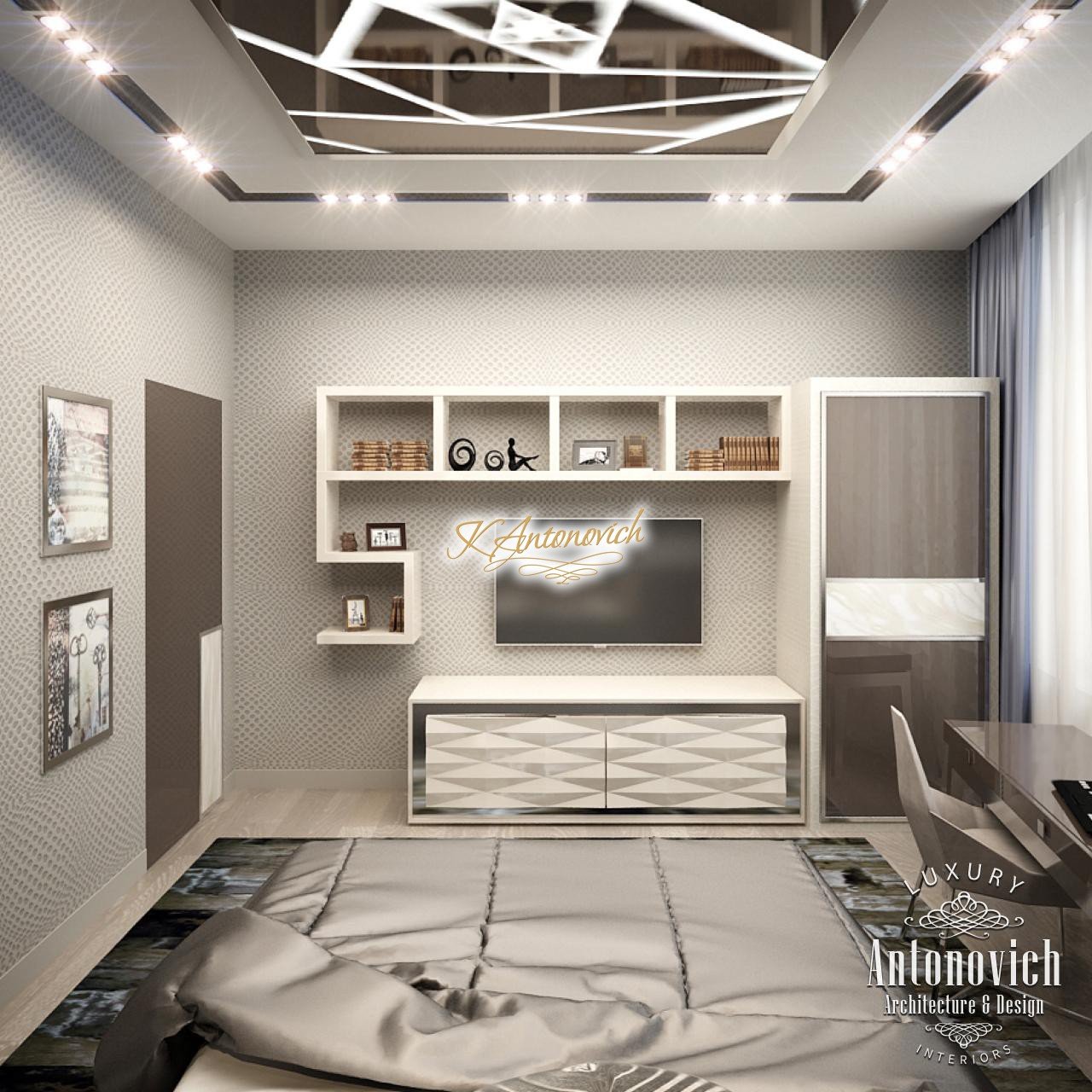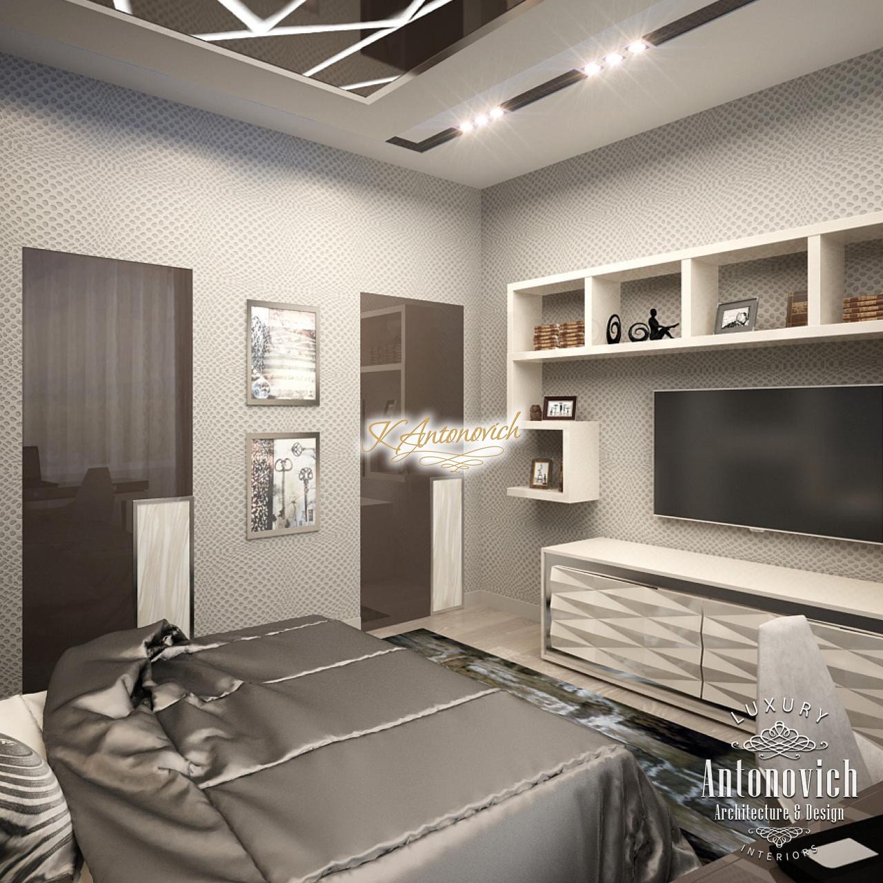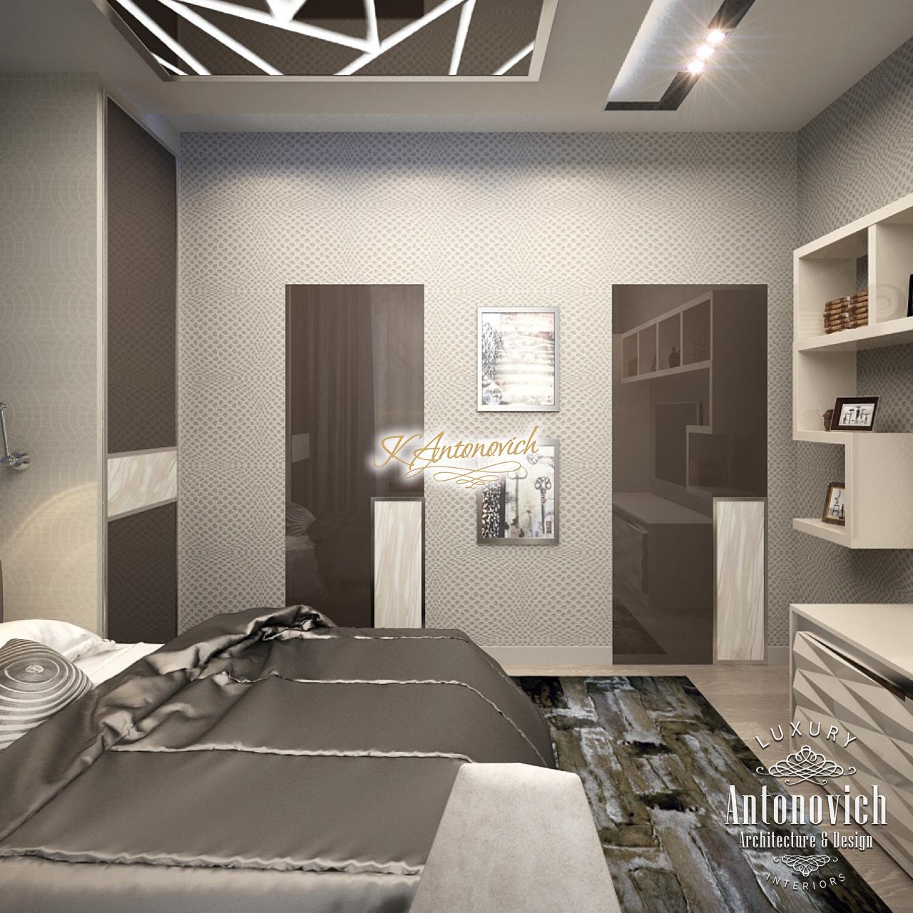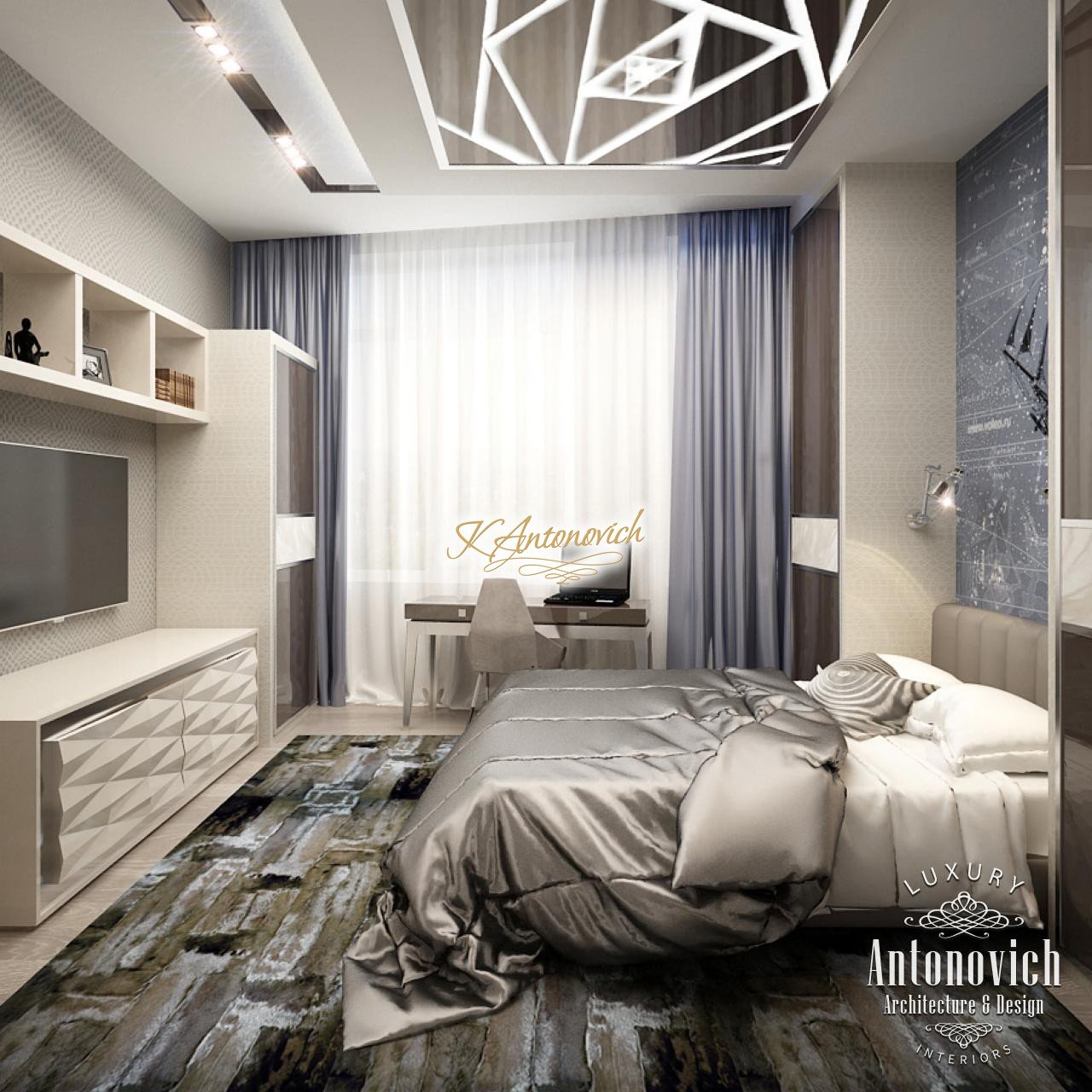 Modern style with a touch of high-tech perfectly fits for the realization of this bedroom project. This bedroom is designed for the eldest son of the owners of the apartment. And if the whole apartment interior is made in a lush and elegant Art Deco style, in the bedroom interior for the teenager designers offered to withdraw completely from the overall design concept and devote dreams and desires of the owner of the room. The interior has an expressive and dynamic character. The dynamics of the interior is set with the original ceiling design. Glossy panel with an abstract pattern is surrounded by additional ceiling lights. The outlines of a decorative element visually repeat the perimeter of the sleeping area. Comfortable bed, which is covered with silk steel shade, look stylish at the background of artistic mural on a wall with a graphic image of the ship through the star chart. The interior is dominated by a nice range of cool colors. To smooth this sensation of coolness and to complement the bedroom interior with warmth, interior designers Dubai offered for decoration natural wood floor and a large fluffy carpet. These exquisite moments of the author's project emphasize the respectability of the apartment, keeping their stylistic orientation. Bedroom interior design also has excellent functionality and ergonomics. The furniture in cream colors with glossy and voluminous façades complement the interior with bright accents. The bright colors in the decoration of the walls visually expand the space.