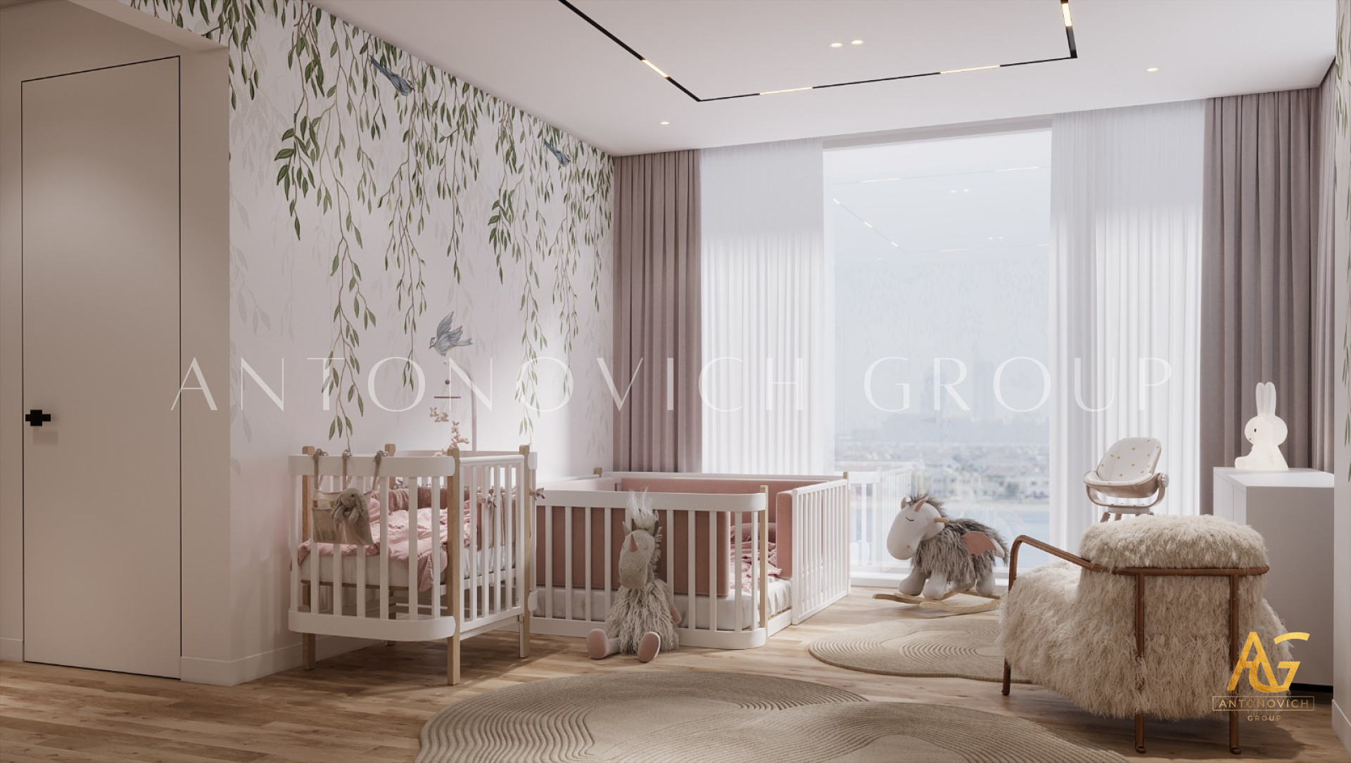 Childrens room interior design just fascinates with its gentle and comfortable image. Childrens room design is subject to certain rules and regulations as a separate direction in the studio Antonovich Group. In work on the childrens room project, we certainly consider the childs age, character traits, and hobbies. Childrens room interior design for the youngest considers the comfort zone for adults, and at this stage spend a lot of time with the child. For a luxurious and comfortable childrens room interior designers in Dubai offered a neoclassical style with an elegant and stylish touch. A nice range of shades with accents of pale yellow, green, and blue became the basis of the sunny and light mood of the childrens room interior design. The window is decorated with curtains of charming noble silk of cream shade, trimmed with a green braid. In the ceiling decoration tension element of the milky hue looks exquisite, which gently reflects the cozy space of the childrens room interior. Childrens room design also must take into account the use of noble materials. In the wall decor wallpaper of large strips in pastel colors has got an elegant and graceful look. The furniture fits perfectly into the gentle and warm mood of the interior. By the window for the comfort of adults a nice sofa, which is upholstered in milky fabric with a nice ornament in the form of small blue butterflies, is provided. The floor of natural wood is complemented by a natural carpet in a blue hue.