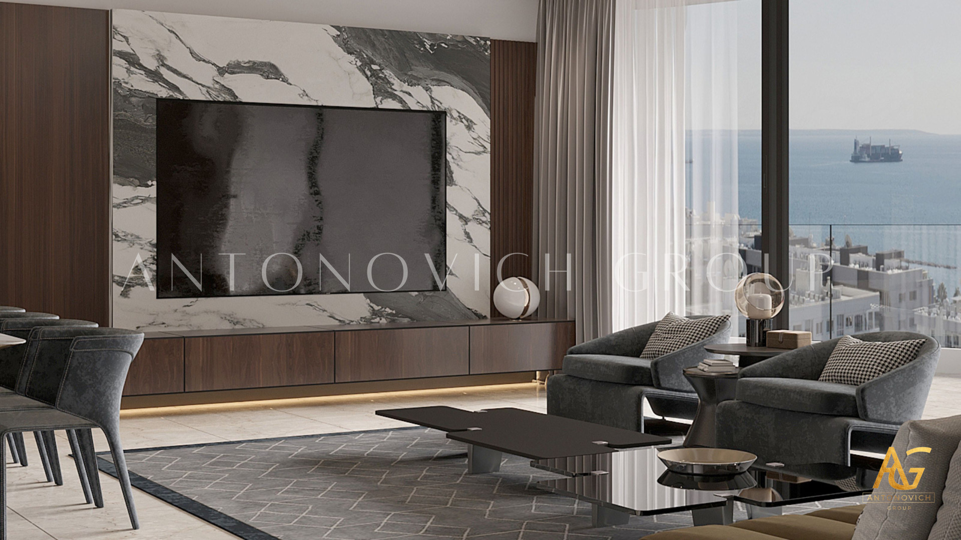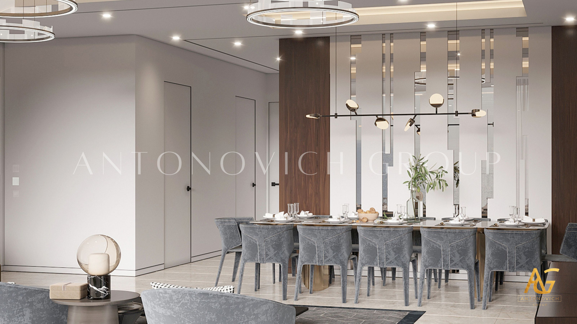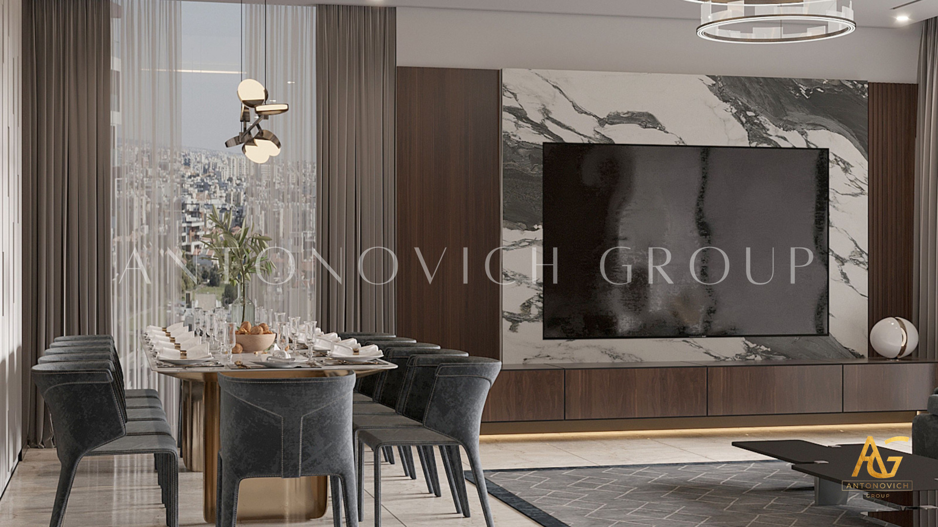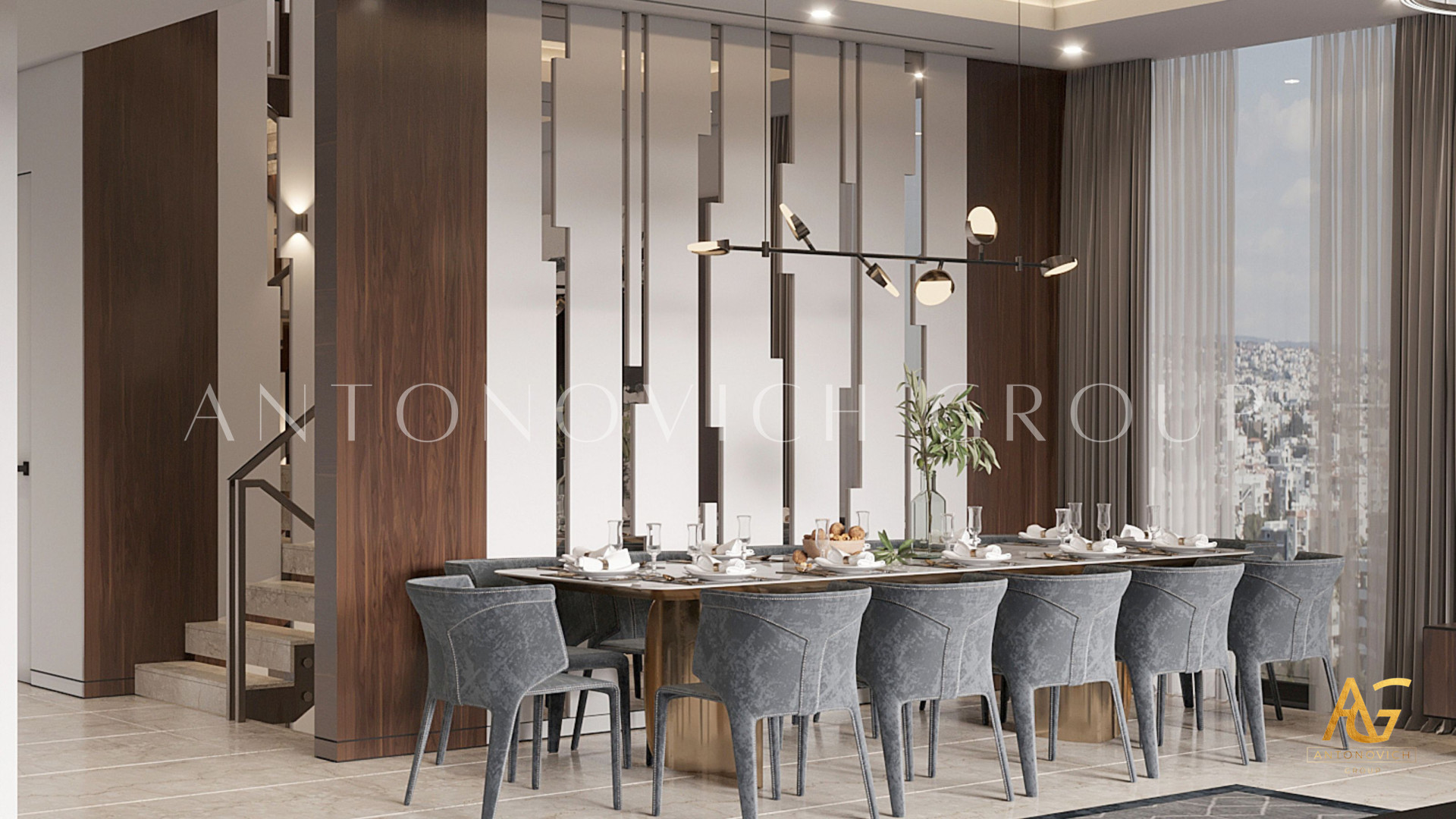 This is a grand-scale project of a luxurious residence in Dubai. The owner expressed the wish to obtain a luxurious modern interior, where comfort was elevated to the absolute value, and every detail of the interior underlines its high status and respectability. Sufficiently large apartment opened scope for creativity of designers. The main role in the story of this luxurious interior is played by round living room. The floor is decorated with precious marble with carved patterns. In the center the ceiling is decorated with a massive crystal chandelier with waterfalls of pendants. The highlight of the living room interior became large round columns in light colors. This part of the interior forms a sense of stability and grandeur. And the beginning of the delightful story is in the luxury hall interior. Floor design made of precious marble with exquisite geometric design repeats on elegant walls decor. Bright accent in the hall interior became luxurious furniture in the style of visionary. In the living room interior design the floor picks up the theme of the ceiling decoration. The semi-circular portal of windows is curtained with light curtains of precious silk in bright colors. In this picture luxury and comfort semicircular sofas upholstered in velvet milky perfectly fit. Kitchen interior look majestic and dignified. Noble marble floors and decor in the working surfaces of the interior underlines the elite status, as well as elegant furniture with carved decoration. Apartment design in the Dubai's represents the future of luxury and comfort.