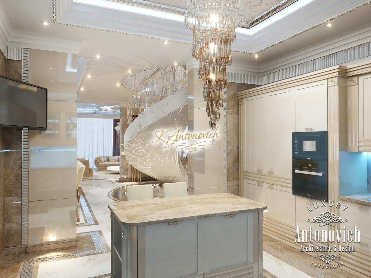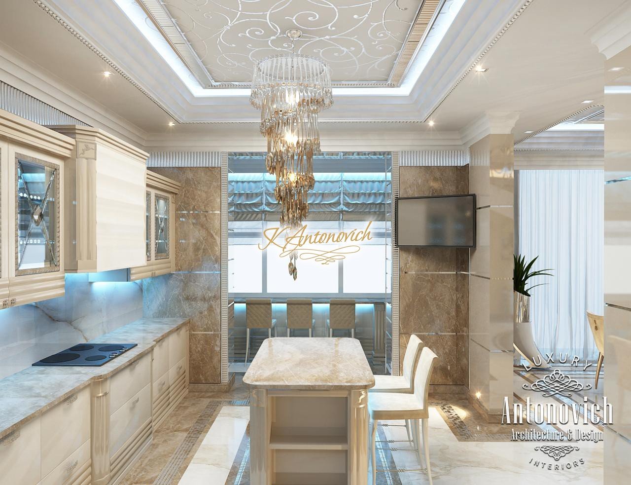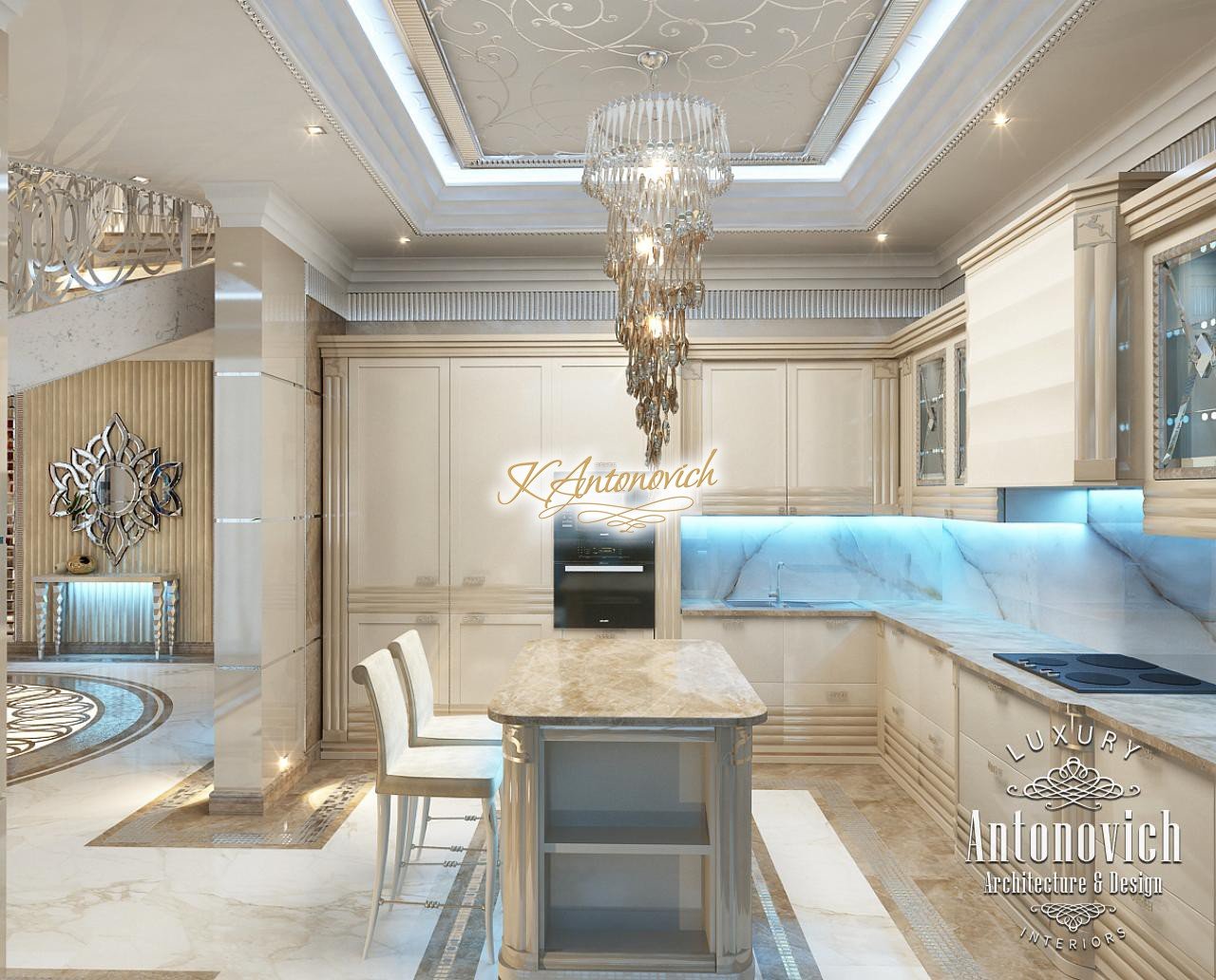 Charming and cozy tenderness and comfortable laconism of the house interior Abu Dhabi perfectly reflects the delicacy and refinement of owners. In this author's project everything is devoted to the mood, its character and idea of the perfect interior. Luxury kitchen starts with entrance portal at the beginning of the stairs. A graceful staircase that at the end is decorated with lace tender patterns became the beginning of a beautiful interior story that was told in the author's project by interior designers Dubai. And part of the story was the cozy interior of the spacious kitchen. Entrance to the kitchen is decorated with mirror panels. The space itself is dominated by a light cream-colored shades, which look stylish with catchy lines of blue lights. The villa design Abu Dhabi has a wonderful combination of modern style and festive accents in the spirit of Art Deco. The same trend is observed in the kitchen interior. Elegant chandelier with flowing waterfalls, crystal pendants and gilded drops became the main focus here. Natural marble on the floor and work surfaces underline the elite status of the interior and complement its practical functionality. Interior Designers Dubai perfectly organized space and filled it with all the necessary elements in the form of modern storage systems and modern kitchen appliances.