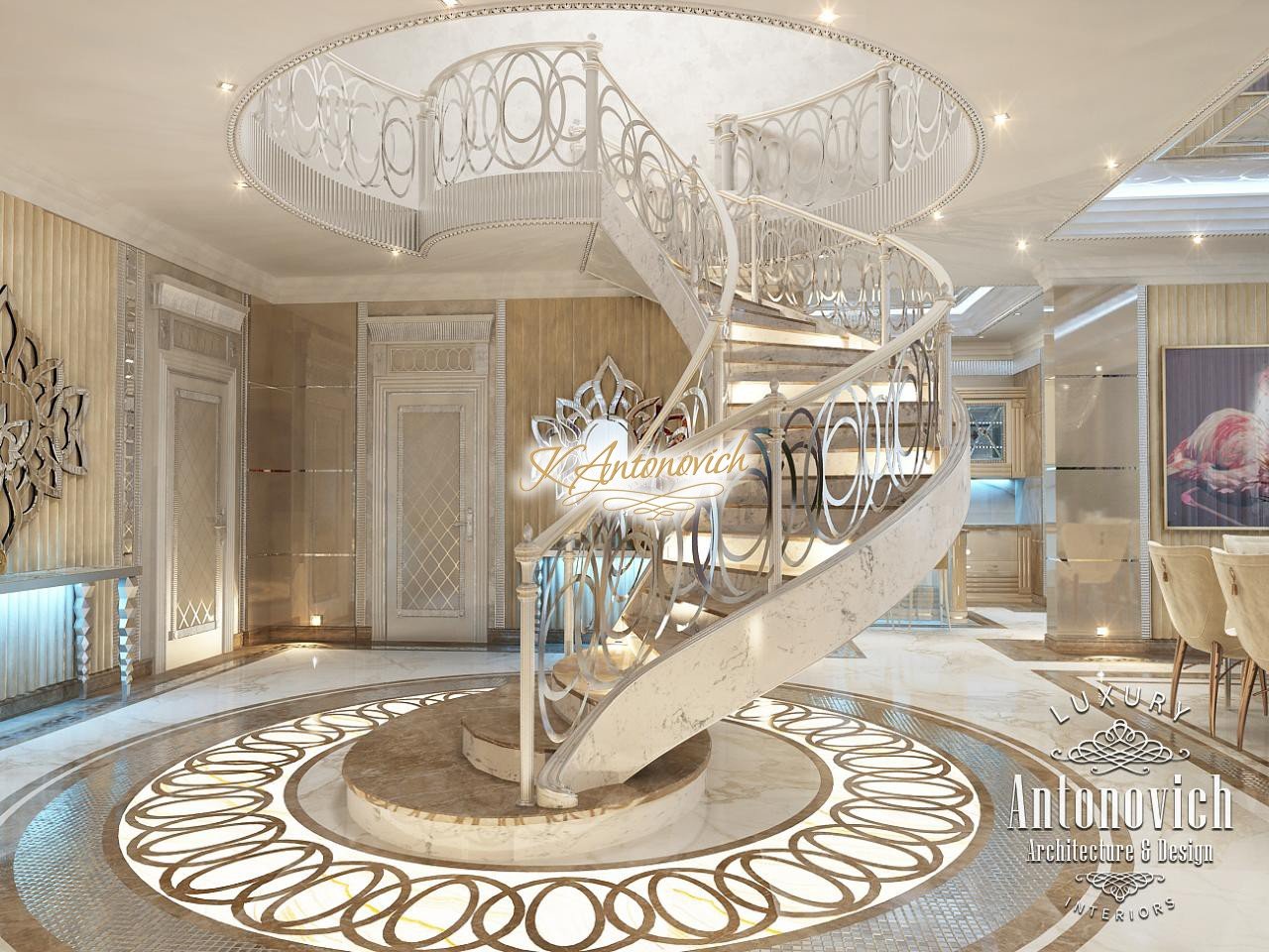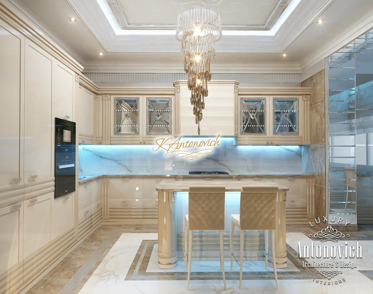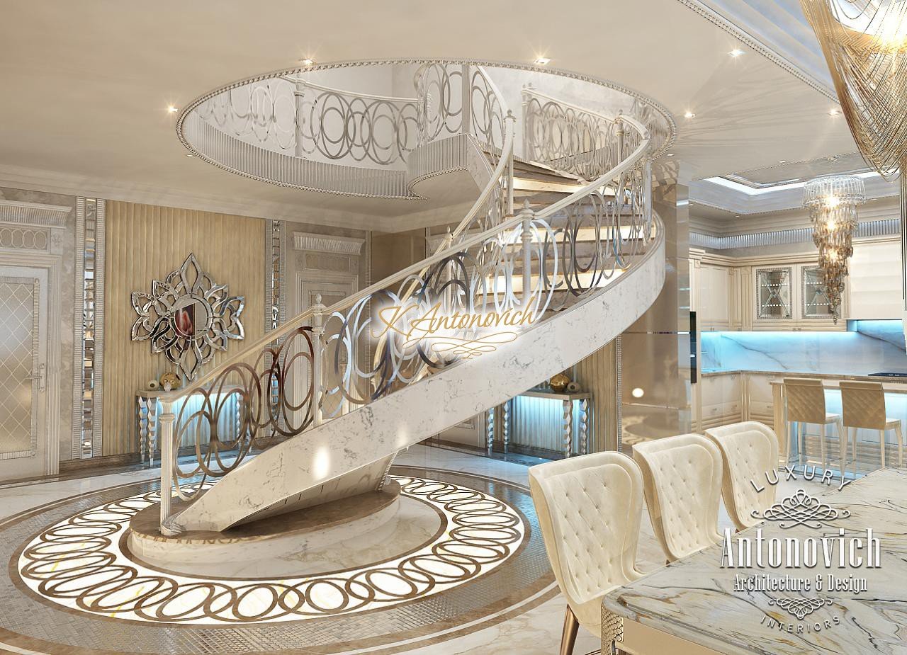 Charming and cozy tenderness and comfortable laconism of the house interior Abu Dhabi perfectly reflects the delicacy and refinement of owners. In this author's project everything is devoted to the mood, its character and idea of the perfect interior. Luxury kitchen starts with entrance portal at the beginning of the stairs. A graceful staircase that at the end is decorated with lace tender patterns became the beginning of a beautiful interior story that was told in the author's project by interior designers Dubai. And part of the story was the cozy interior of the spacious kitchen. Entrance to the kitchen is decorated with mirror panels. The space itself is dominated by a light cream-colored shades, which look stylish with catchy lines of blue lights. The villa design Abu Dhabi has a wonderful combination of modern style and festive accents in the spirit of Art Deco. The same trend is observed in the kitchen interior. Elegant chandelier with flowing waterfalls, crystal pendants and gilded drops became the main focus here. Natural marble on the floor and work surfaces underline the elite status of the interior and complement its practical functionality. Interior Designers Dubai perfectly organized space and filled it with all the necessary elements in the form of modern storage systems and modern kitchen appliances.