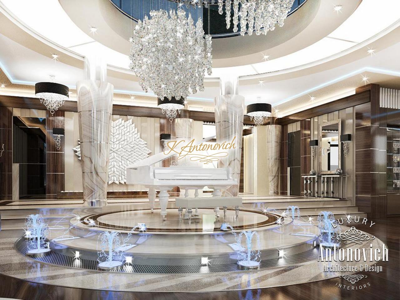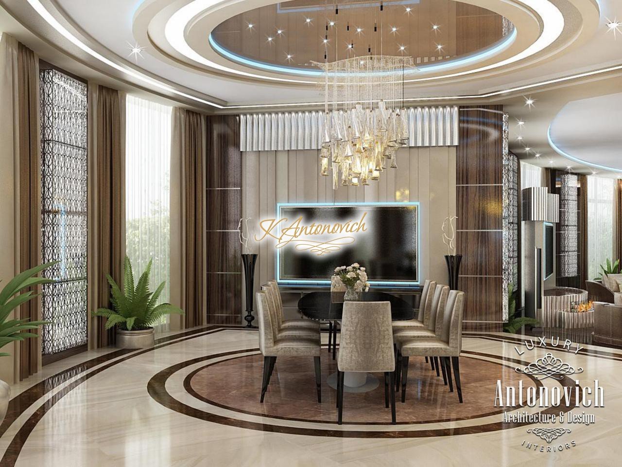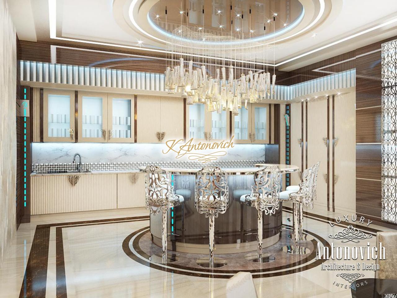 Modern style and art deco elegantly intertwined in the author's project of the apartment interior in Dubai. Luxury of the next er a, which is created by interior designers of Luxury Antonovich Design, is elegance, splendor and the birth of a new style in interior design. Kitchen Design Dubai is full of spectacular unique solutions. Authors of the project design delicately picked up the motifs of the living room and transfered them to the kitchen interior. The decor of the ceiling admires. The original author chandelier is made of crystal pendants of the thinnest wires. Beautiful illusion of weightlessness makes this part of kitchen interior completely unique. The chandelier is surrounded by a circular niche with a line of soft blue light and a stretch element of chocolate hue. The ceiling decor motifs picks floors decor. Circle of the correct form of carved marble of brown shade outlines the semicircular bar. The highlight of the interior became high chairs with carved lace backs. In the wall decor interior designers Dubai used wood of valuable species, which is covered with varnish. Against this background exquisite kitchen facades of creamy with exquisite hardware elements look a charming contrast. Kitchen Design Dubai elegantly and succinctly fits into the interior of the luxury apartment. Design project of the apartment underlines respectability and originality of the owner.