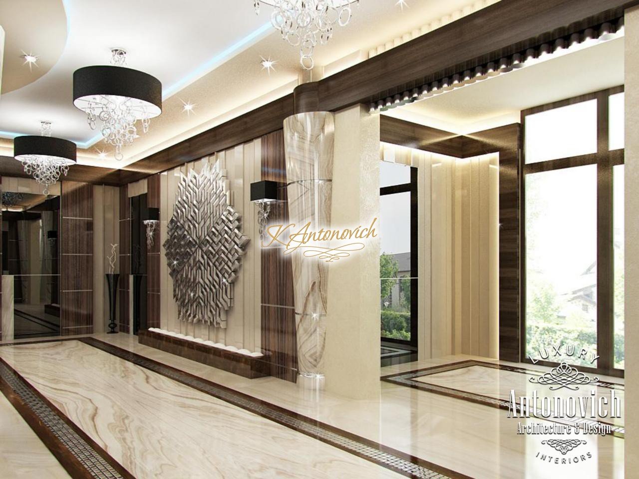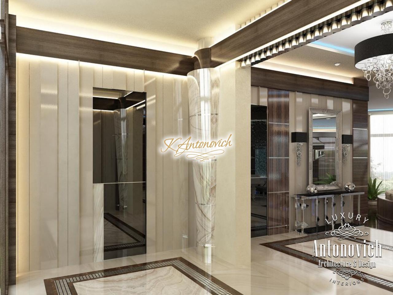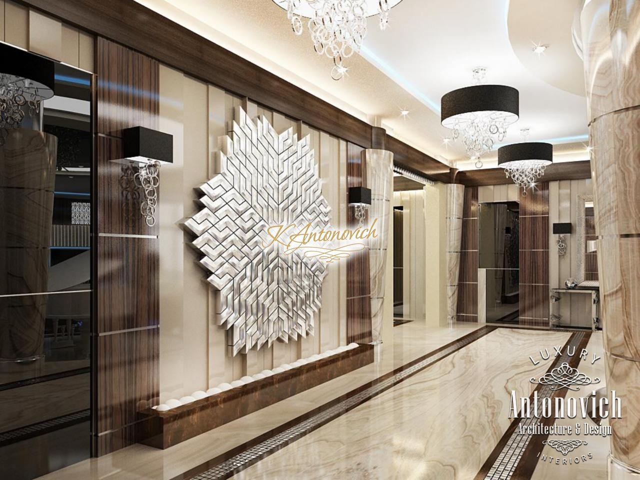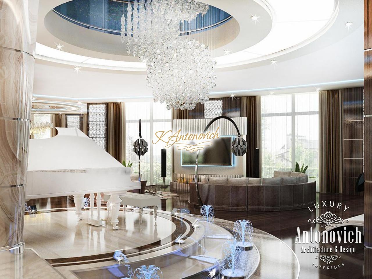 Modern style and art deco elegantly intertwined in the author's project of the apartment interior in Dubai. Luxury of the next er a, which is created by interior designers of Luxury Antonovich Design, is elegance, splendor and the birth of a new style in interior design. Kitchen Design Dubai is full of spectacular unique solutions. Authors of the project design delicately picked up the motifs of the living room and transfered them to the kitchen interior. The decor of the ceiling admires. The original author chandelier is made of crystal pendants of the thinnest wires. Beautiful illusion of weightlessness makes this part of kitchen interior completely unique. The chandelier is surrounded by a circular niche with a line of soft blue light and a stretch element of chocolate hue. The ceiling decor motifs picks floors decor. Circle of the correct form of carved marble of brown shade outlines the semicircular bar. The highlight of the interior became high chairs with carved lace backs. In the wall decor interior designers Dubai used wood of valuable species, which is covered with varnish. Against this background exquisite kitchen facades of creamy with exquisite hardware elements look a charming contrast. Kitchen Design Dubai elegantly and succinctly fits into the interior of the luxury apartment. Design project of the apartment underlines respectability and originality of the owner.