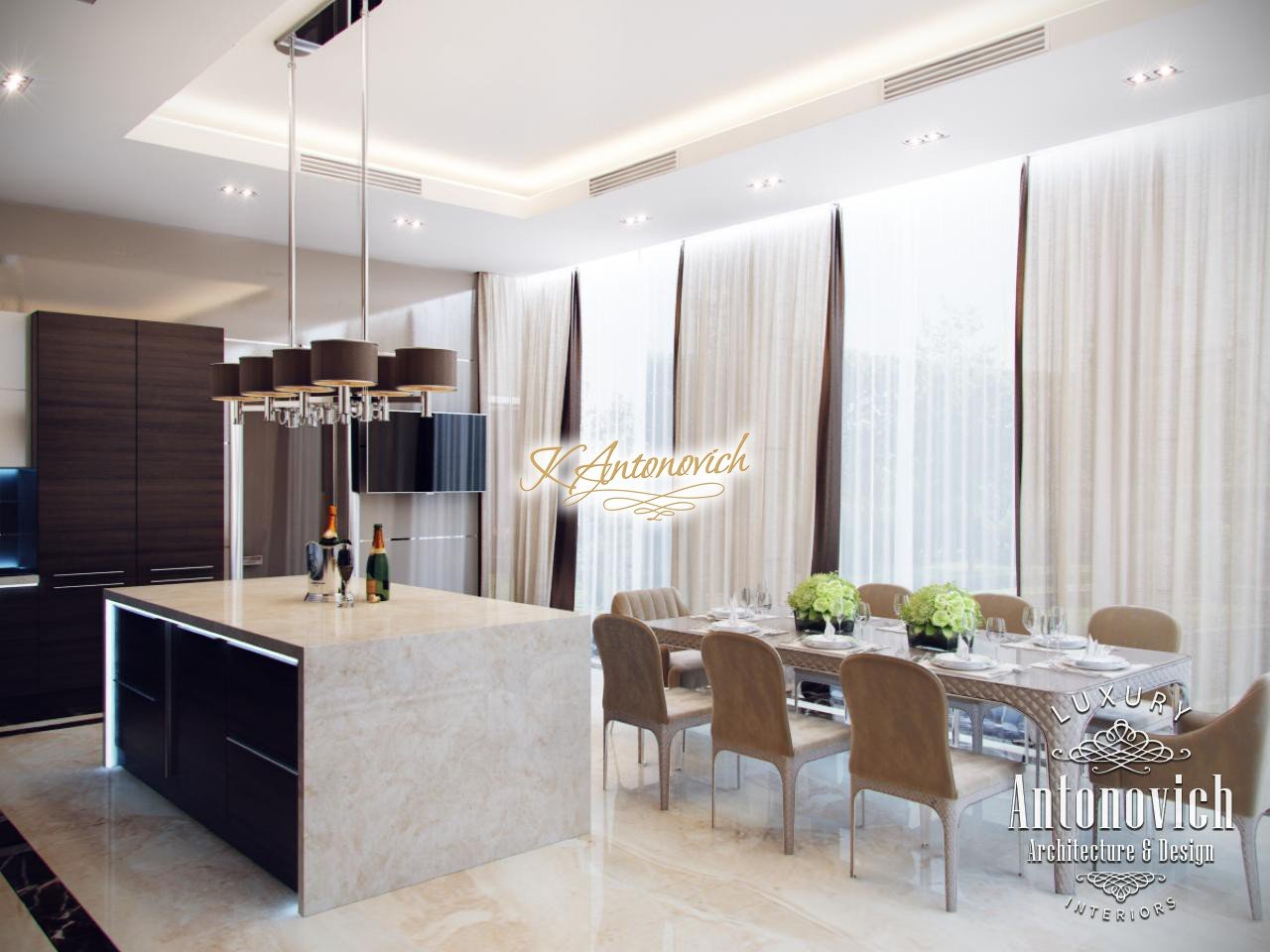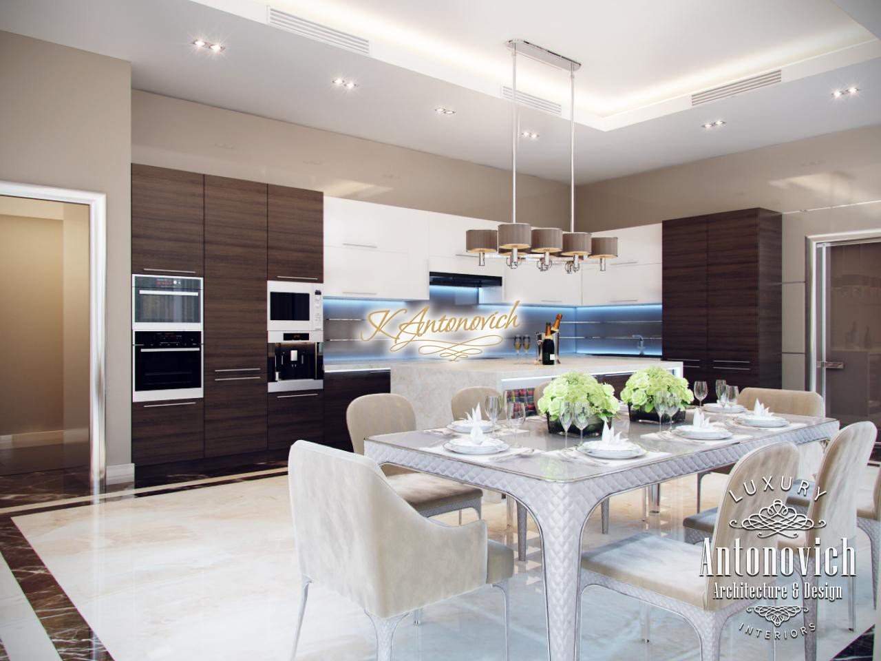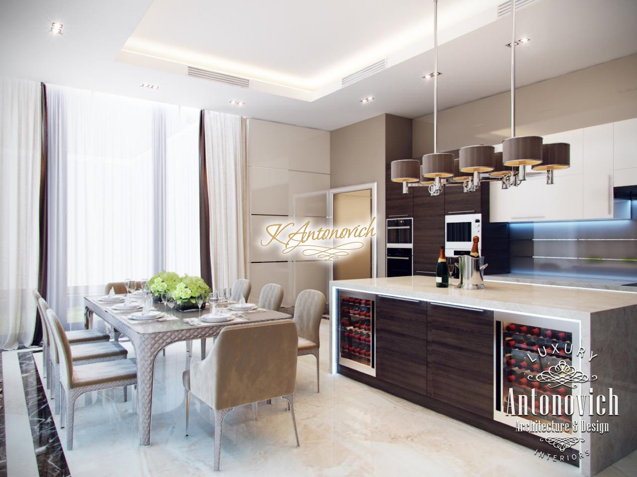 Kitchen interior design in a modern style has a light and airy character. Interior Designers Dubai brilliantly arranged the space in the house, which has been allocated to the kitchen and dining area. Modern style with bright accents of minimalism inherent in this cozy interior. Kitchen furniture succinctly and adequately emphasizes the respectability of the interior. Facades of natural wood elements are underlined with decoration of polished stainless steel. The clean lines of the interior are incredibly harmonious. Ceiling is outlined with rectangle niche with fitted modern ceiling lights. Interior Designers Dubai used two shades, milk and brown, using this combination in the decoration of windows and furniture design. A large window is draped with curtains of milky silk, which is edged by a strip of brown silk. In a cozy and harmonious space a spacious dining area fits easily. The large dining table is surrounded by high upholstered chairs. Cozy mood is complemented with author chandelier in a modern style, which defines the center of the dining area. Kitchen interior design also has great functionality. Everything here is very convenient and comfortable. Using modern technology, interior designers Dubai achieved the absolute comfort. The kitchen has become the perfect reflection of the perception of reality and the welcoming nature of the owners of the apartment in Dubai.