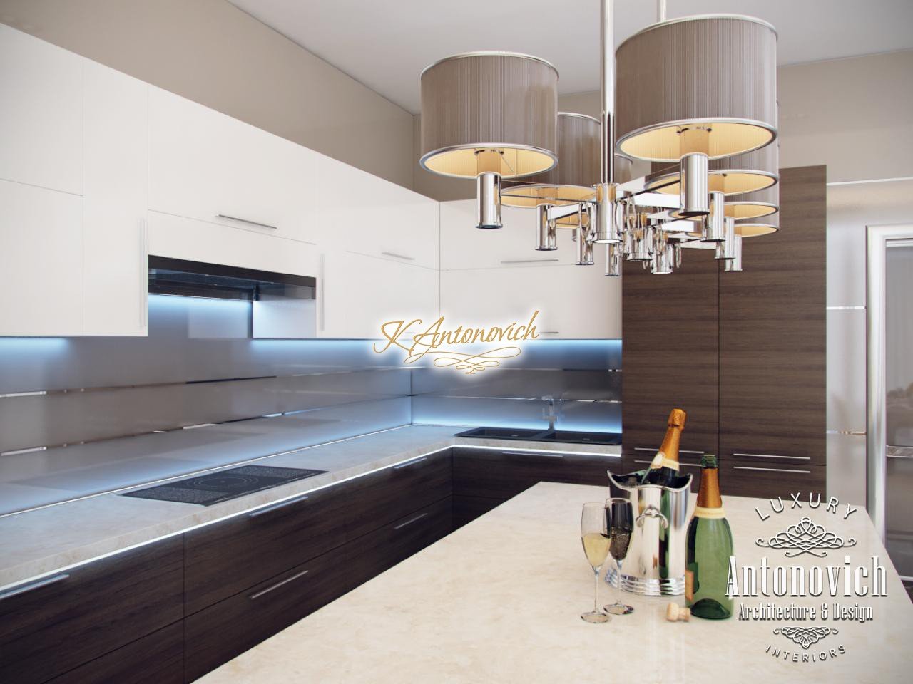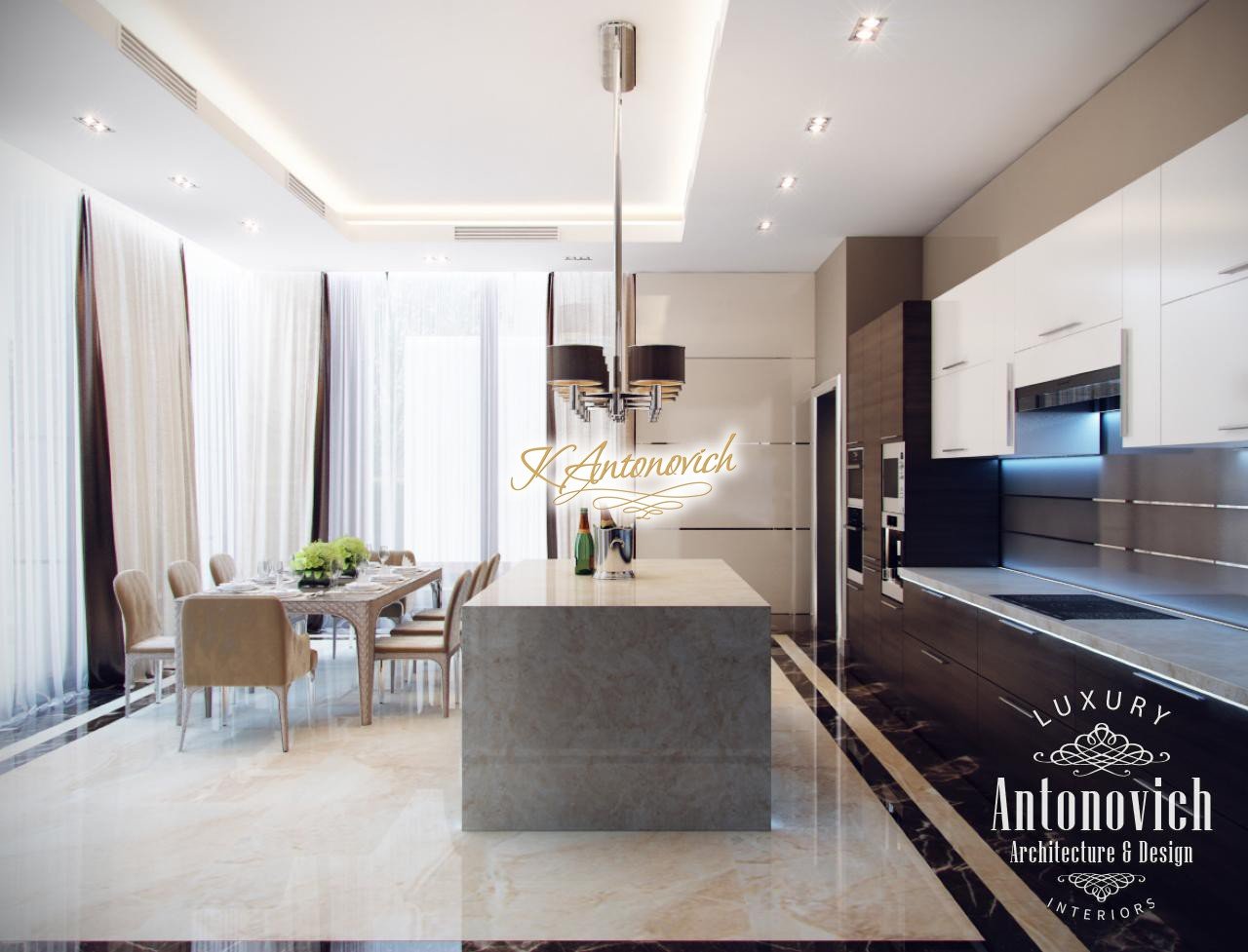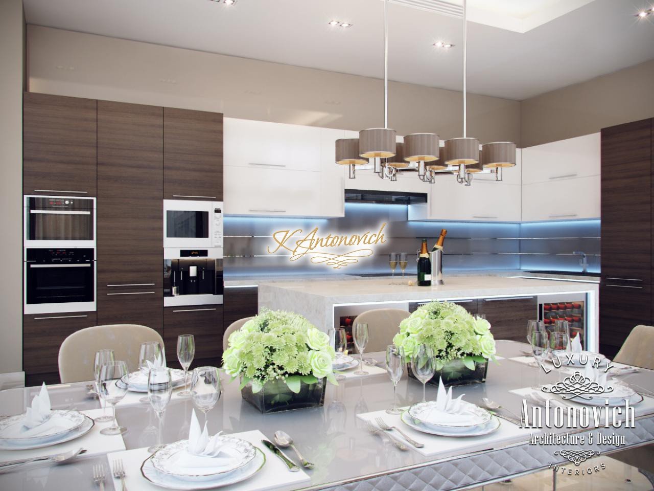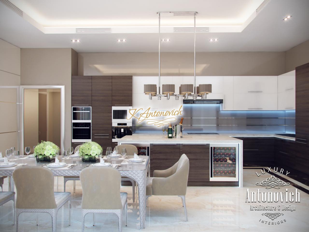 Kitchen interior design in a modern style has a light and airy character. Interior Designers Dubai brilliantly arranged the space in the house, which has been allocated to the kitchen and dining area. Modern style with bright accents of minimalism inherent in this cozy interior. Kitchen furniture succinctly and adequately emphasizes the respectability of the interior. Facades of natural wood elements are underlined with decoration of polished stainless steel. The clean lines of the interior are incredibly harmonious. Ceiling is outlined with rectangle niche with fitted modern ceiling lights. Interior Designers Dubai used two shades, milk and brown, using this combination in the decoration of windows and furniture design. A large window is draped with curtains of milky silk, which is edged by a strip of brown silk. In a cozy and harmonious space a spacious dining area fits easily. The large dining table is surrounded by high upholstered chairs. Cozy mood is complemented with author chandelier in a modern style, which defines the center of the dining area. Kitchen interior design also has great functionality. Everything here is very convenient and comfortable. Using modern technology, interior designers Dubai achieved the absolute comfort. The kitchen has become the perfect reflection of the perception of reality and the welcoming nature of the owners of the apartment in Dubai.