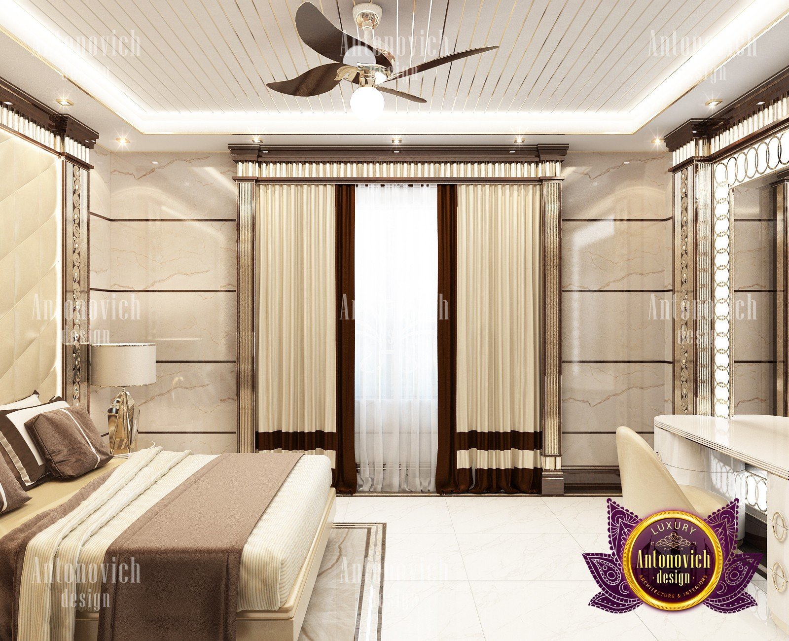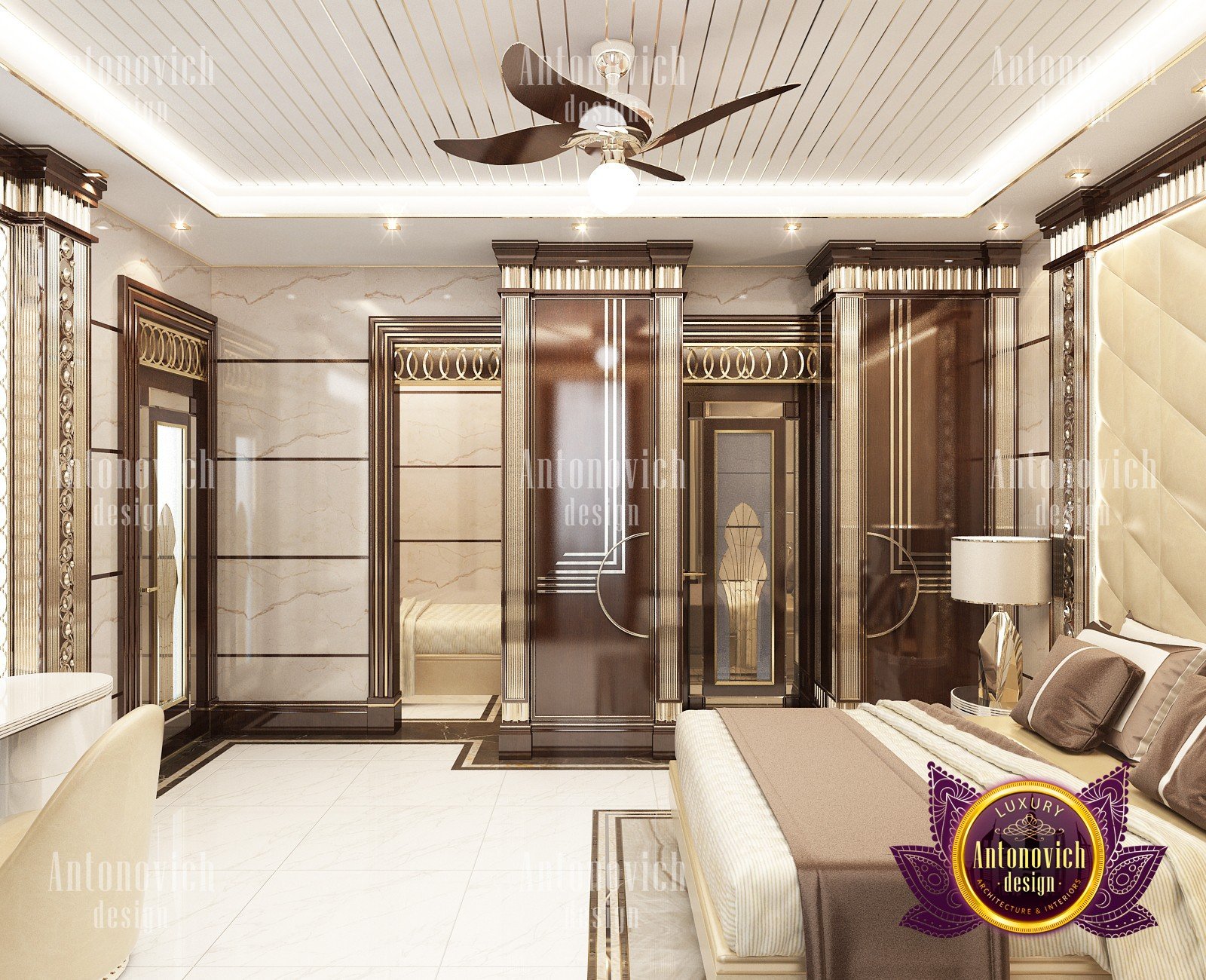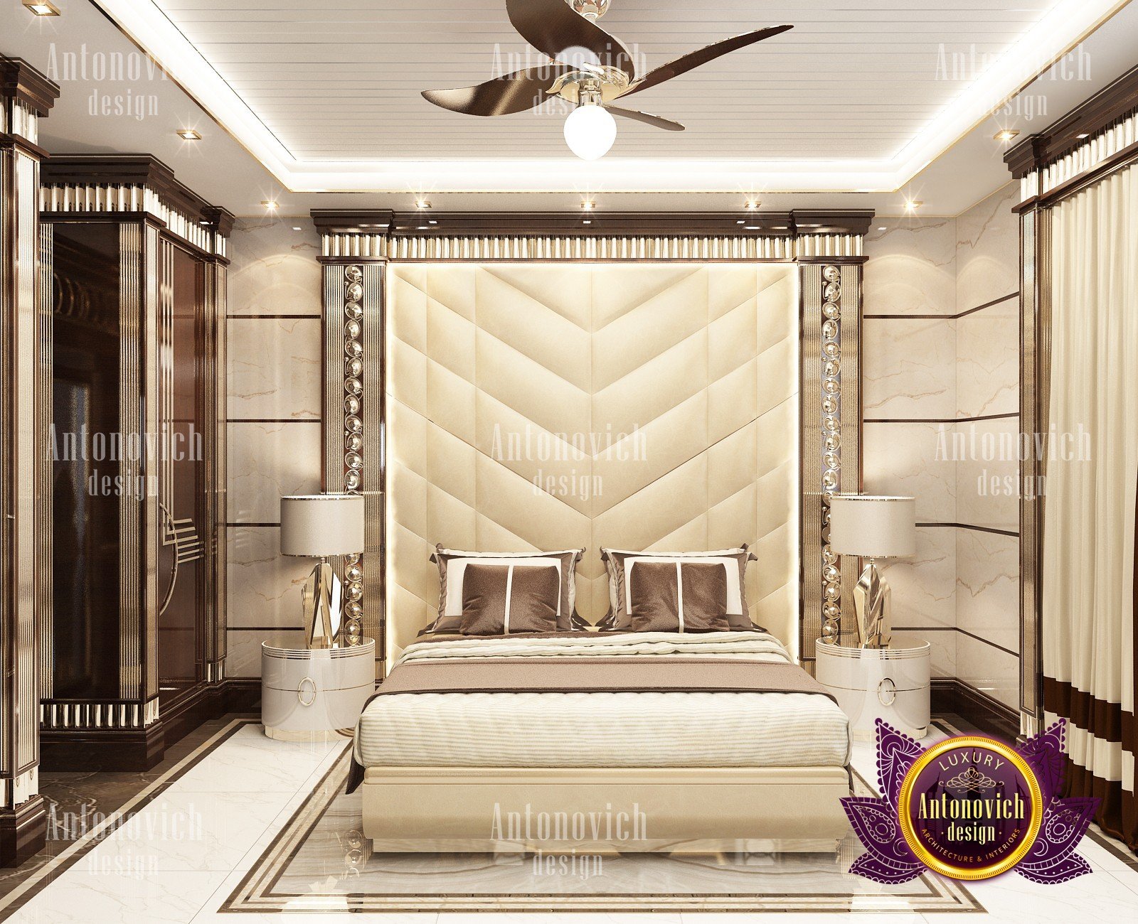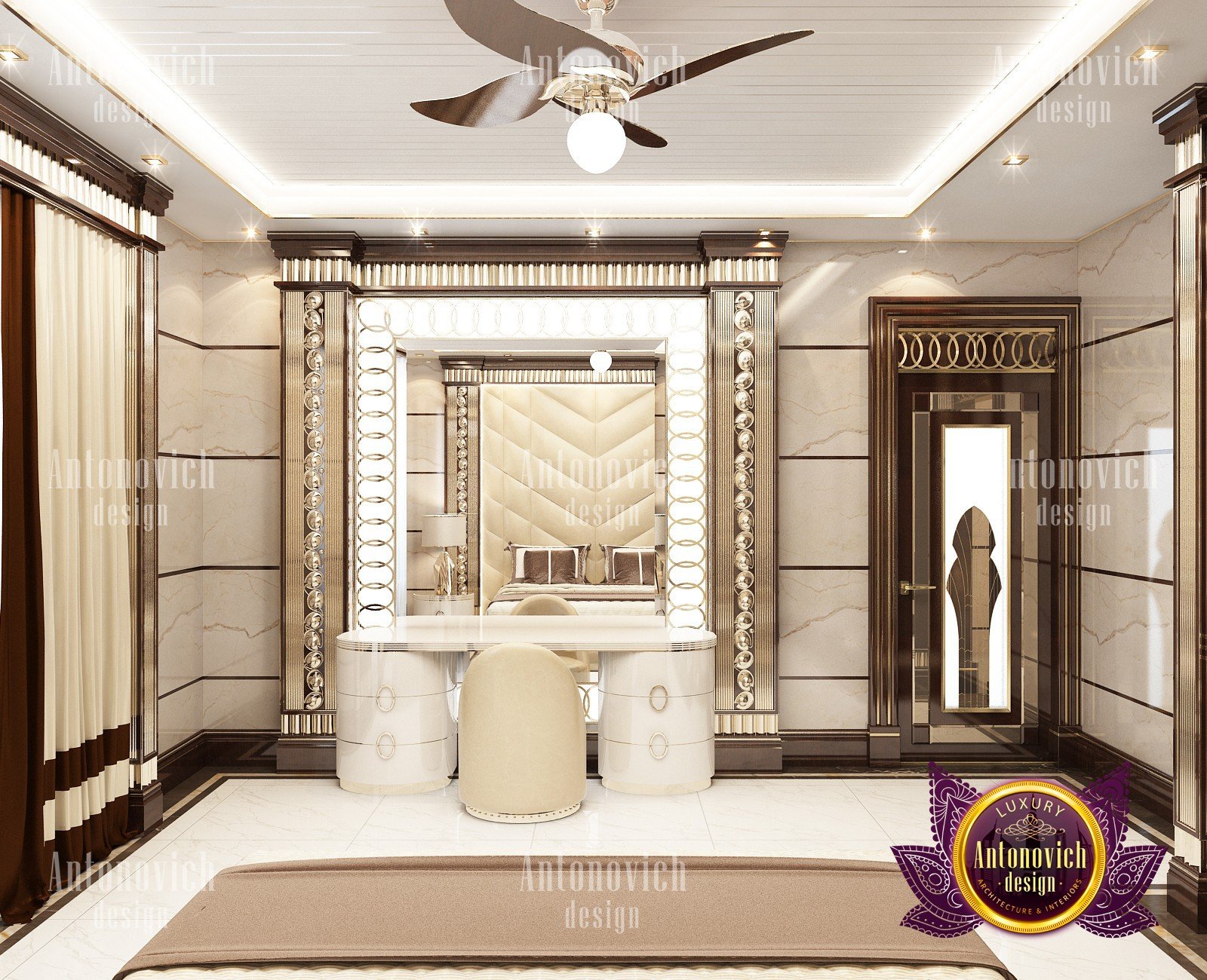 When the dreams of our customers take on very specific forms of luxurious interiors, it brings a sense of happiness and joy, both for customers and for us. We give all our talent, experience and inspiration to create the perfect environment in which everything is dedicated to the comfort of homeowners. Luxurious bedroom design is full of moments of beauty and unique accents. Villa Design Dubai is in the style of modern classics with a light oriental overtones and elegant touches of Art Deco. Masterfully combining traditions of styles and adding to each of them novelty and improvisation, interior designers create projects of luxury homes, never happen again. The integrity of the image of the luxury bedroom interior is based on the consistency of shades of gold and turquoise. The highlight of the interior design was the ceiling. Niche in the form of a dome with the outline of a large flower from the inside is completely covered with gold leaf. Against this background luxury crystal chandelier shines, which is complemented with small spotlights of similar configuration. Houses Design Dubai fully reflects the high status and respectability of homeowners. And this applies to the interior of one of the bedrooms. Luxury ceiling is outlined with a wide molding with exquisite gilded stucco wave. The elegant ceiling design is continued in no less elegant wall decorations. Textile panel of turquoise velvet is wonderfully combined with half-columns with refined capitals. The combination of creamy, gold and turquoise filled the interior with bright colors.