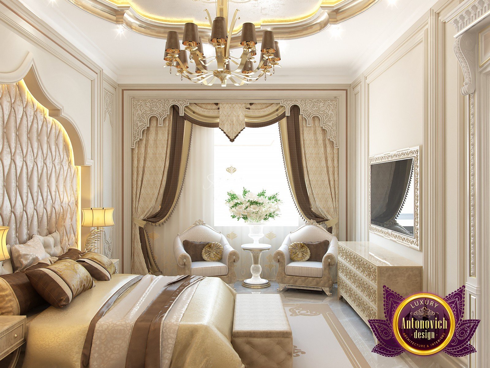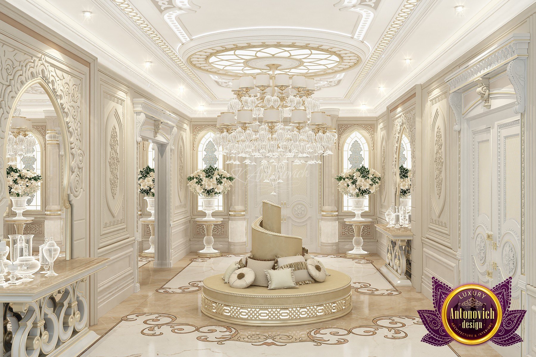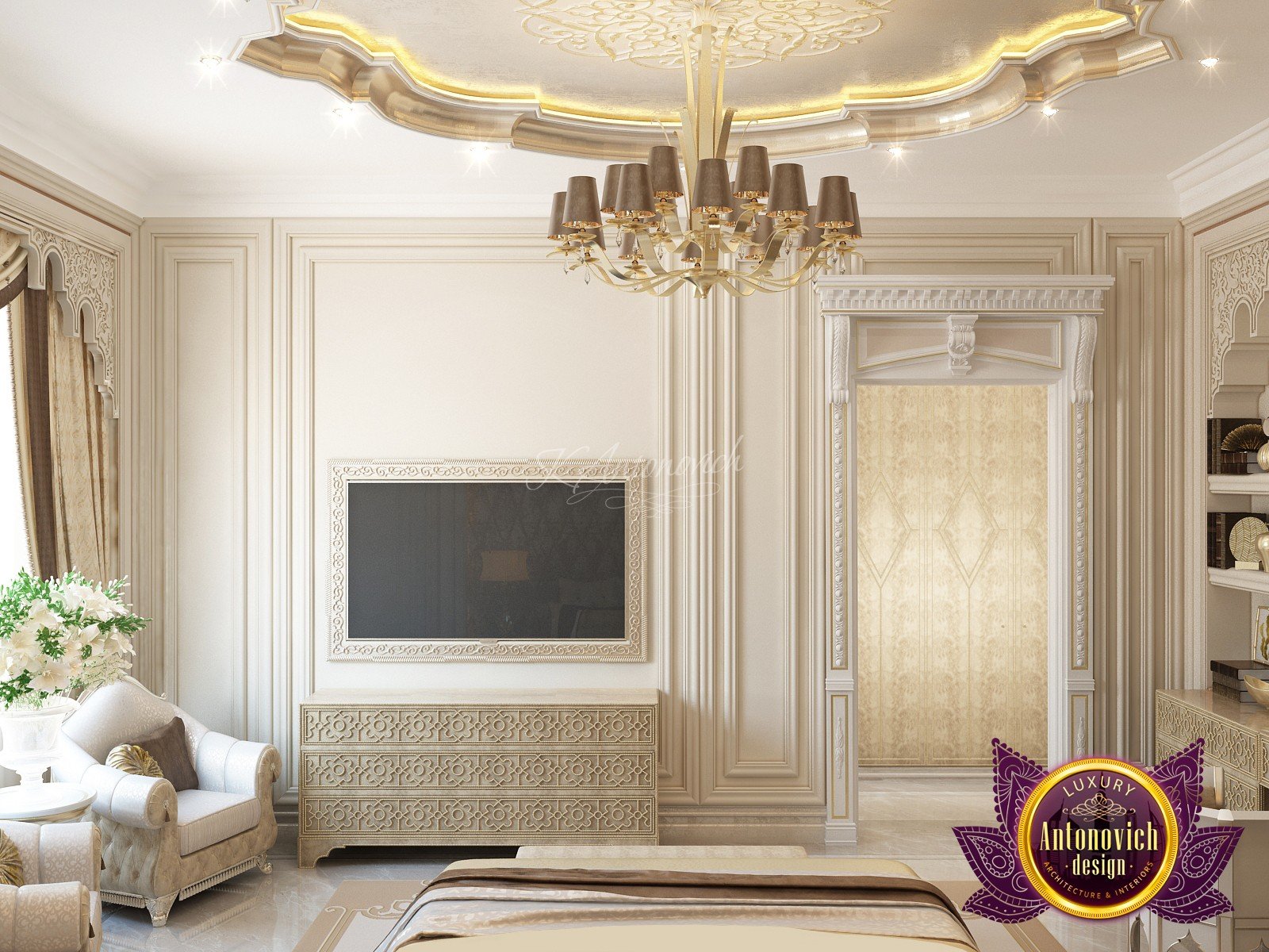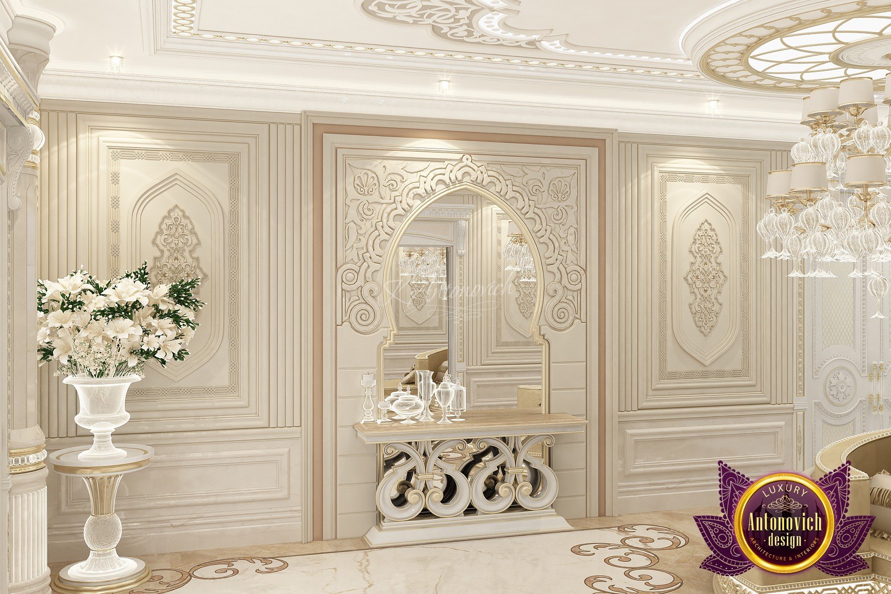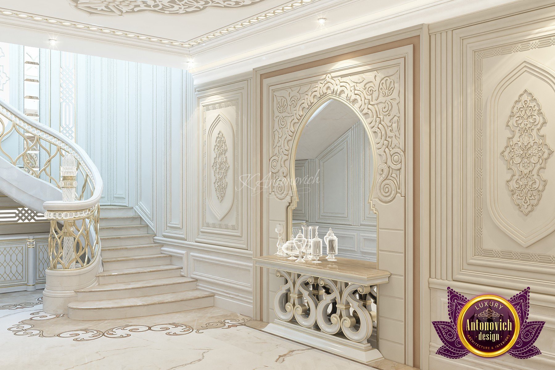 Modern villa design from Luxury Antonovich Design expresses the real passion and nobility of palace luxury. And every square centimeter of the project has got a profound meaning. Every touch is a part of a unified image of the interior. The artistic expression is based on a smart combination of colors, materials, and textures. A hall meets with a mood of life celebration. The marble expanse is decorated with exquisite carvings. The stair portal is decorated with a magnificent bas-relief with a romantic image of Venice. The ceilings are adorned with stucco with a texture of silk velvet and completed with beautiful stucco. As well as chandeliers and lighting lines. From the first moments of your stay in the house, you realize that the owners have great taste and appreciate art. A console table with gracefully curved legs complemented by a beautiful picture in a massive carved frame with gold. In the living room interior, in creamy-gold colors, looks fantastic furniture upholstered in dark purple velvet and elegant classic curtains look beautiful. The doors of dark wood of valuable species, which is inlaid with the gold carved decor, look nice. To visually enlarge the space and enhance the shine of luxury, the interior designers use such element as mirror panels with bevel. The festive atmosphere is present in all rooms. A cozy kitchen with luxury furniture looks very decent and respectable. Master Bedroom with a luxury bed looks especially majestic.