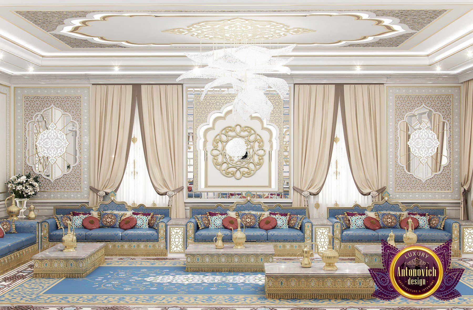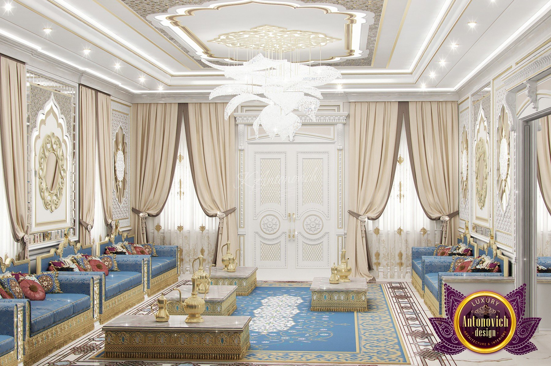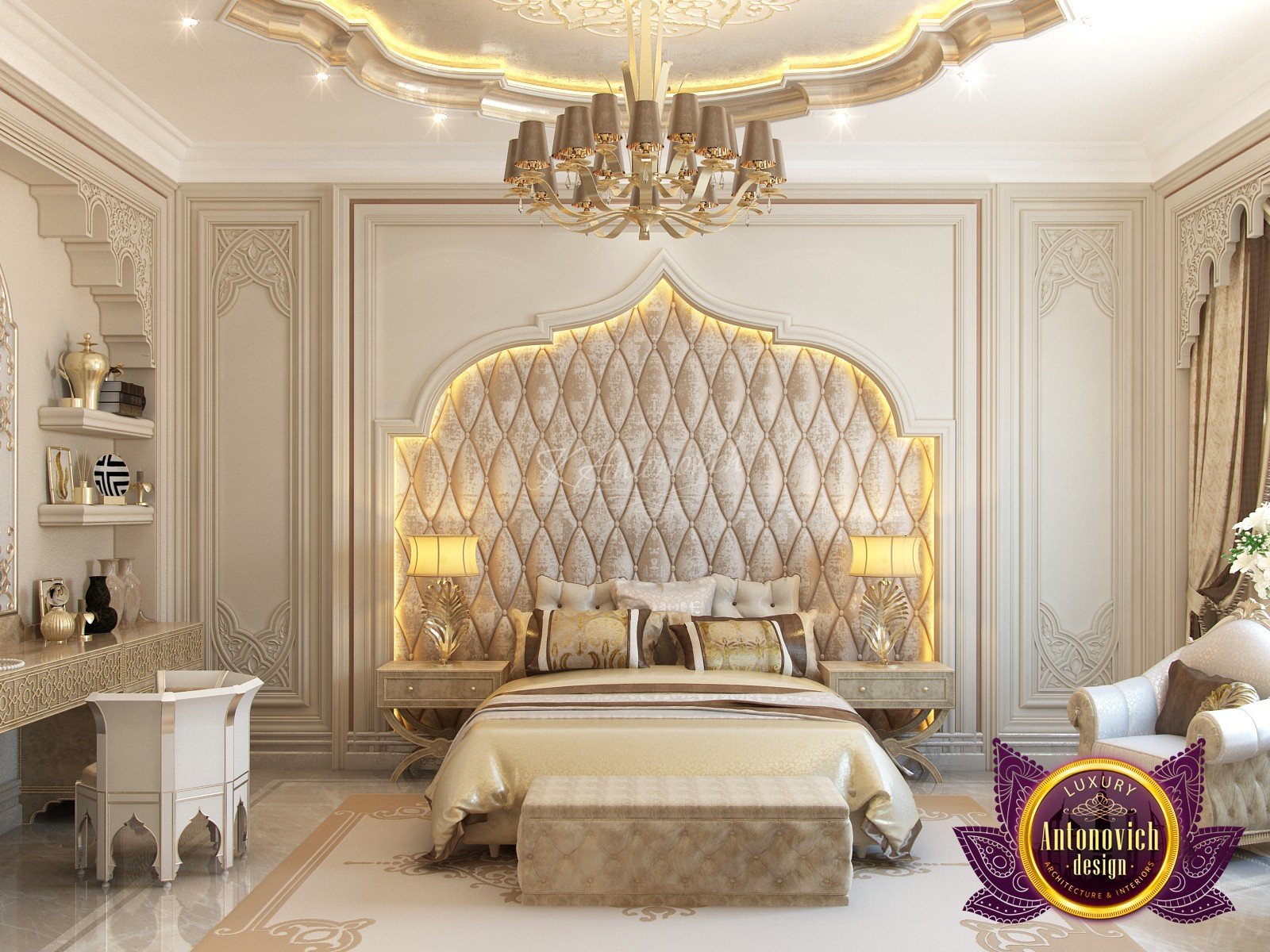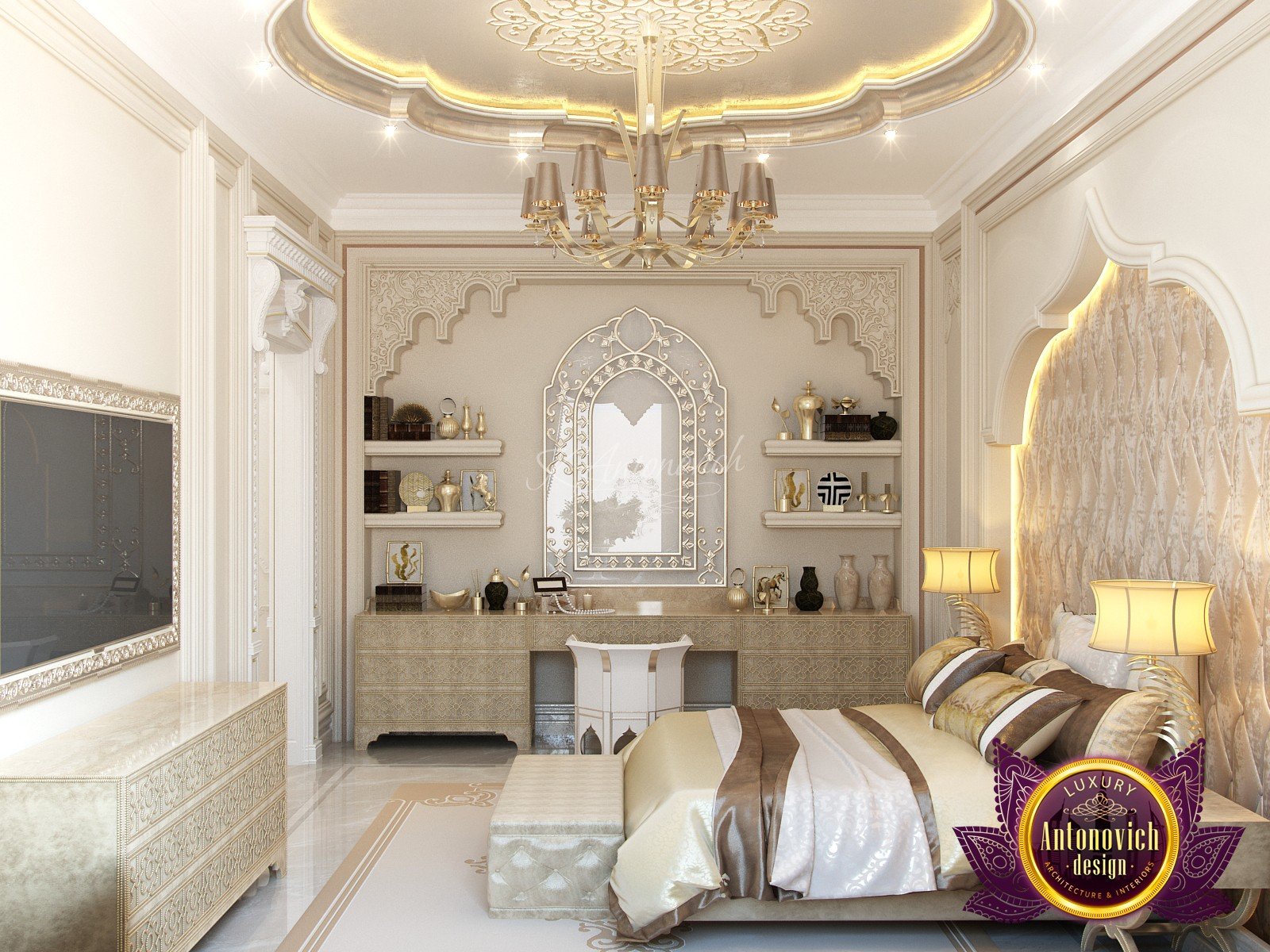 Modern villa design from Luxury Antonovich Design expresses the real passion and nobility of palace luxury. And every square centimeter of the project has got a profound meaning. Every touch is a part of a unified image of the interior. The artistic expression is based on a smart combination of colors, materials, and textures. A hall meets with a mood of life celebration. The marble expanse is decorated with exquisite carvings. The stair portal is decorated with a magnificent bas-relief with a romantic image of Venice. The ceilings are adorned with stucco with a texture of silk velvet and completed with beautiful stucco. As well as chandeliers and lighting lines. From the first moments of your stay in the house, you realize that the owners have great taste and appreciate art. A console table with gracefully curved legs complemented by a beautiful picture in a massive carved frame with gold. In the living room interior, in creamy-gold colors, looks fantastic furniture upholstered in dark purple velvet and elegant classic curtains look beautiful. The doors of dark wood of valuable species, which is inlaid with the gold carved decor, look nice. To visually enlarge the space and enhance the shine of luxury, the interior designers use such element as mirror panels with bevel. The festive atmosphere is present in all rooms. A cozy kitchen with luxury furniture looks very decent and respectable. Master Bedroom with a luxury bed looks especially majestic.