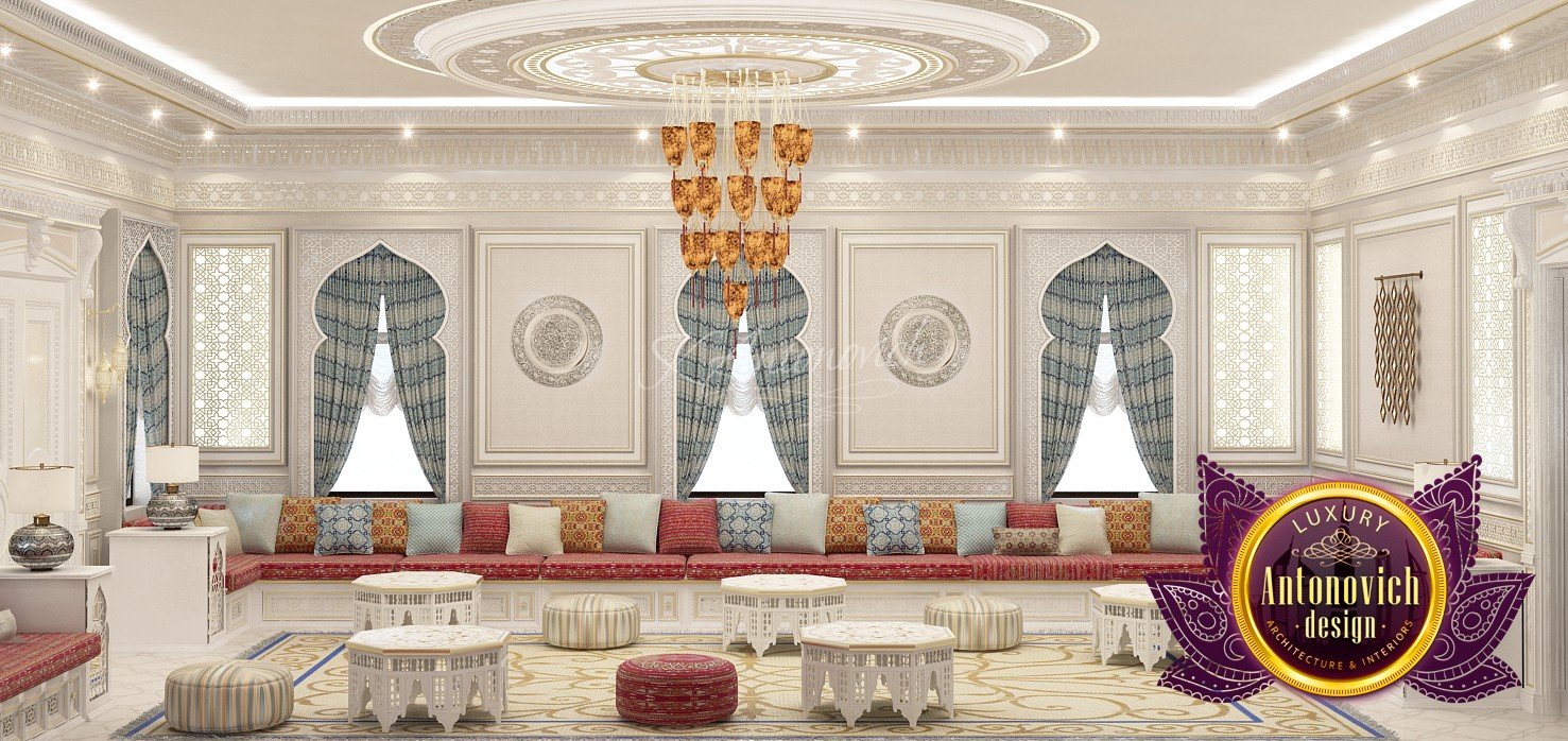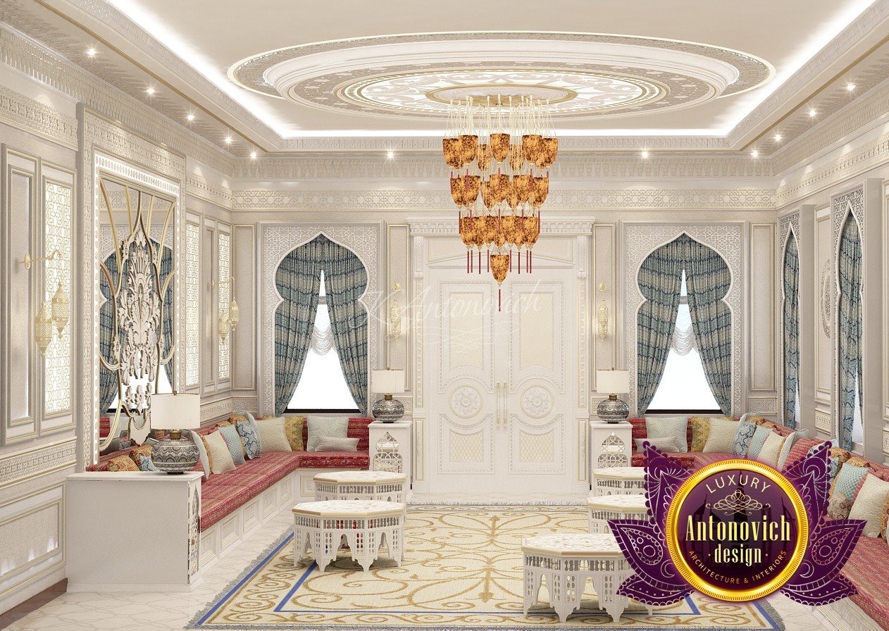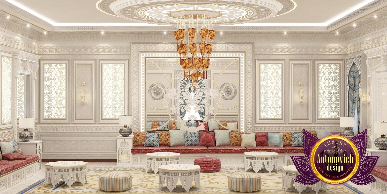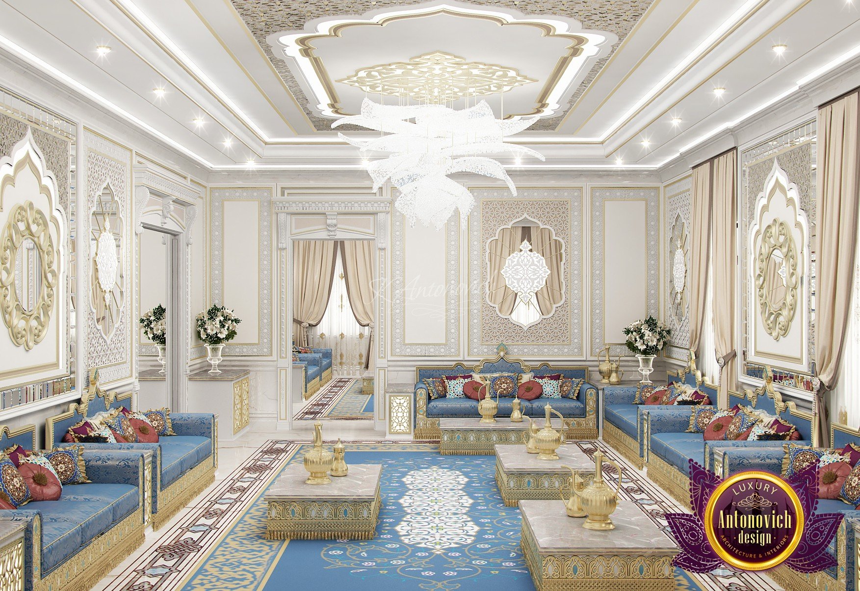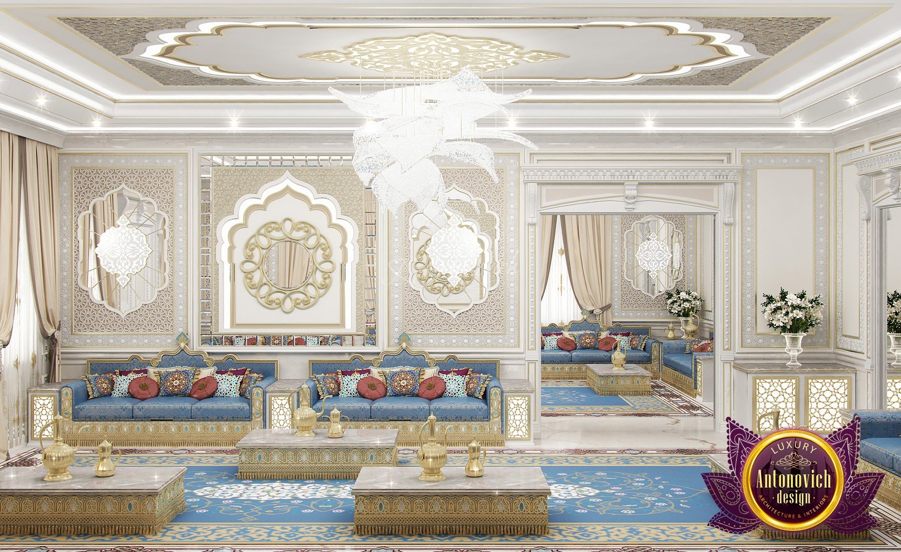 Modern villa design from Luxury Antonovich Design expresses the real passion and nobility of palace luxury. And every square centimeter of the project has got a profound meaning. Every touch is a part of a unified image of the interior. The artistic expression is based on a smart combination of colors, materials, and textures. A hall meets with a mood of life celebration. The marble expanse is decorated with exquisite carvings. The stair portal is decorated with a magnificent bas-relief with a romantic image of Venice. The ceilings are adorned with stucco with a texture of silk velvet and completed with beautiful stucco. As well as chandeliers and lighting lines. From the first moments of your stay in the house, you realize that the owners have great taste and appreciate art. A console table with gracefully curved legs complemented by a beautiful picture in a massive carved frame with gold. In the living room interior, in creamy-gold colors, looks fantastic furniture upholstered in dark purple velvet and elegant classic curtains look beautiful. The doors of dark wood of valuable species, which is inlaid with the gold carved decor, look nice. To visually enlarge the space and enhance the shine of luxury, the interior designers use such element as mirror panels with bevel. The festive atmosphere is present in all rooms. A cozy kitchen with luxury furniture looks very decent and respectable. Master Bedroom with a luxury bed looks especially majestic.