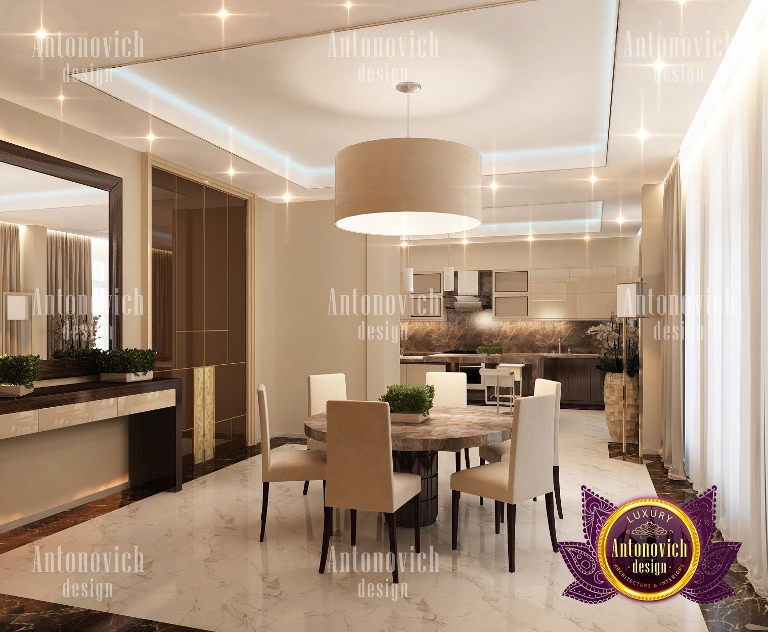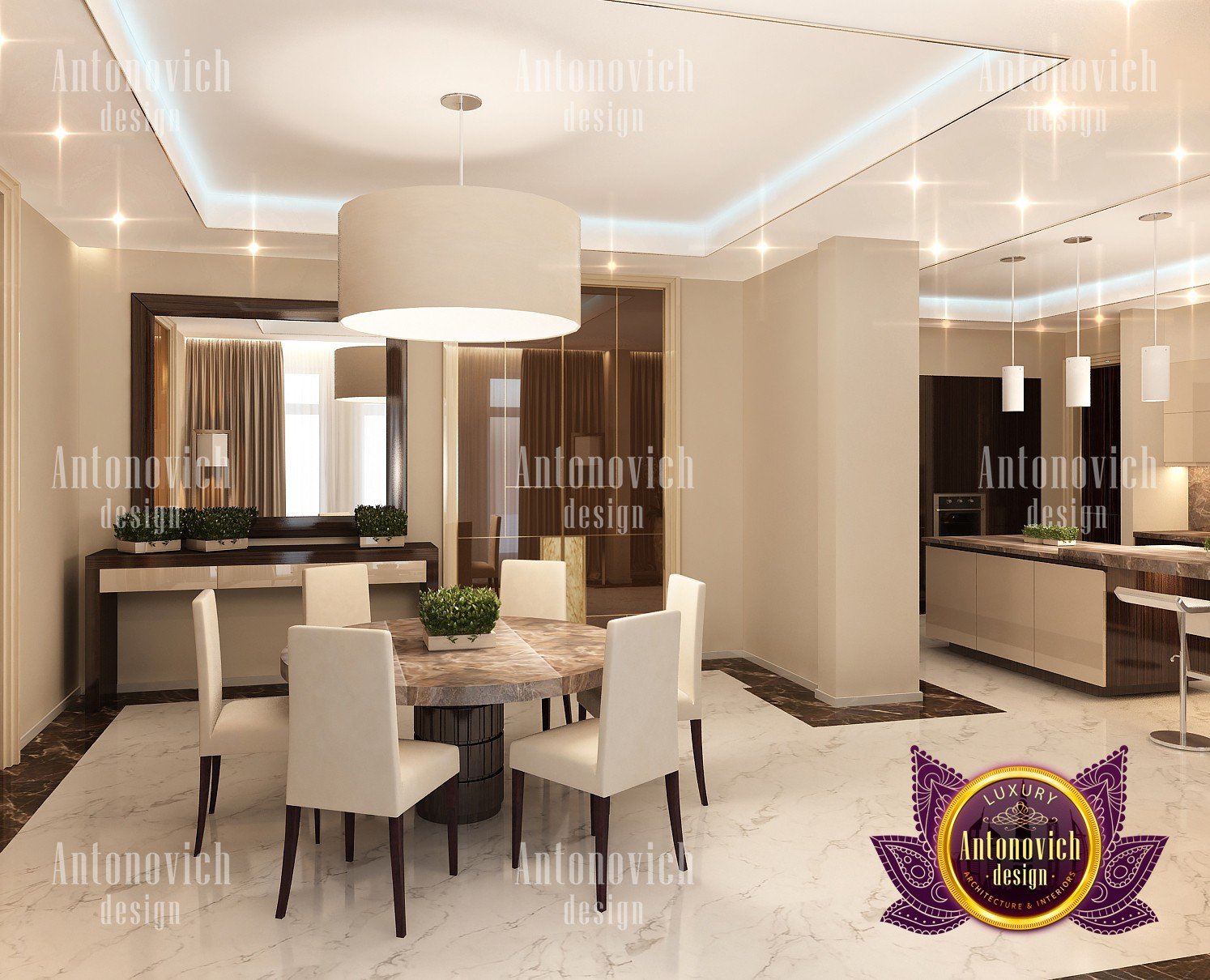 The luxury kitchen in its magnificence is not inferior to the living room and dining area. Interior designers evenly distributed charm of modern classics, with all its charms. These are traditional decorative elements, and completely unique original solutions. House Design Dubai is filled with tender and romantic accents. Easy festive mood, which is inherent in the kitchen interior is based on light and warm colors, as well as an abundance of light. During the day, sunlight penetrates through the windows, which are decorated with curtains of purple velvet. At dusk sunlight is successfully replaced with a great niche in the ceiling illuminated through the lace of exquisite gold ornaments. These patterns resonate with charmingly decorated furniture facades. The interior design Dubai Luxury Antonovich Design gives always exclusive solutions for beauty and absolute comfort. This unique design project of cozy kitchen is combined with a dining area. Open space is visually separated with the ceiling decorations. The dining area is dominated with a certain solemnity and pomp. The high ceilings are decorated with plaster of velvet texture, stucco decoration and illumination lines. As in the kitchen interior, the center of the space is defined with luxury chandelier in classical style. Kitchen interior design, as well as other spaces became the pride of the home owners.