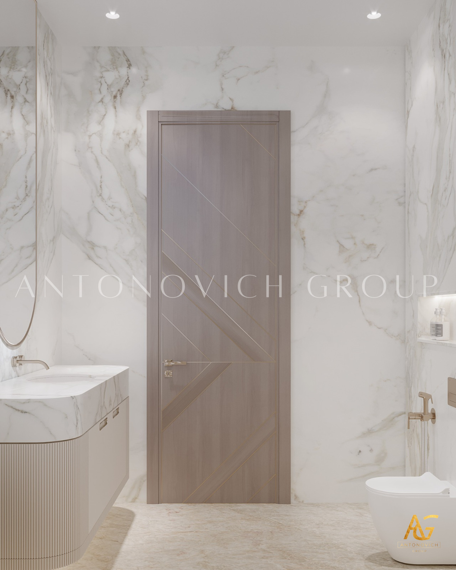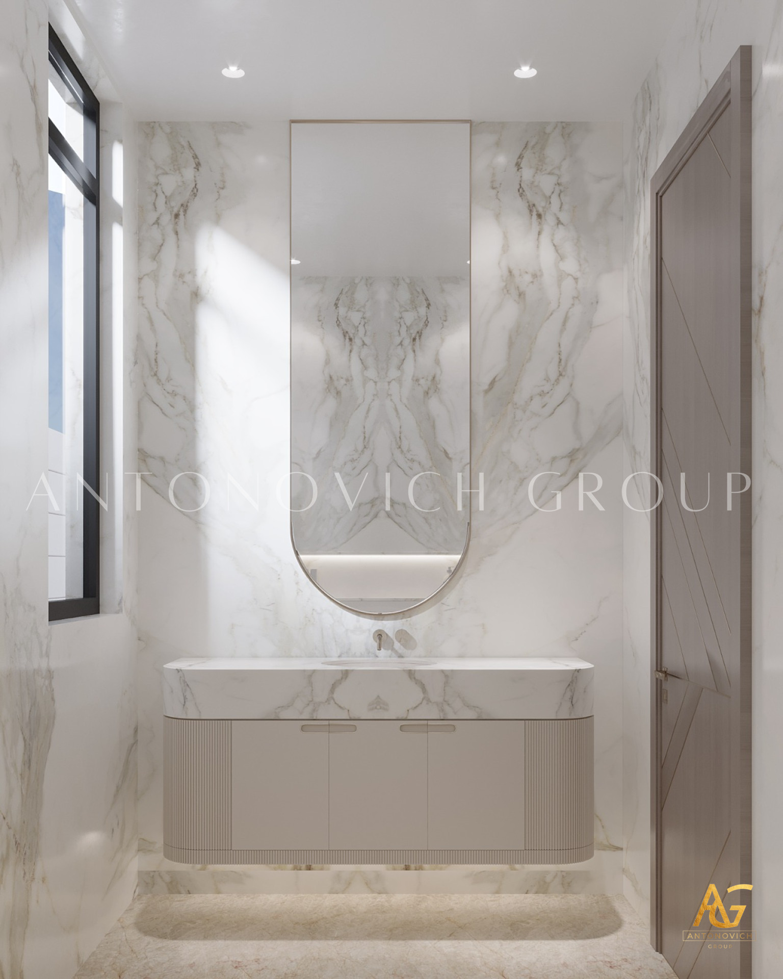 Luxury bathroom interior design as a work of art has become one of the jewels of the authors villa projects in Dubai. The interior design in classical style beautifully demonstrates the talent of designers and their ability to combine tradition and innovation. The whole villa design in Dubai is full of nobility, solemnity and respectability. One of the bathrooms perfectly reflects the overall design concept of the interior. Central composition of the interior is oval tub, which is raised on a low podium with steps made of natural marble. Steps are complemented with modern fixtures. The bathroom is framed by two graceful columns with gilded stucco capitals. Smart and warm bathroom interior is made by a combination of cream and gold color. In the walls decor massive baroque frames with gilding look stylish. It softens a little the ceiling decor with delicate white swirls of stucco decoration. Exquisite furniture with lighting complements the luxury and expressive image of the bathroom interior.