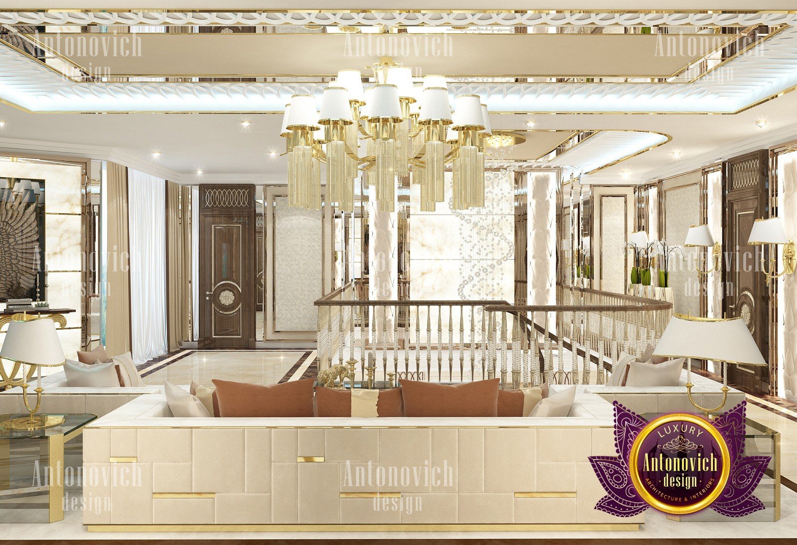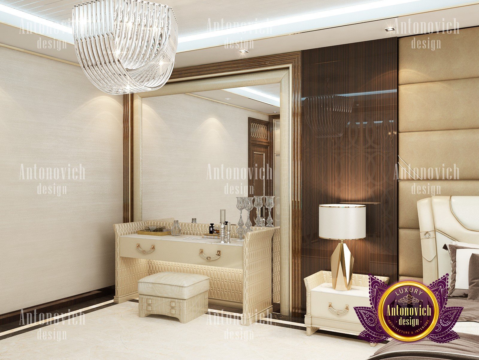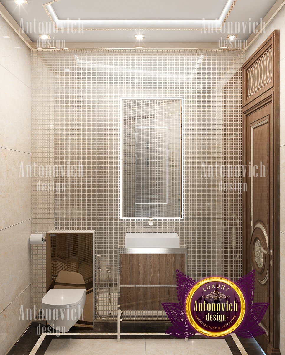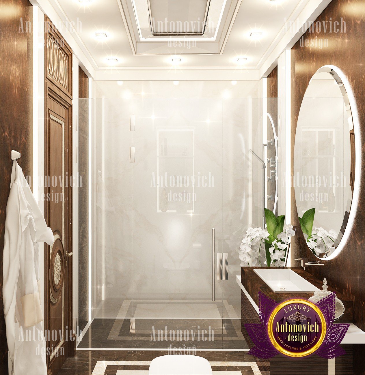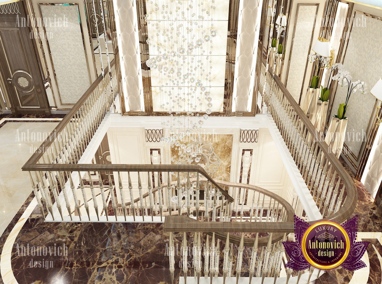 The villa interior design from the studio Luxury Antonovich Design is a deep and multi-faceted concept. To create for its customers an ideal habitat and an interior that will be a source of pride, we go beyond the ordinary and accurately track new trends in interior design and new technologies. Traditional classics in the authors works of interior designers and luxury become particularly expressive. The villa interior design from the first minute of your stay in the house adjusts to the wonderful feeling of warmth of home comfort. In the hall a luxury marble staircase is decorated with elegant wrought-iron balustrades and a spectacular touch in the form of a mirror panel with bevel. The staircase looks dignified surrounded by carved marble floors. In the walls decor there is precious wood, mirrors and carved decoration with gold. A ceiling is decorated with the traditional crystal chandelier, surrounded by swirls of stucco decoration. Luxury gloss filled every corner of the house. Bathroom design is all about glitter of gold and richly decorated walls. Spacious dressing room has a cozy image and an excellent functionality. Villa design project takes into account all the wishes of its owners. Interior designers have created a project in the best traditions of modern classics. You can enjoy every corner of the house forever. In the kitchen interior classical furniture with carved decoration looks charmingly. A highlight of the interior became pelmets made of natural wood with carved decoration and gilding. Bedroom design continues luxurious mood of the villa interior.
