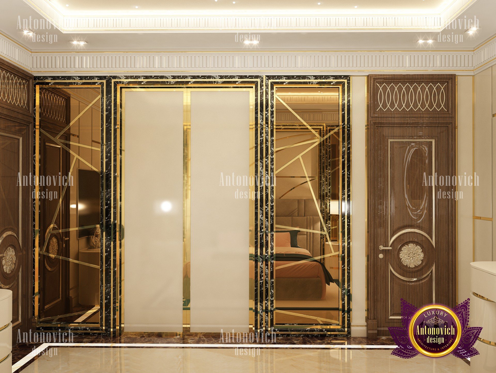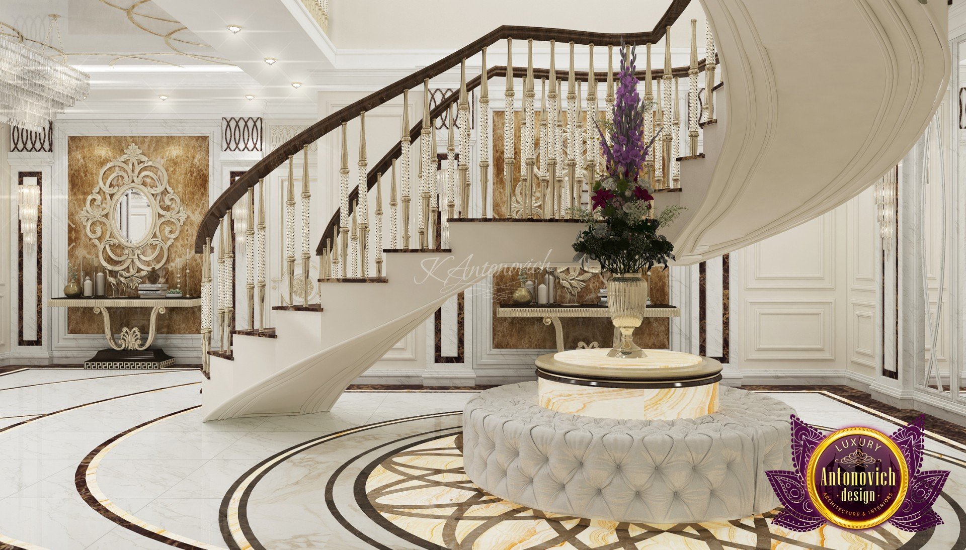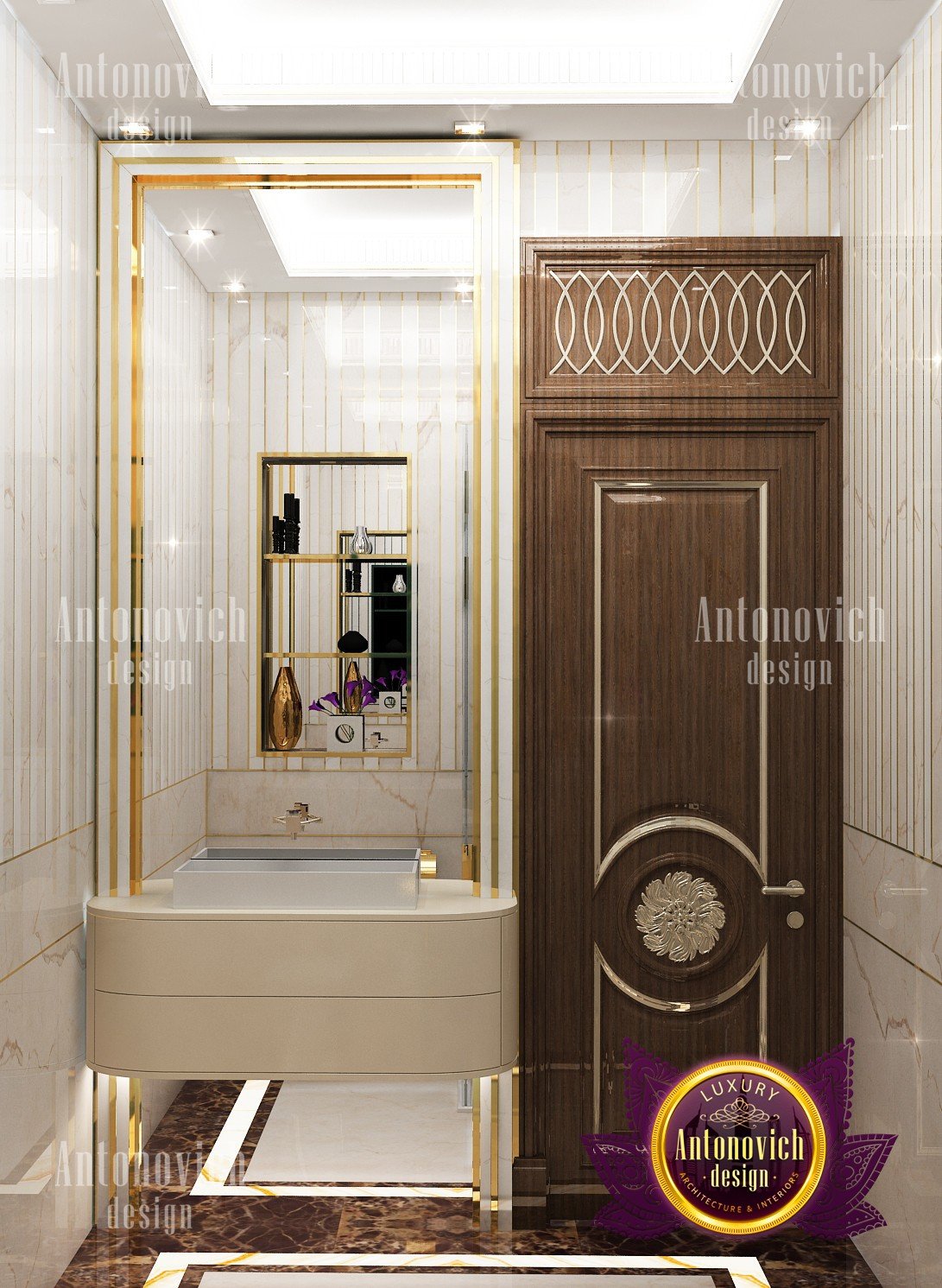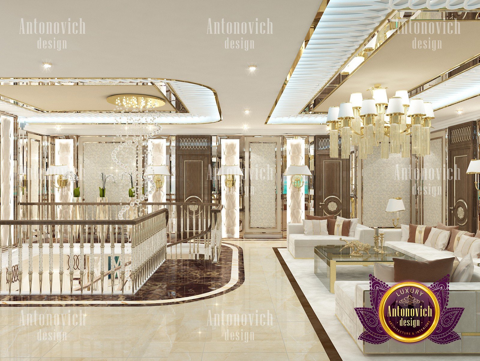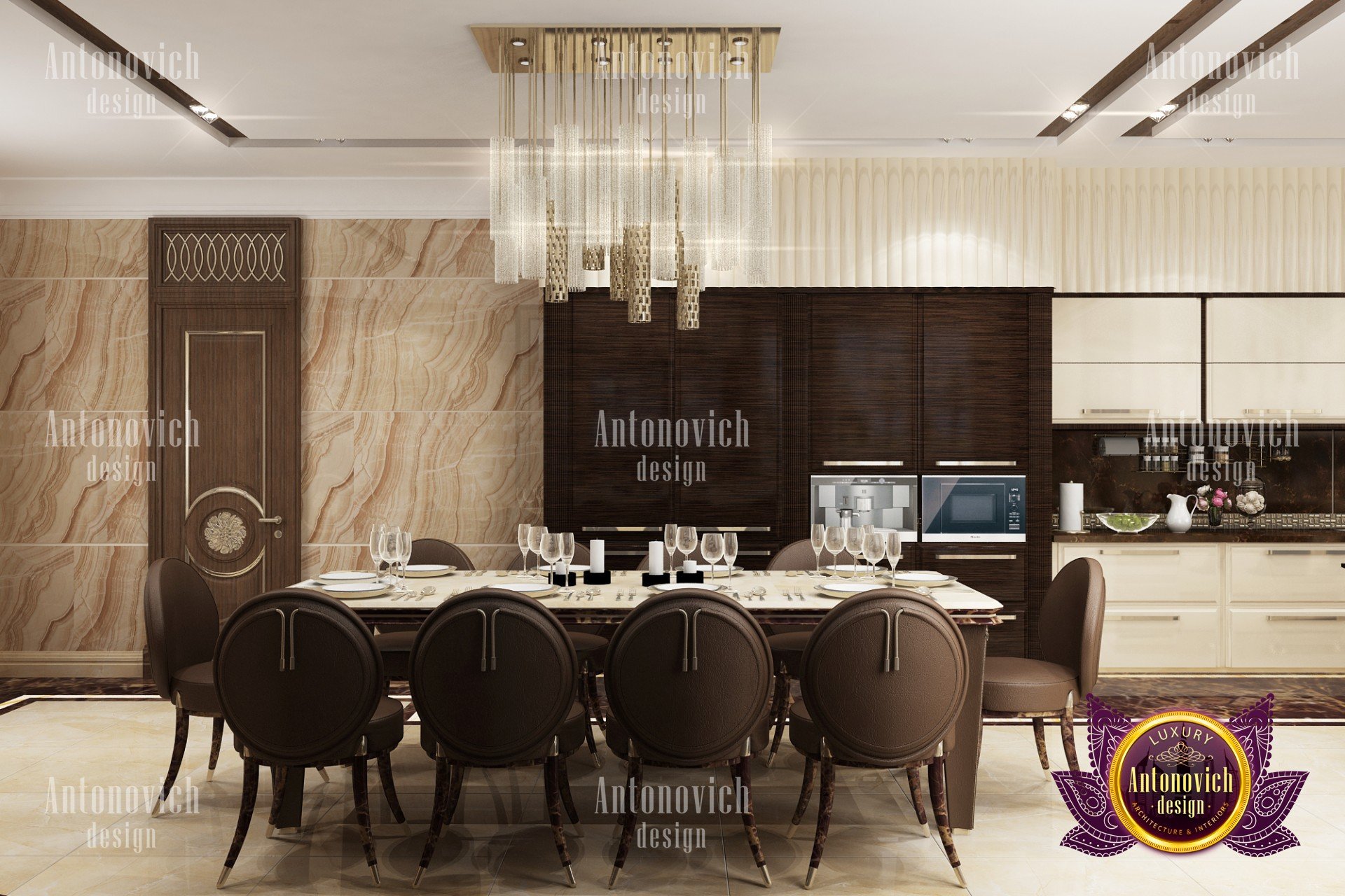 The villa interior design from the studio Luxury Antonovich Design is a deep and multi-faceted concept. To create for its customers an ideal habitat and an interior that will be a source of pride, we go beyond the ordinary and accurately track new trends in interior design and new technologies. Traditional classics in the authors works of interior designers and luxury become particularly expressive. The villa interior design from the first minute of your stay in the house adjusts to the wonderful feeling of warmth of home comfort. In the hall a luxury marble staircase is decorated with elegant wrought-iron balustrades and a spectacular touch in the form of a mirror panel with bevel. The staircase looks dignified surrounded by carved marble floors. In the walls decor there is precious wood, mirrors and carved decoration with gold. A ceiling is decorated with the traditional crystal chandelier, surrounded by swirls of stucco decoration. Luxury gloss filled every corner of the house. Bathroom design is all about glitter of gold and richly decorated walls. Spacious dressing room has a cozy image and an excellent functionality. Villa design project takes into account all the wishes of its owners. Interior designers have created a project in the best traditions of modern classics. You can enjoy every corner of the house forever. In the kitchen interior classical furniture with carved decoration looks charmingly. A highlight of the interior became pelmets made of natural wood with carved decoration and gilding. Bedroom design continues luxurious mood of the villa interior.