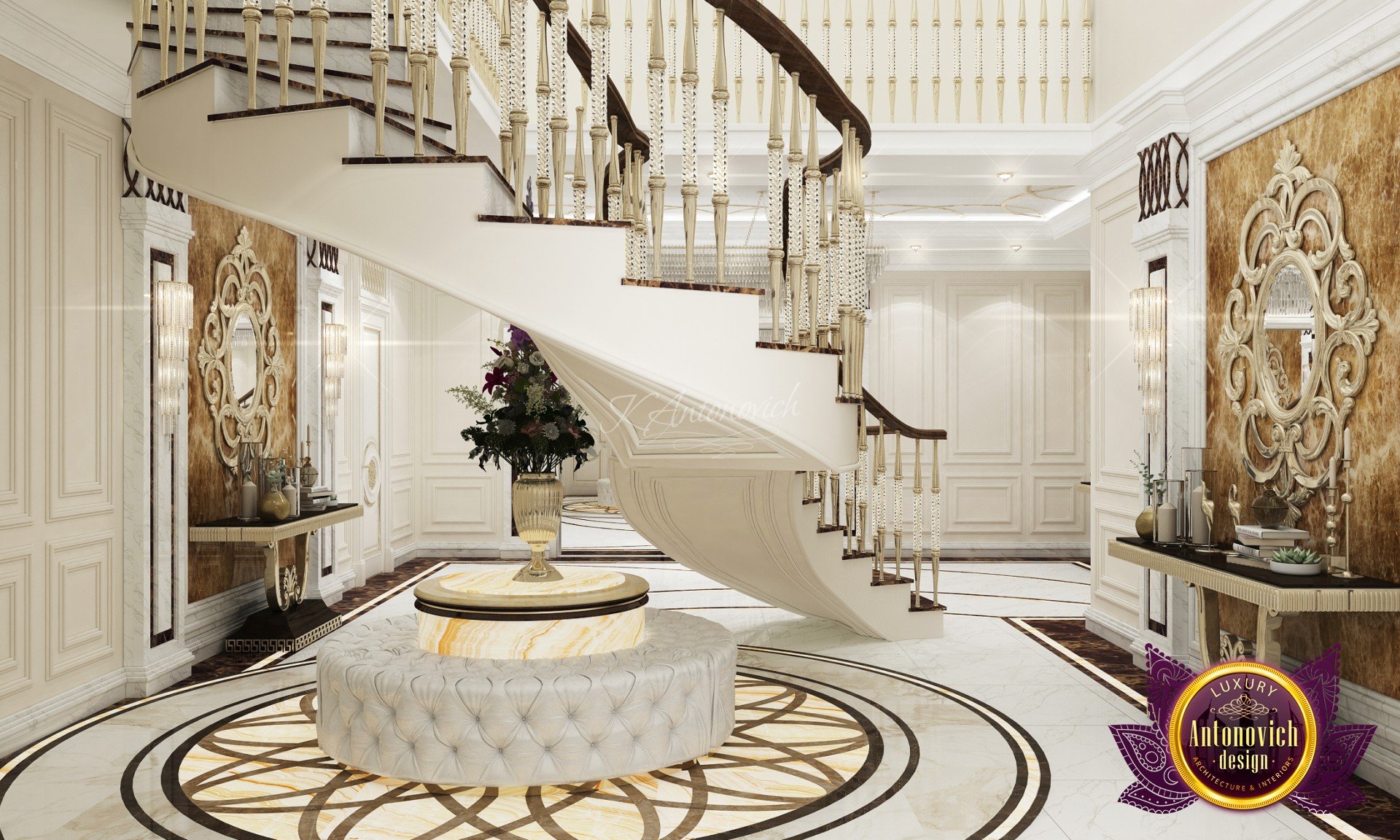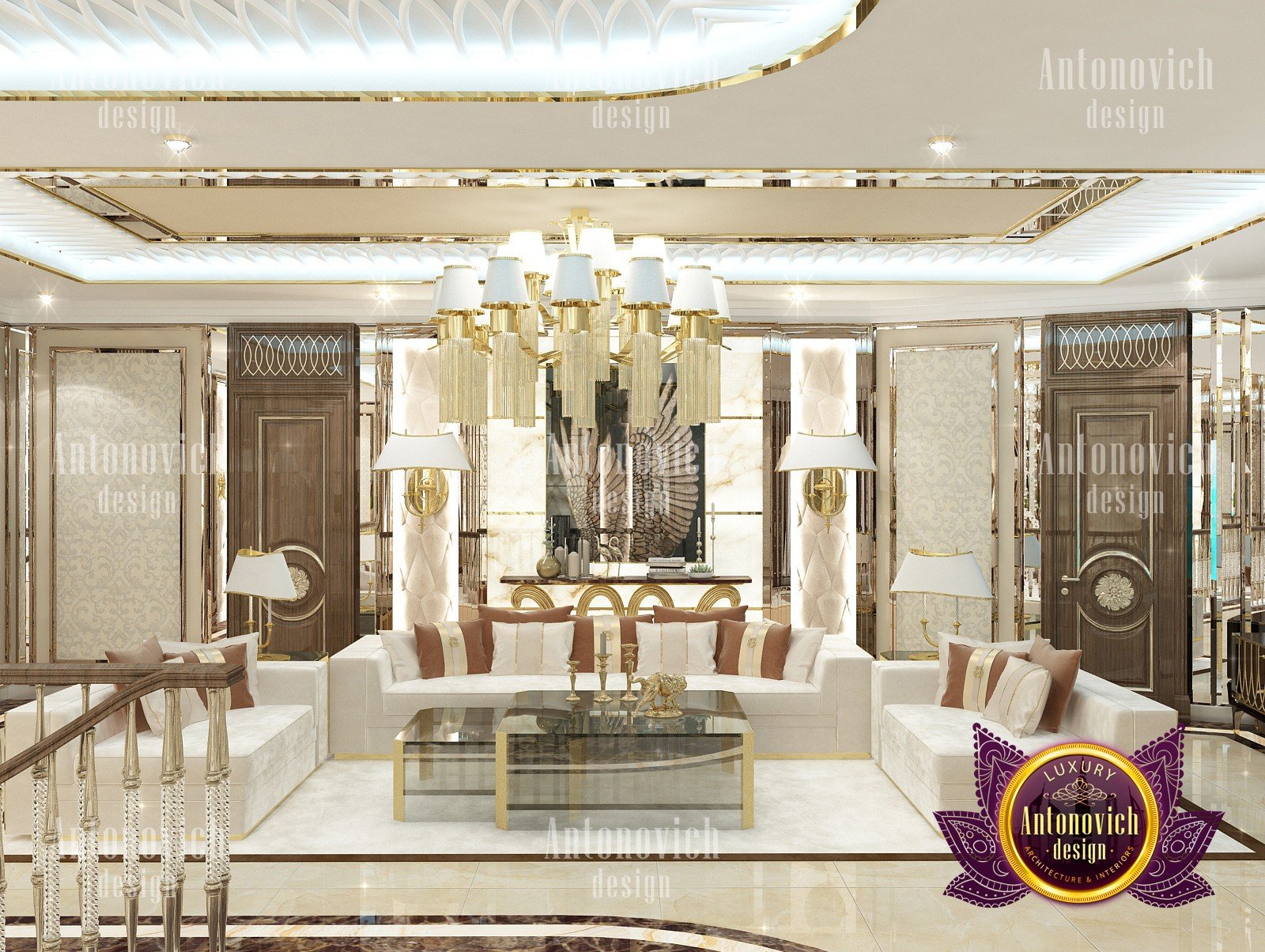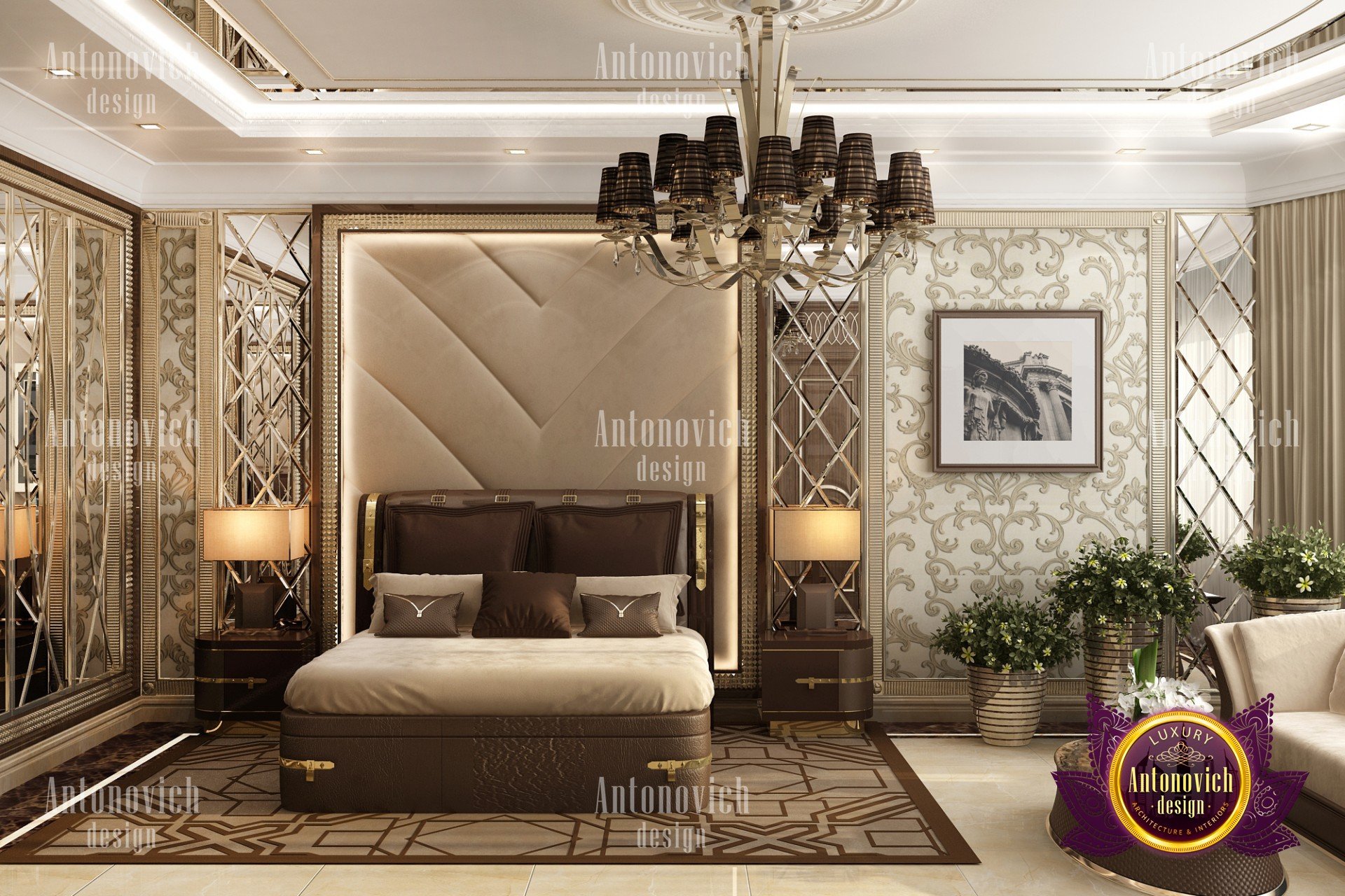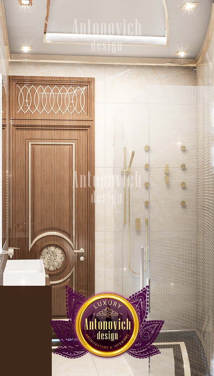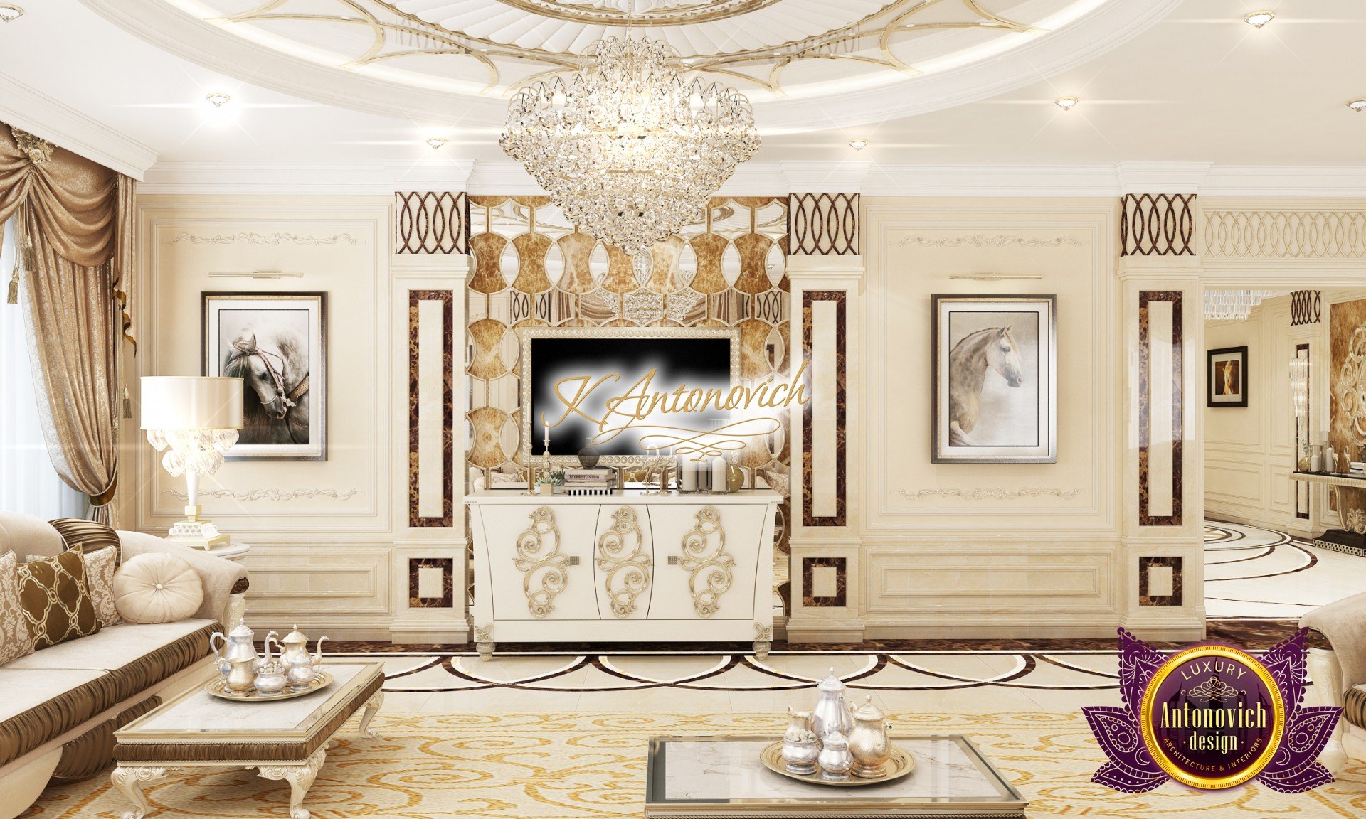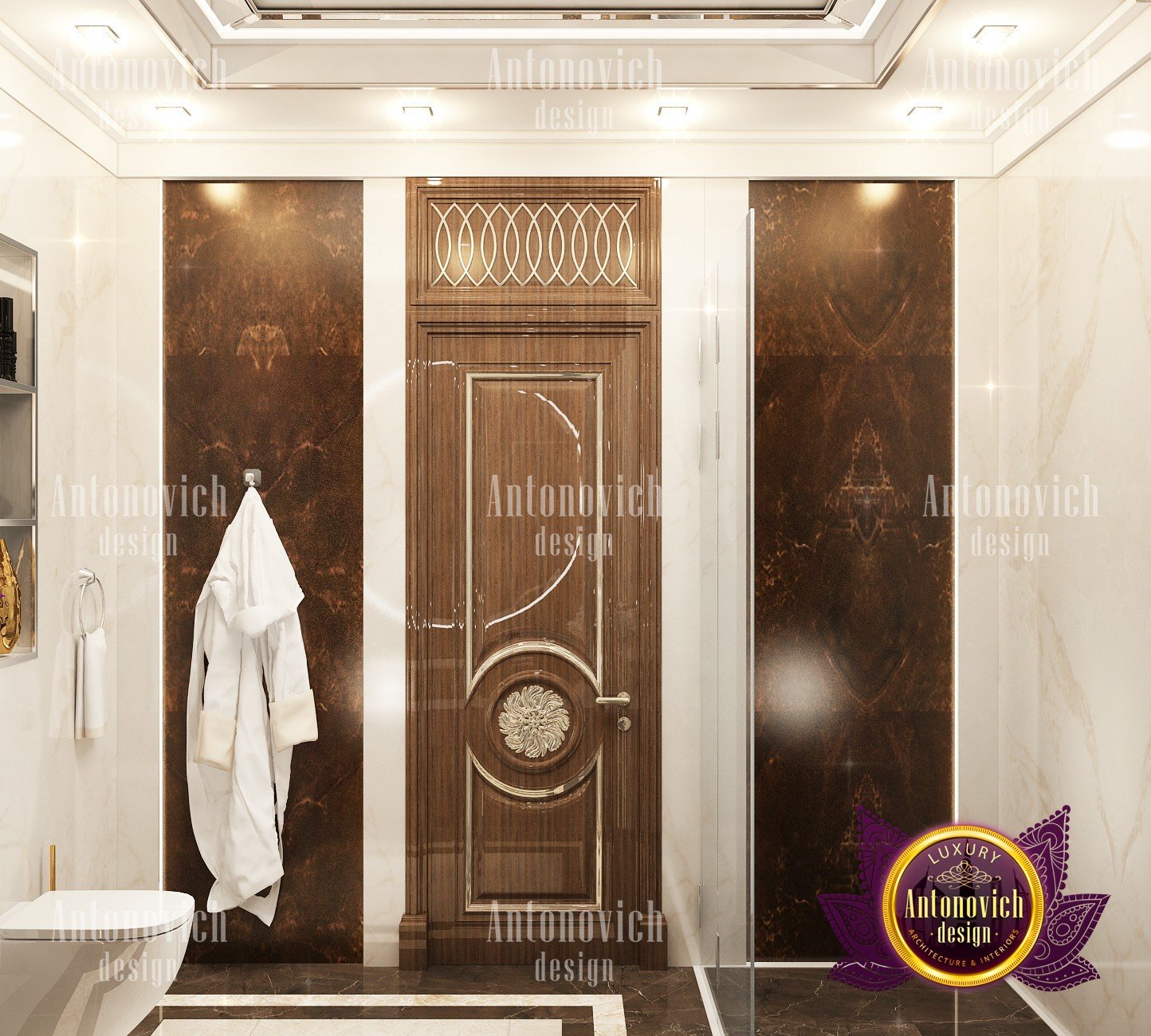 The villa interior design from the studio Luxury Antonovich Design is a deep and multi-faceted concept. To create for its customers an ideal habitat and an interior that will be a source of pride, we go beyond the ordinary and accurately track new trends in interior design and new technologies. Traditional classics in the authors works of interior designers and luxury become particularly expressive. The villa interior design from the first minute of your stay in the house adjusts to the wonderful feeling of warmth of home comfort. In the hall a luxury marble staircase is decorated with elegant wrought-iron balustrades and a spectacular touch in the form of a mirror panel with bevel. The staircase looks dignified surrounded by carved marble floors. In the walls decor there is precious wood, mirrors and carved decoration with gold. A ceiling is decorated with the traditional crystal chandelier, surrounded by swirls of stucco decoration. Luxury gloss filled every corner of the house. Bathroom design is all about glitter of gold and richly decorated walls. Spacious dressing room has a cozy image and an excellent functionality. Villa design project takes into account all the wishes of its owners. Interior designers have created a project in the best traditions of modern classics. You can enjoy every corner of the house forever. In the kitchen interior classical furniture with carved decoration looks charmingly. A highlight of the interior became pelmets made of natural wood with carved decoration and gilding. Bedroom design continues luxurious mood of the villa interior.