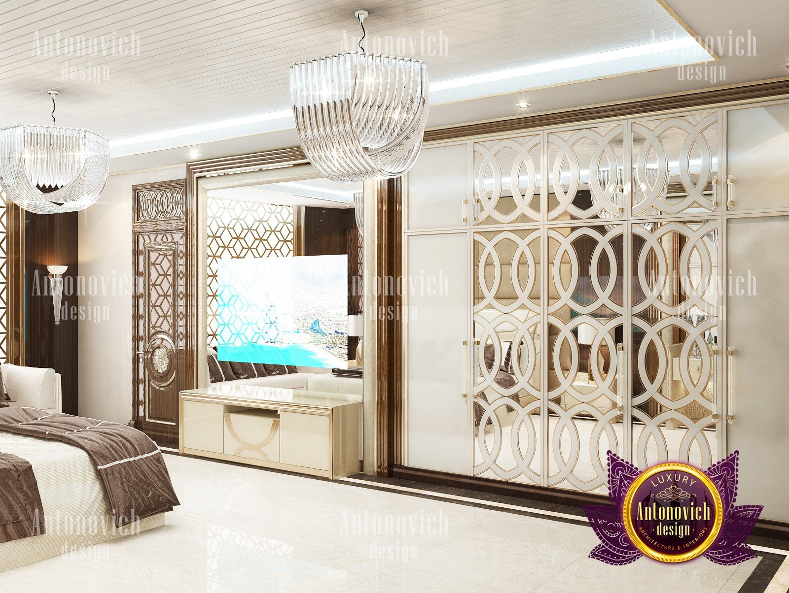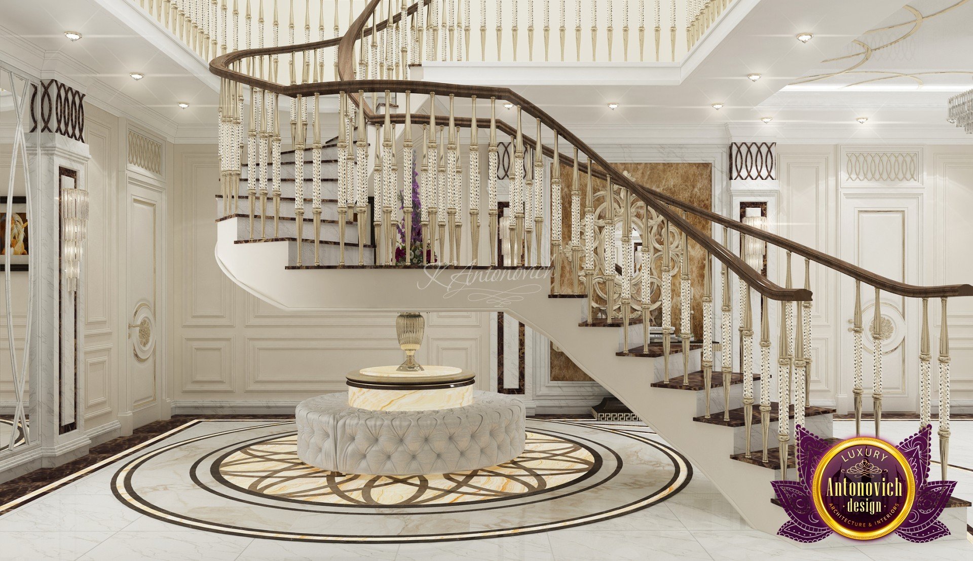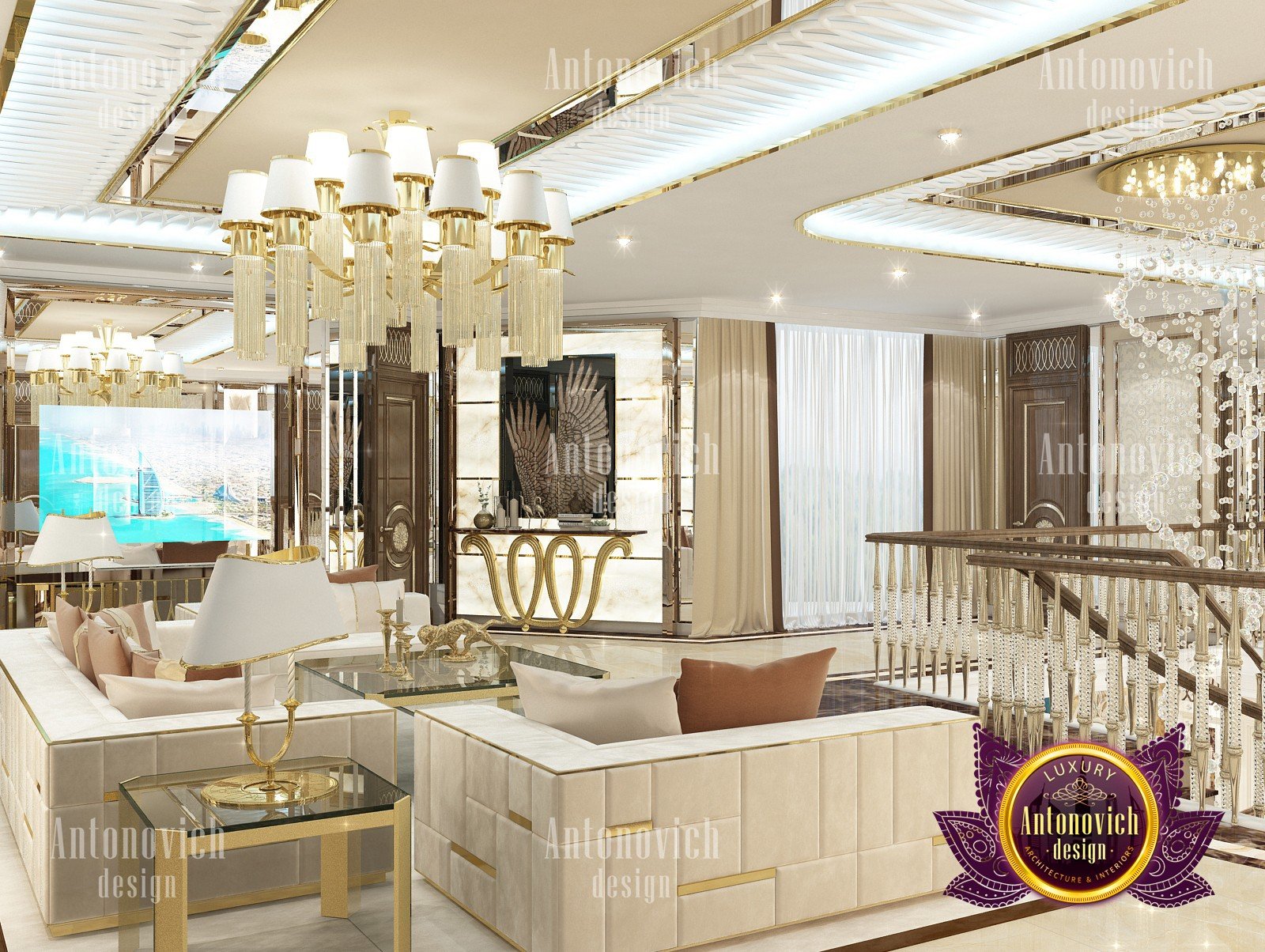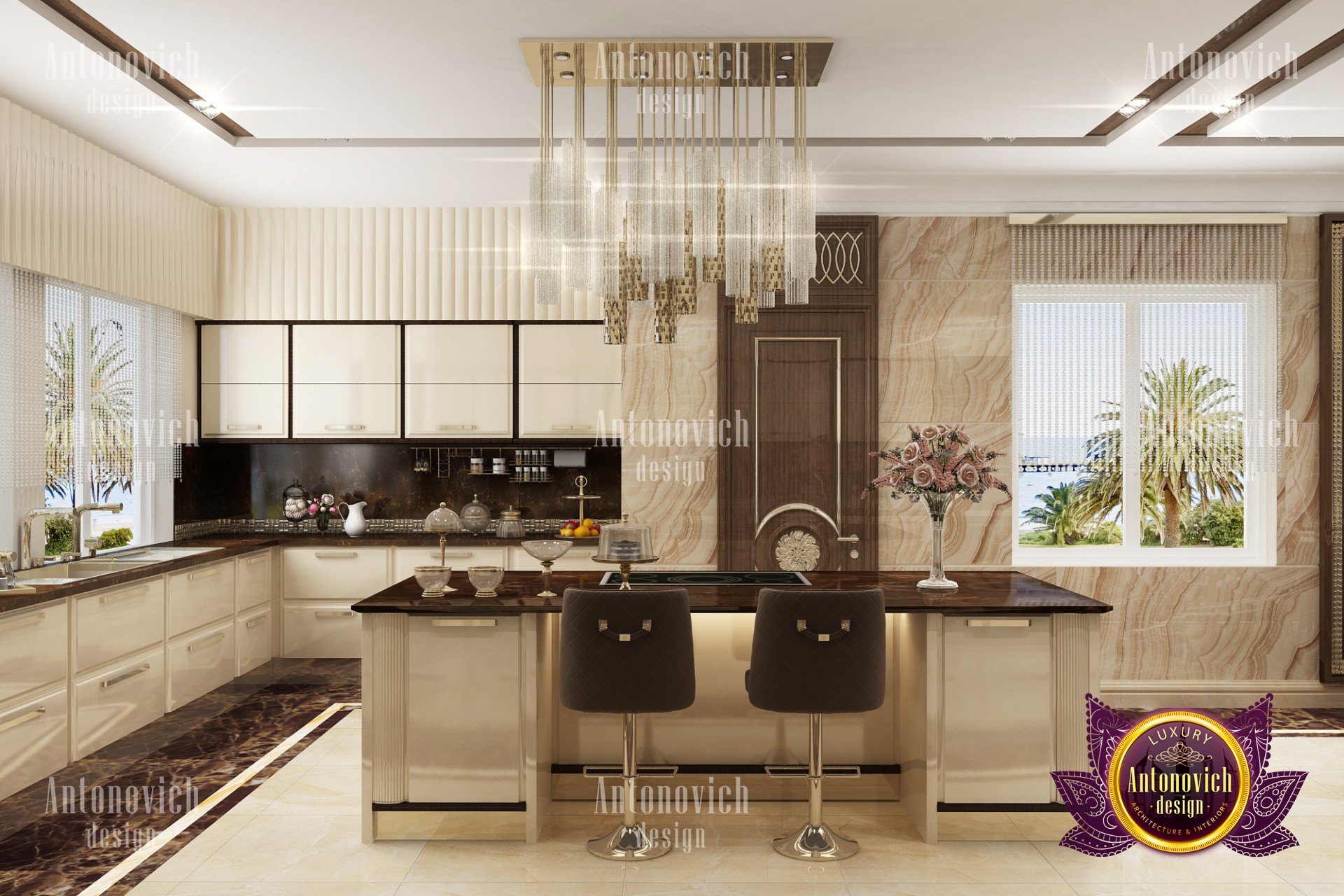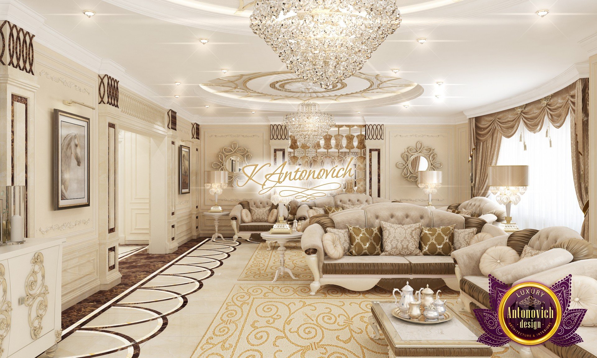 The villa interior design from the studio Luxury Antonovich Design is a deep and multi-faceted concept. To create for its customers an ideal habitat and an interior that will be a source of pride, we go beyond the ordinary and accurately track new trends in interior design and new technologies. Traditional classics in the authors works of interior designers and luxury become particularly expressive. The villa interior design from the first minute of your stay in the house adjusts to the wonderful feeling of warmth of home comfort. In the hall a luxury marble staircase is decorated with elegant wrought-iron balustrades and a spectacular touch in the form of a mirror panel with bevel. The staircase looks dignified surrounded by carved marble floors. In the walls decor there is precious wood, mirrors and carved decoration with gold. A ceiling is decorated with the traditional crystal chandelier, surrounded by swirls of stucco decoration. Luxury gloss filled every corner of the house. Bathroom design is all about glitter of gold and richly decorated walls. Spacious dressing room has a cozy image and an excellent functionality. Villa design project takes into account all the wishes of its owners. Interior designers have created a project in the best traditions of modern classics. You can enjoy every corner of the house forever. In the kitchen interior classical furniture with carved decoration looks charmingly. A highlight of the interior became pelmets made of natural wood with carved decoration and gilding. Bedroom design continues luxurious mood of the villa interior.