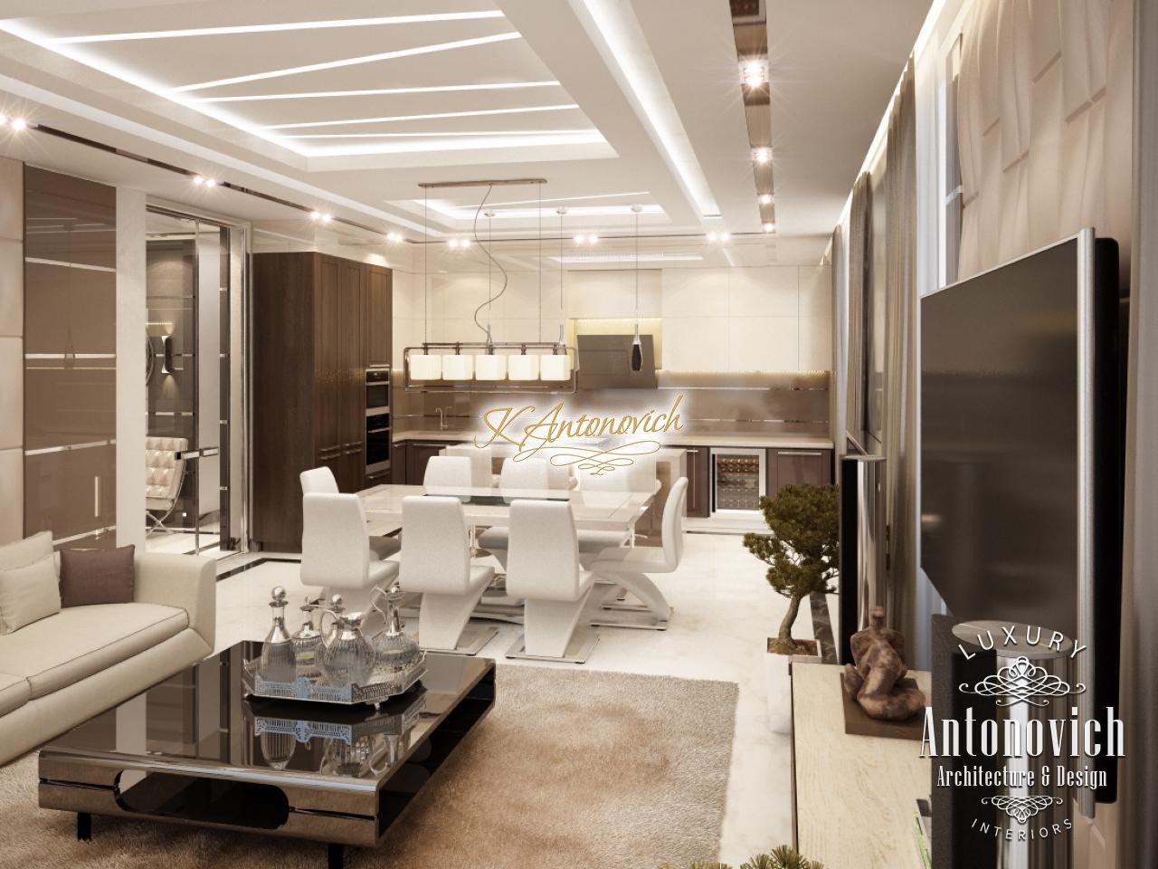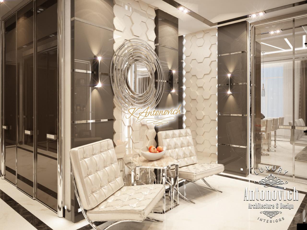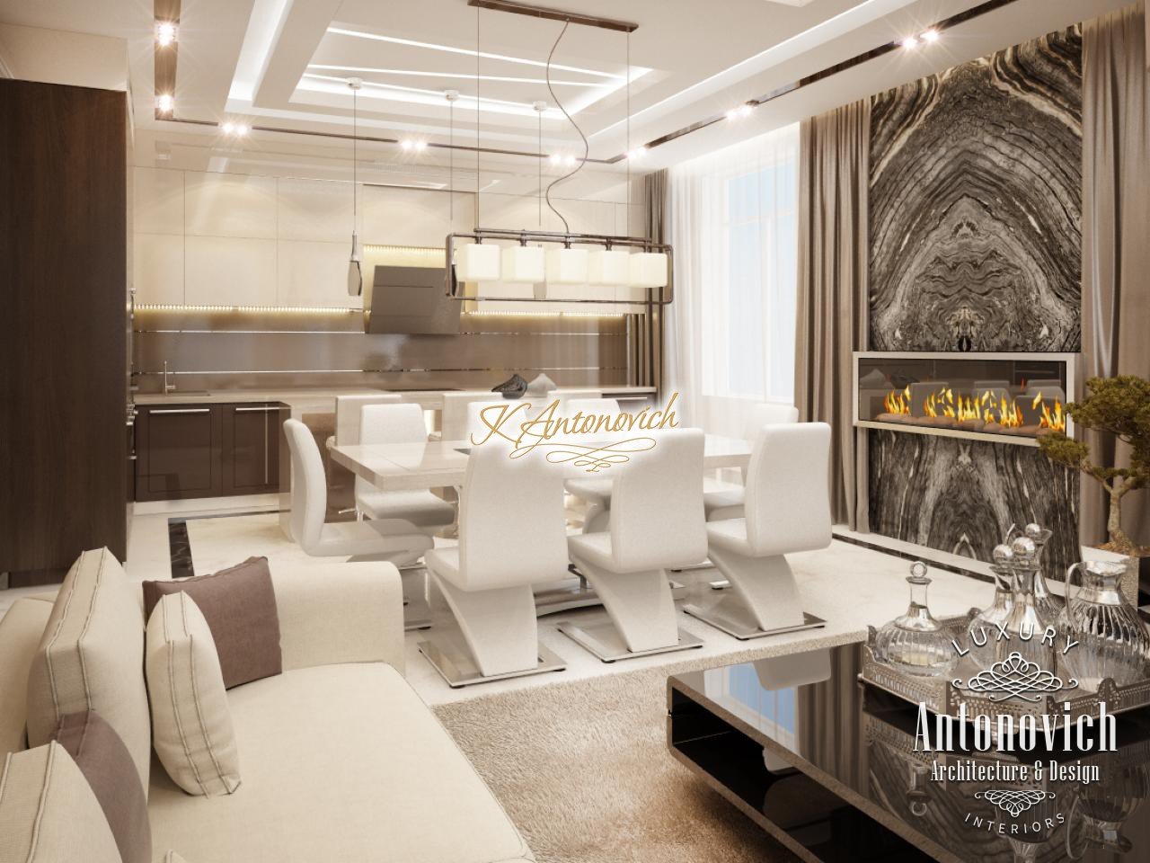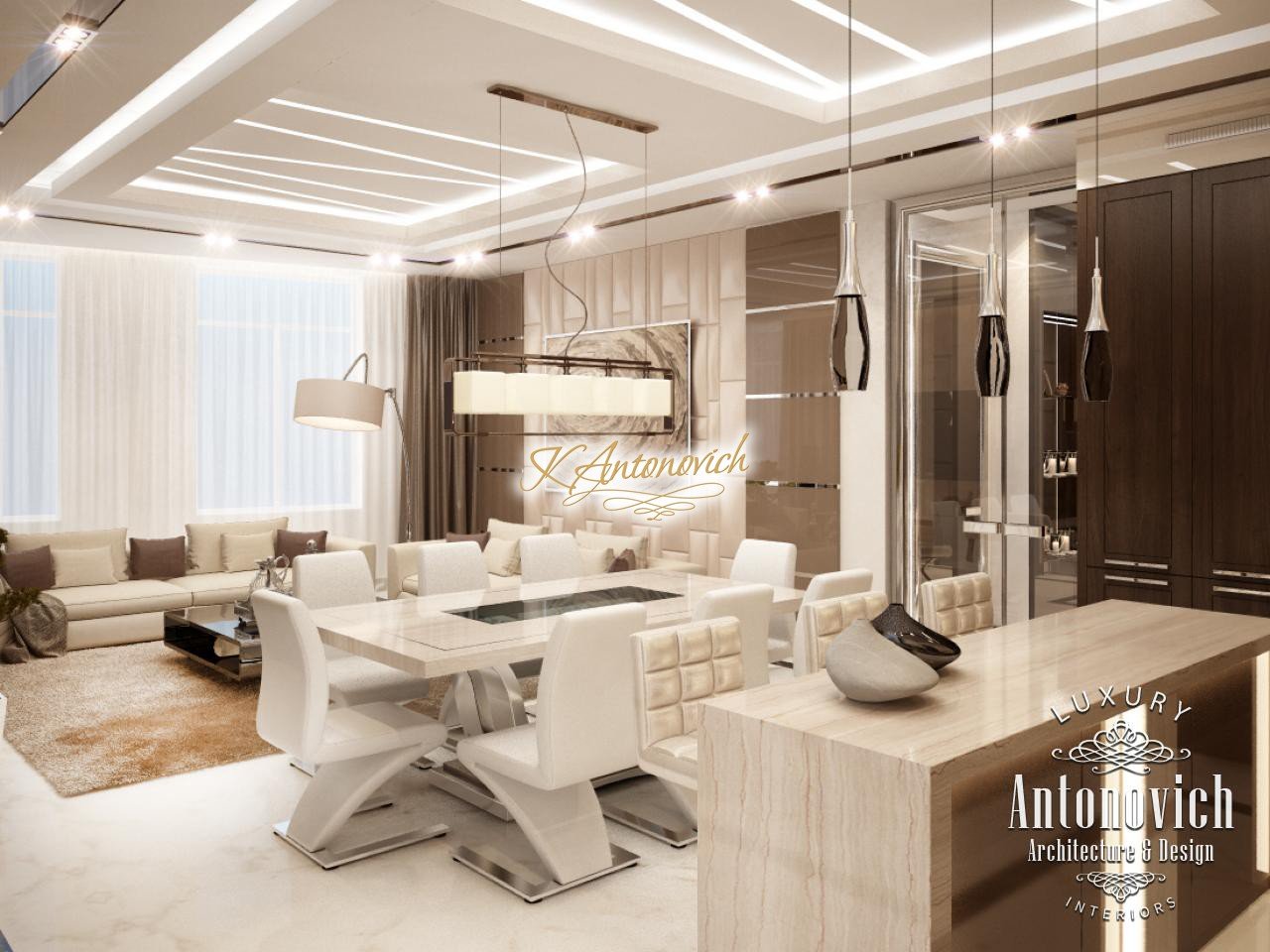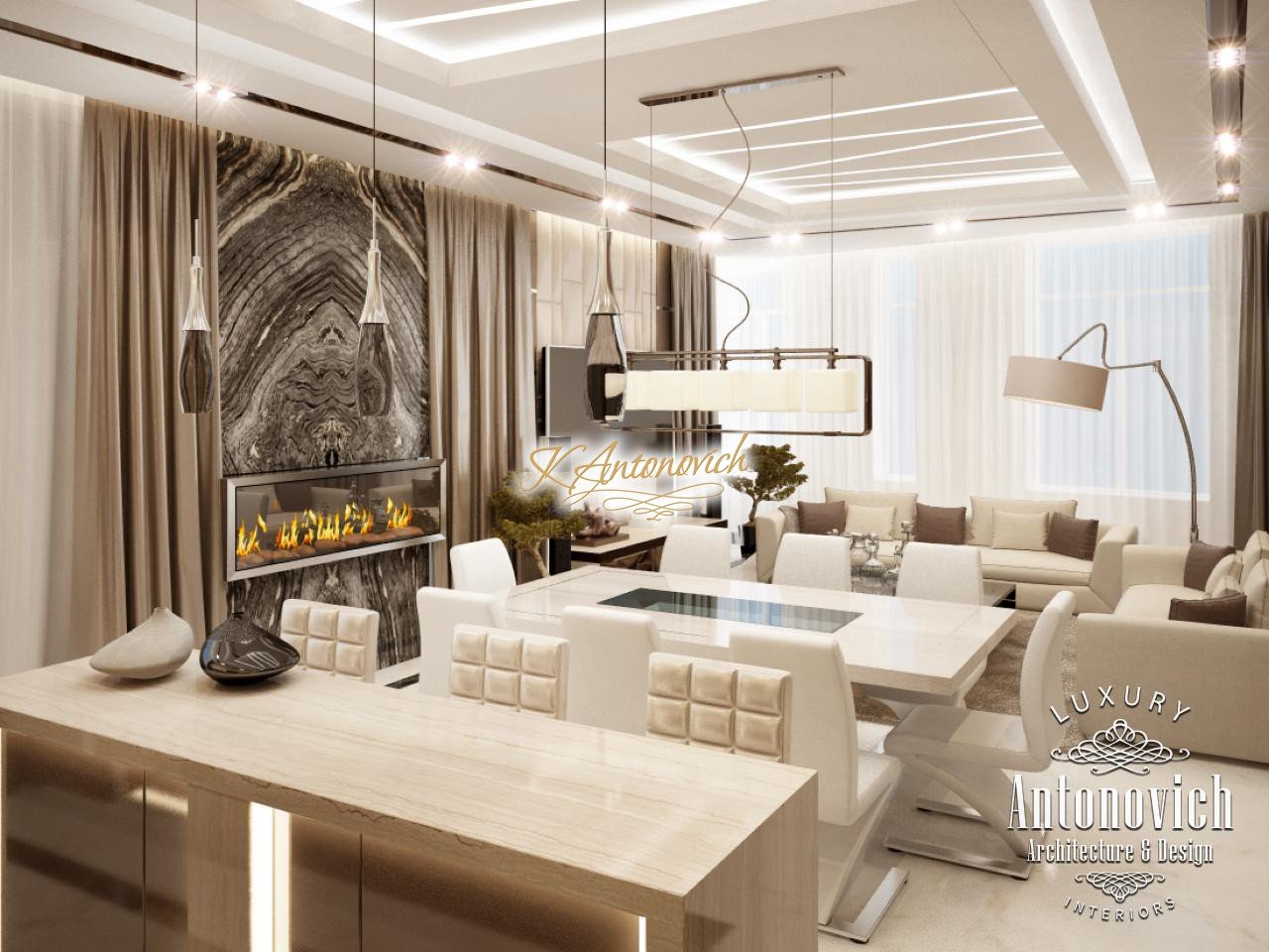 Interior Designers Dubai in this project have combined contemporary style with light accents and eco-minimalism. The interior is impressive with conciseness and clarity of lines. Each square meter pleases the eye. The look, just slip on features of a cozy luxurious interior, which gives a sense of aesthetic pleasure. Apartment interior design Dubai clearly fulfills all the wishes of our customers and their desire to get a cozy oasis full of life. Modern interior design tends to open space. In this project kitchen and dining room are harmoniously combined with luxurious living room. The of dining room design is characterized with particularly warm mood. This is underlined with a modern fireplace, which is built into the wall, decorated with natural stone. On this bright background large dining table looks wonderful, which is surrounded by stylish high chairs upholstered in cream shade. Stylish and functional kitchen with glossy facades literally dissolves into space of the cozy apartment. The combination of cream and chocolate hues fills the kitchen interior with warmth and tenderness. This softness is elegantly compensated with dynamic and expressive ceiling design. The snow-white expanse is decorated with narrow niches with illumination and complemented by original chandeliers in a modern style. Apartment Design Dubai gives the opportunity to look into the future of luxury and warmth of home comfort.