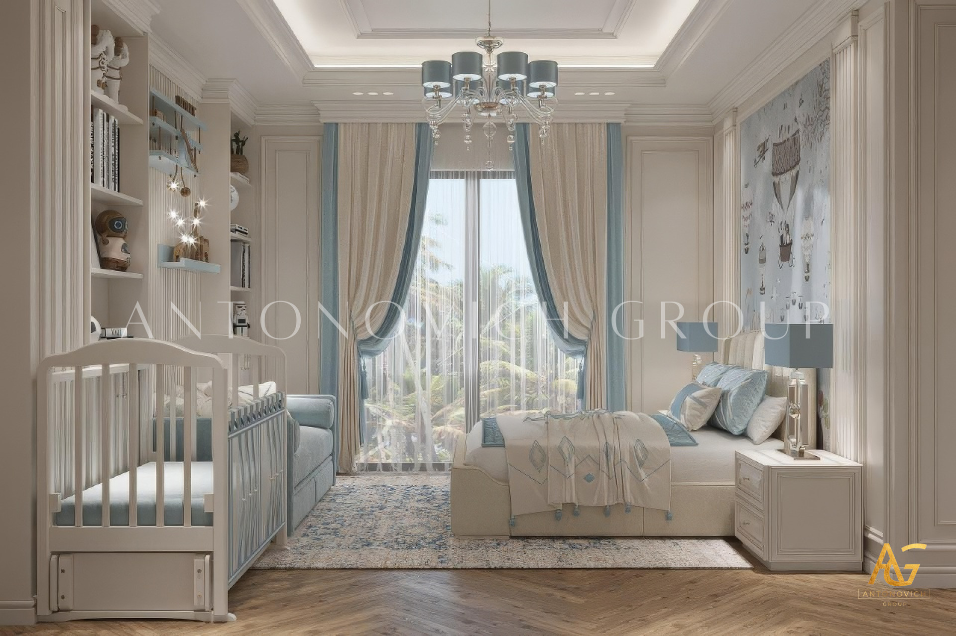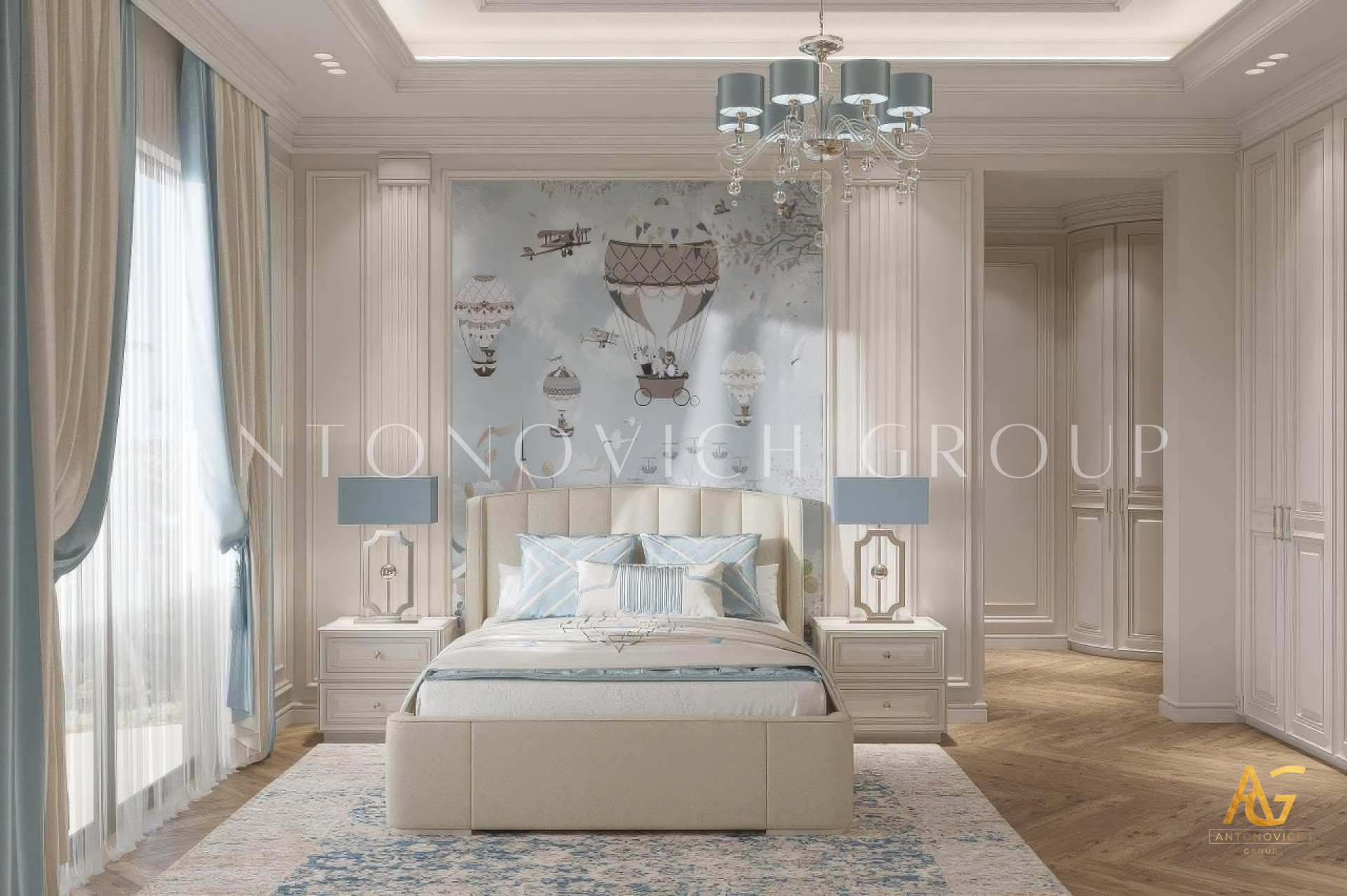 Children's room interior design is a special area in our work, which we are paying close attention. Luxury interior design from studio Dubai Luxury Antonovich Design takes into account the wishes and dreams of every member of the family of home owners. This architectural child's room project was designed for two twin brothers. Villa design in Dubai in general is in the classical style. And only in the children's room interior designers completely gone from the concept and dedicated every detail to the dreams and passions of two twin brothers. Children's rooms design reflect the romantic theme of sea travel. Spectacular design solutions give the children's room cozy original form. Two comfortable beds are stylized under a sea boat. They are united with one headboard of a large wheel. Curtains and decoration of the bed are made of natural plaided fabrics of two shades, which makes the interior perfect and very expressive. Curtains are complemented with noble white silk with original mesh that resembles a light sail. The ceiling design continues romantic mood of the interior. Children's room interior design is in perfect harmony with the inner world of children, their dreams and passions.