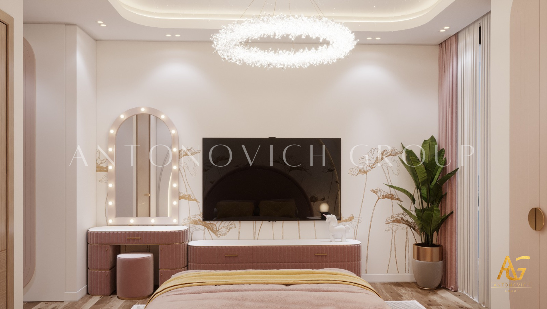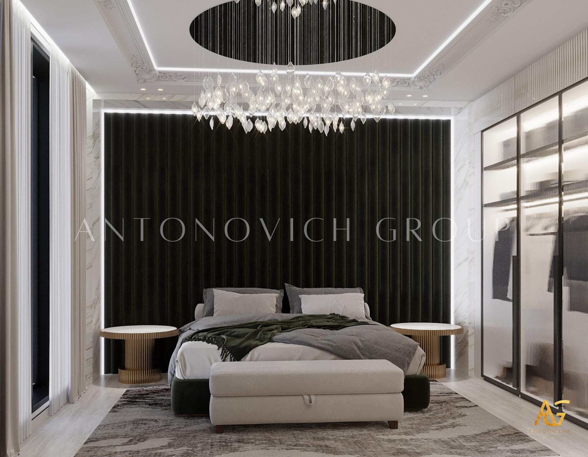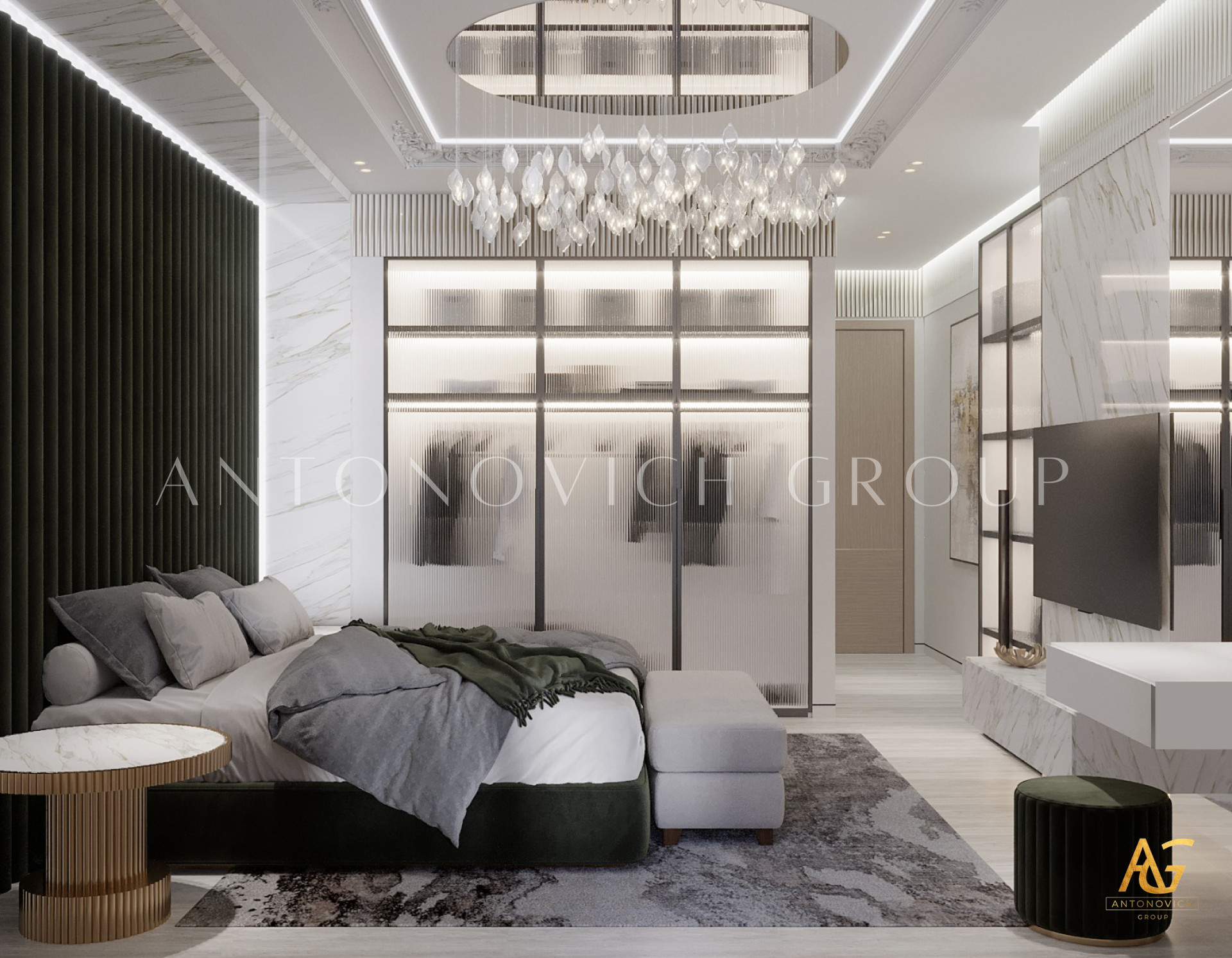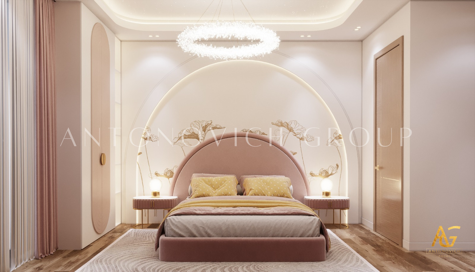 Apartment design in Dubai expresses wonderful charm of festive mood, which is inherent in the interior in the style of Art Deco. Author's interior design by studio Luxury Antonovich Design presented to the owners of houses and apartments happiness of the unique beauty of the interior. This apartment is the main motive of the softness and tenderness. Warm bright colors, an abundance of velvet and velor gives the interior a particularly warm and cozy charm. Interior designers skillfully performed with Dubai apartment space, taking advantage of the architectural plan. The semi-circular outline of the walls, circular niches in the ceiling, all this creates a feeling of infinity of luxury and splendor of the interior. Apartment Design Dubai ideally suited to the latest fashion trends. The elegant and eye-catching ceiling design is possible today, thanks to modern technology materials processing and new ways of lighting. Traditional chandelier and stucco accents are added in the form of LED lights and niches with exquisite patterns, which are filled with mirrored panels. Interior Designers Dubai combine visual space throughout the apartment with exquisite original solutions. This is facilitated with lines of carved patterns on the marble floor and soft wall panels, which are present in all the rooms of the apartment. The hall interior is decorated with charming half-soft cream-colored with decorative pearl belts. The column ends at the base with the soft pouf with wrought iron swirls illuminated. Apartment design Dubai from the first moments of your stay fascinates with its beauty and elegance. Living room is combined with a dining area. The large semicircular sofa and large dining table are surrounded with luxury chairs say that in this house you are always welcome. Soft wall panels with a shallow tightening introduced into the interior of the living room a pleasant mood of warmth of home comfort. In the bedroom interior designers Dubai continued gentle and warm mood. Luxurious bed with high upholstered headboard looks gorgeous on the background of which there is a large textile panel that extends to the full height of the ceiling.