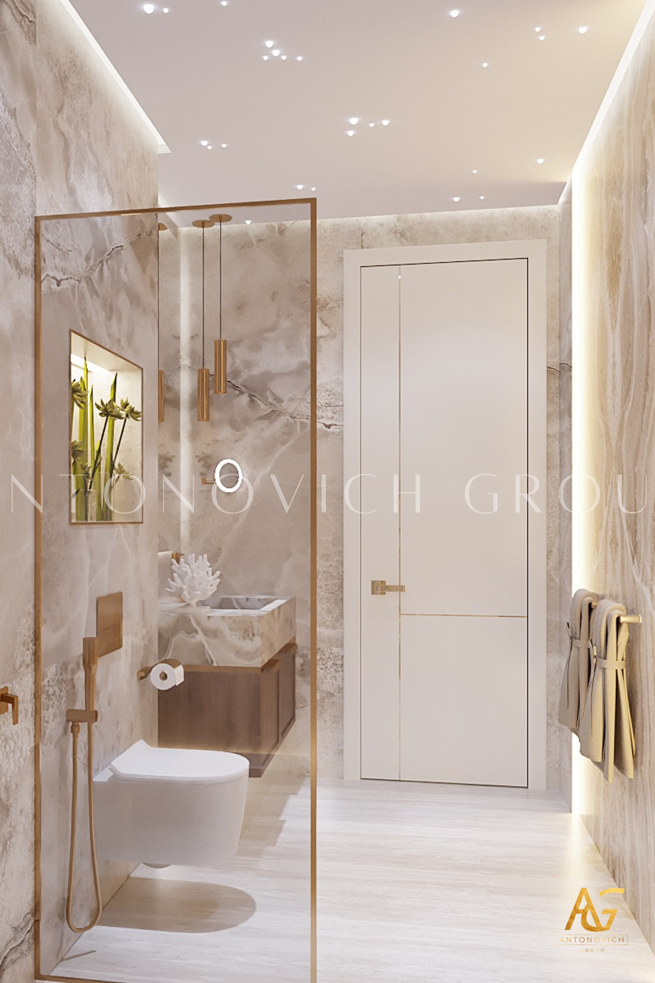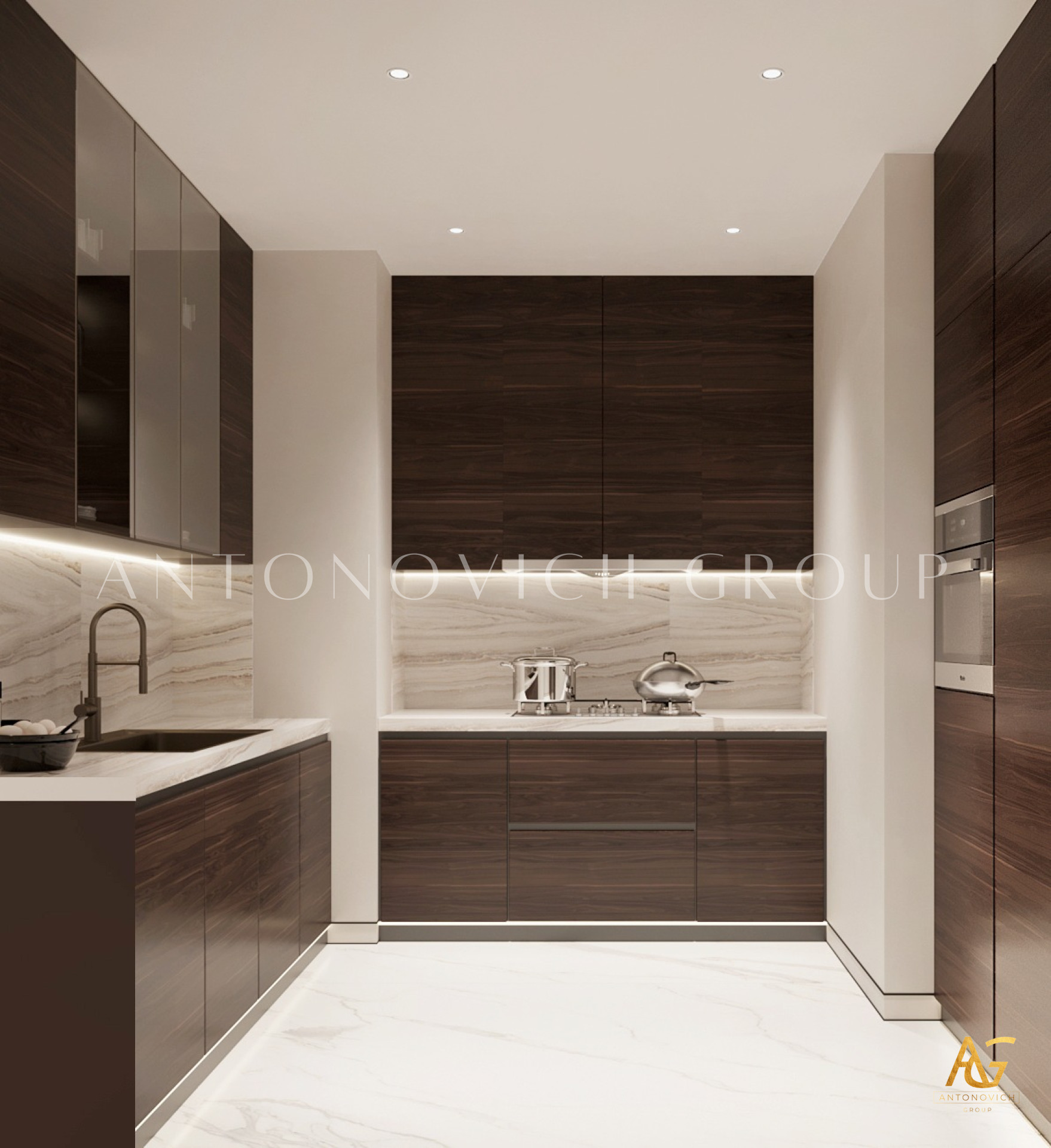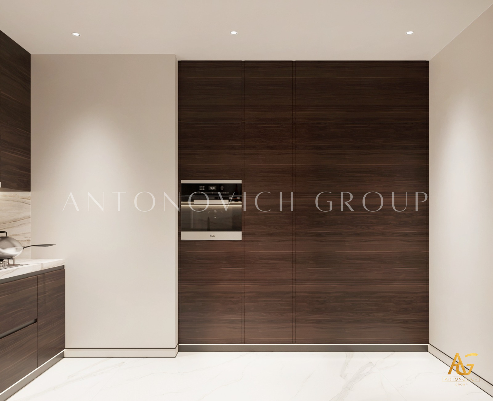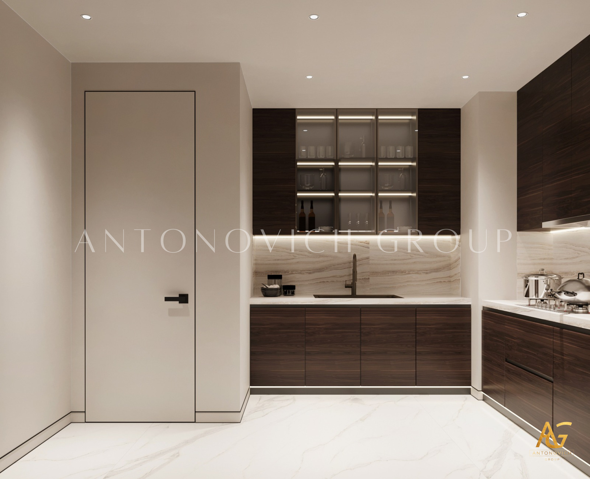 The renovation process focused on maximizing both space and light, with strategic architectural modifications that enhanced the flow between rooms. Floor-to-ceiling windows were fitted with elegant drapery that frames the stunning Dubai skyline, while custom lighting fixtures create ambiance throughout the day. The kitchen and bathroom spaces underwent complete transformations, featuring state-of-the-art appliances and premium fixtures that blend seamlessly with the overall design aesthetic. Smart home technology was integrated throughout, offering residents modern convenience without compromising the apartment's elegant appearance. This project exemplifies Antonovich Group's ability to deliver world-class interior solutions that meet the sophisticated tastes of Dubai's luxury property owners, creating spaces that are both visually stunning and perfectly functional for modern urban living.