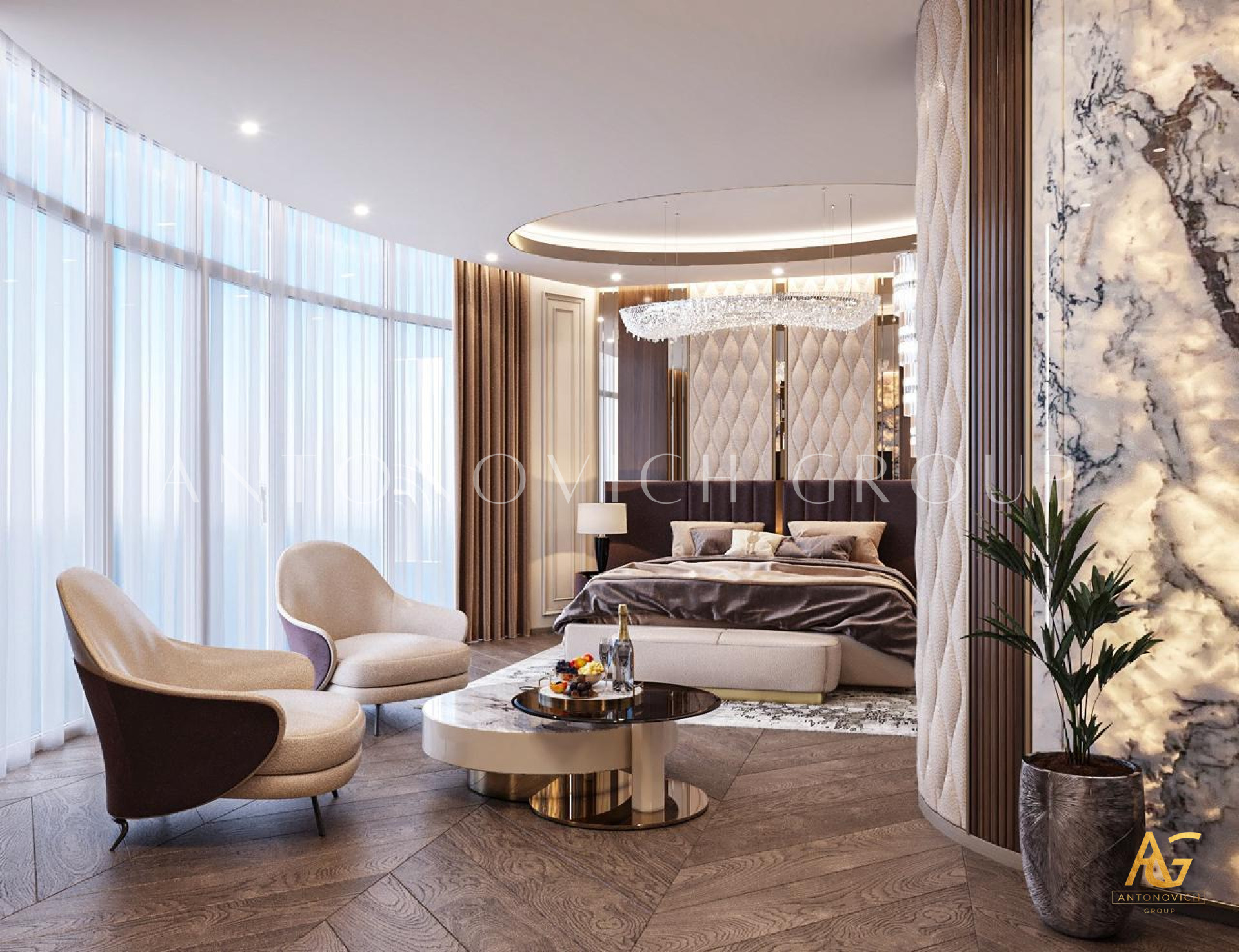 Charming sketch "cream chocolate" is reflected in the author's bedroom design project from studio Luxury Antonovich Design. A delightful blend of contemporary style with Art Deco accents filled the relatively small space of the cozy bedroom. Interior designers brilliantly combine shades, textures and materials, achieving a unique and expressive images in their work. The tenderness and charm of the interior harmoniously follows the tenderness and the charm of the hostess of the bedroom. The basis of the composition of the luxurious interior is a large comfortable bed. The base and headboard of the bed is upholstered in soft velvet of cream shade. The high upholstered headboard embraces the bed as if stretching almost to the entire width of the wall. On this bright background silk pillows and bedspread of milk chocolate color look brighter and juicier. The interior is filled with harmony and purity of lines. Curtains design elegantly repeats motives of bed decoration. Creamy silk curtains are trimmed with wide chocolate piping. Wall decor behind the headboard in the bedroom interior brings a bright and festive mood. Boiserie is filled with textile wallpaper with lace ornaments. Lines of mirrors shine under light of elegant chandeliers and elegant sconces. The wall opposite the bed along the entire perimeter is decorated with soft upholstered wall panel of a noble velvet. This decor complements the interior with softness and warmth, and is one of the ways of sound insulation. The bedroom interior design is for sophisticated and refined nature.
