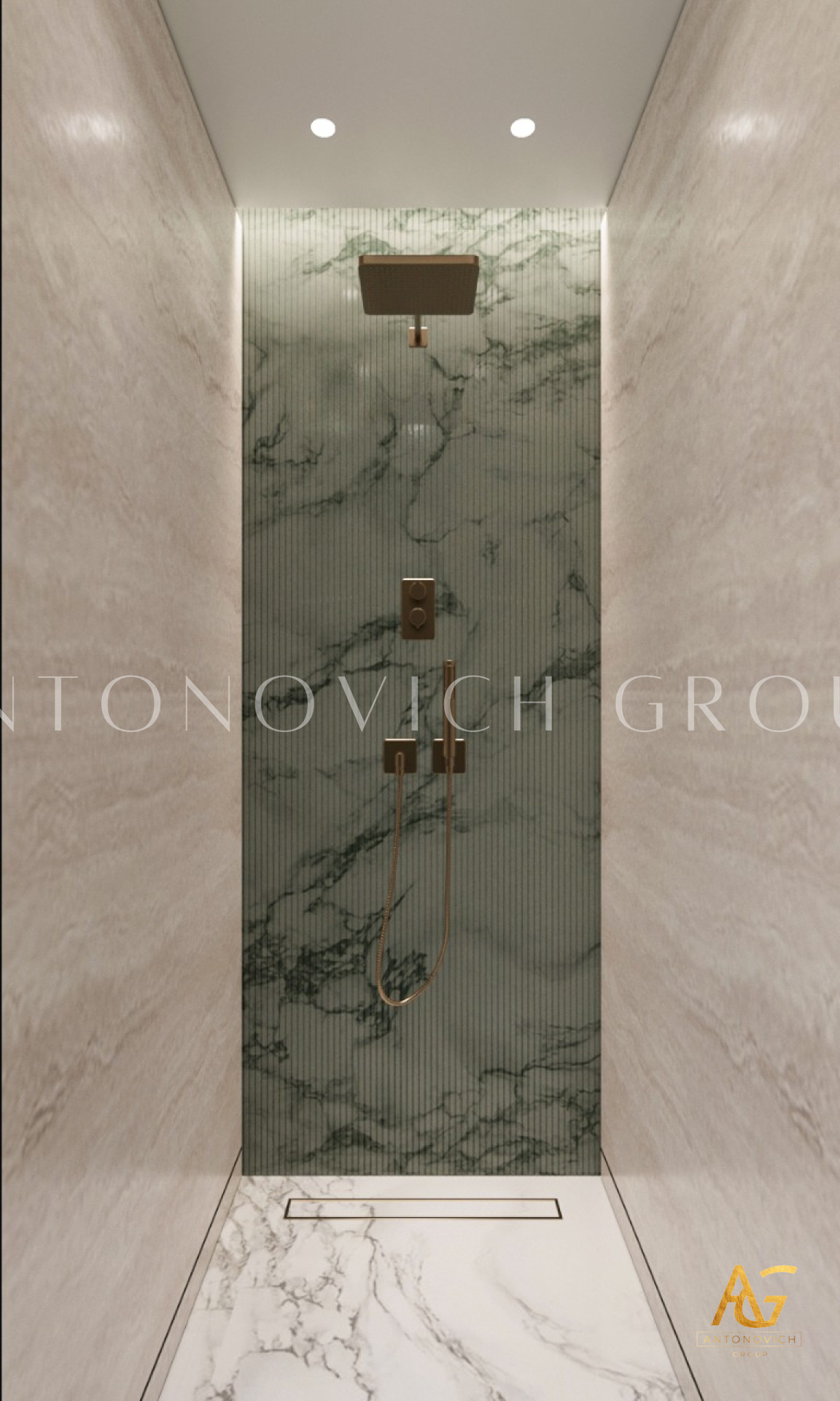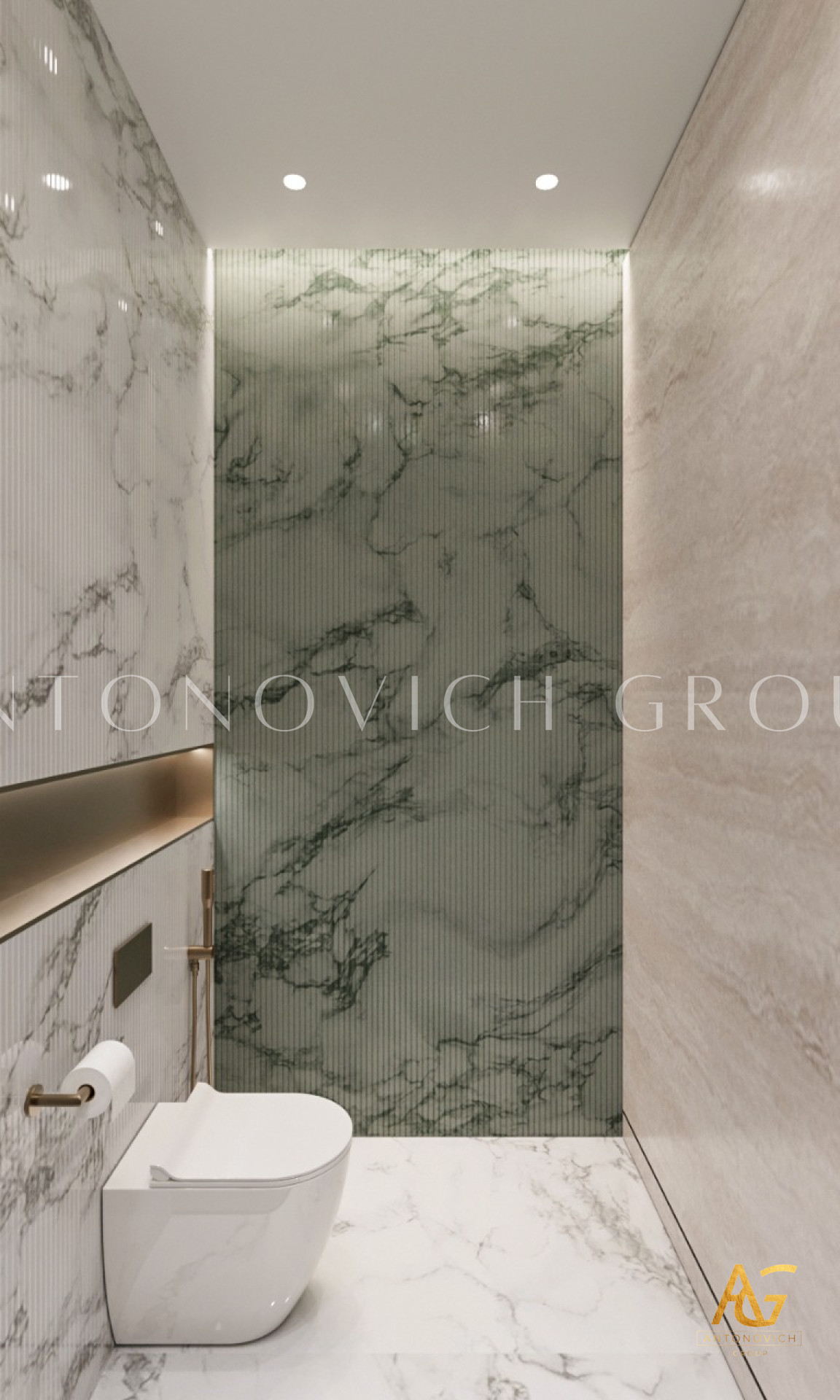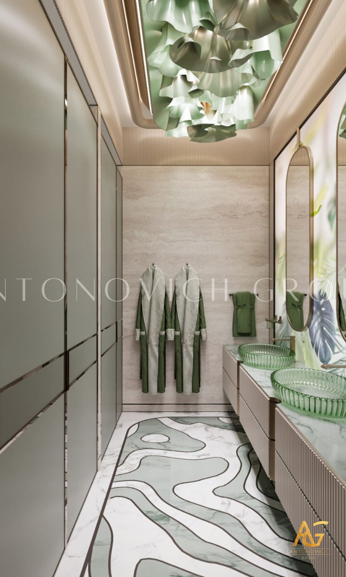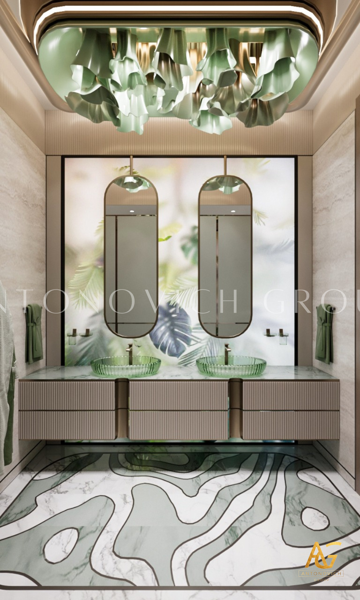 Large area of the bathroom opened space for creativity of designers. House Design Abu Dhabi is a graceful interweaving of classical, elegant and modern style. The interior looks very festive and cozy at the same time. The large windows have curtains of precious silk. Interior Designers Abu Dhabi actively used in the authors project methods of modern bathroom lighting. Blue LED lines bring to the interior a sense of dynamics and power of vigor. Luxurious oval tub is decorated with mosaic tiles and raised on a low podium with steps. Shower with clear glass doesnt load the interior. Bathroom design sets a nice romantic mood. Massive crystal chandelier looks magnificently and solemnly.
