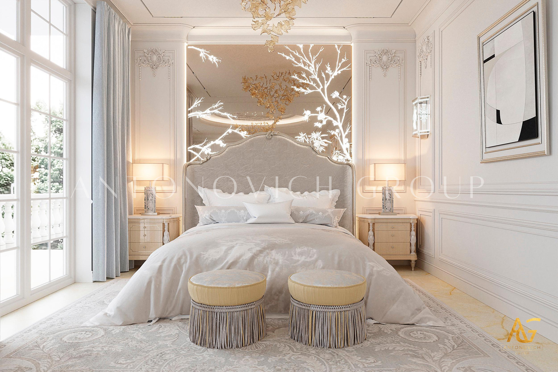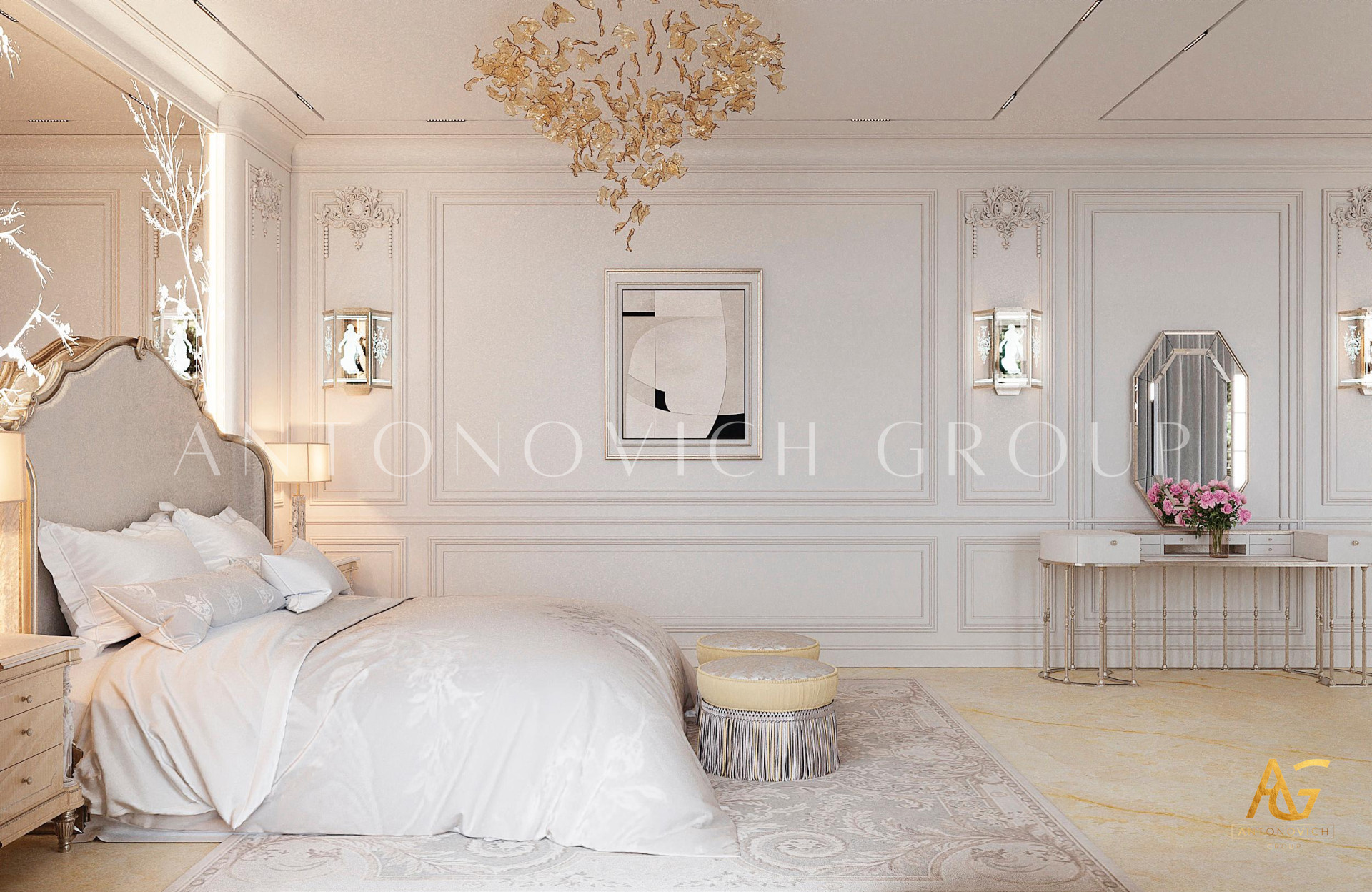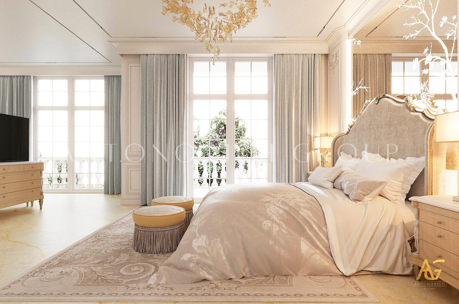 Excellent choice of bedroom interior in modern style was designed for one of the luxury hotels. The hotel interior design fully emphasizes its respectability and high status. The luxurious and lavish decoration of the hall of the hotel succinctly gets into comfortable rooms and stylish apartments. Bedroom interior design aims to give hotel guests the feeling of absolute comfort and complete feeling of warmth of home comfort. Interior designers Dubai skillfully arranged accommodation space and its architectural layout. The highlight of the interior became panoramic windows. This feature has become the basis of their design. Curtains design is in harmony with both the design concept of the interior, and the peculiarities of the windows configuration. For this interior Roman blinds of thick silk of milky color fringing ultramarine fit perfectly. In the wall decor stylish wallpaper of two contrasting shades of cream and brown look elegant. Bedroom interior design has a cozy mood, as well as ergonomics and functionality. For convenience of guests there is a working space with a desk and a comfortable chair. A large wardrobe with glossy facades perfectly fits into the interior. Natural wooden floor, and soft carpet look home-warm and cozy. Stylish interior in a modern style with touches of minimalism sets a pleasant and comfortable stay. Interior lighting at night is provided with several modern ceiling lights. And in the daytime, luxurious curtains can optionally be adjusted with the remote control.