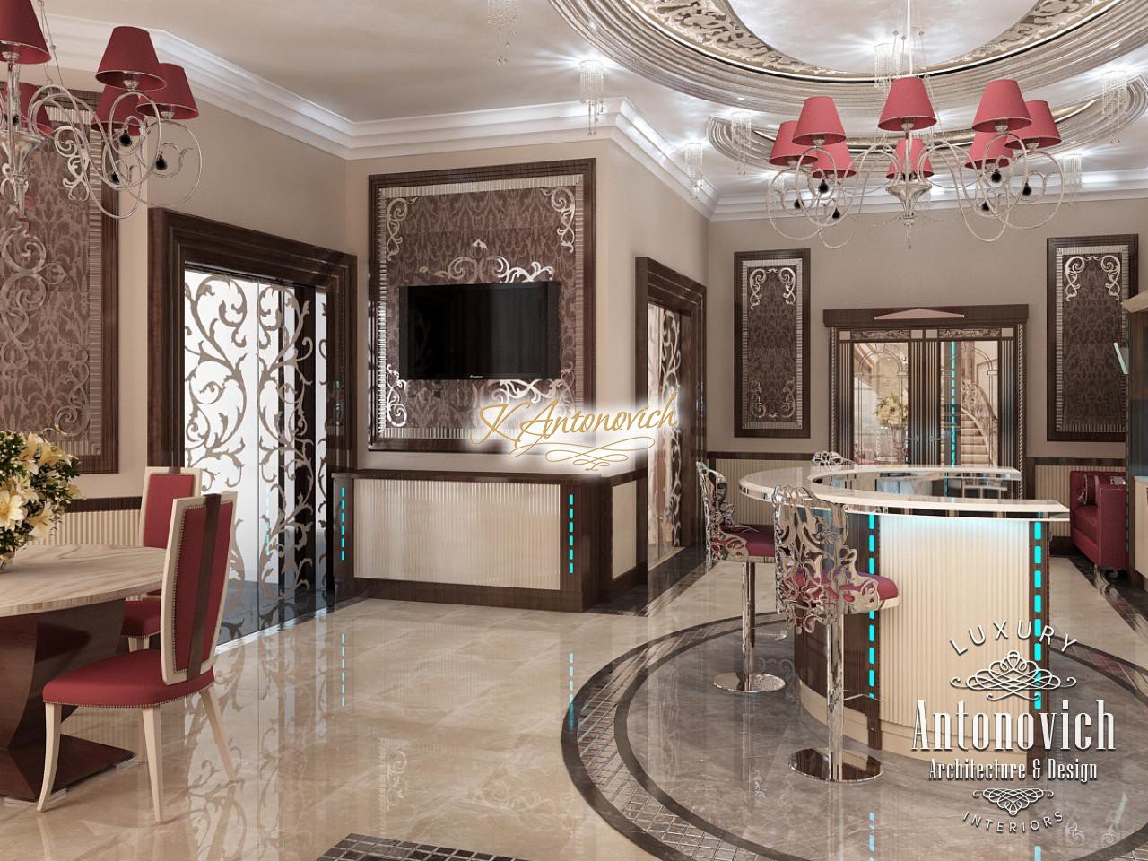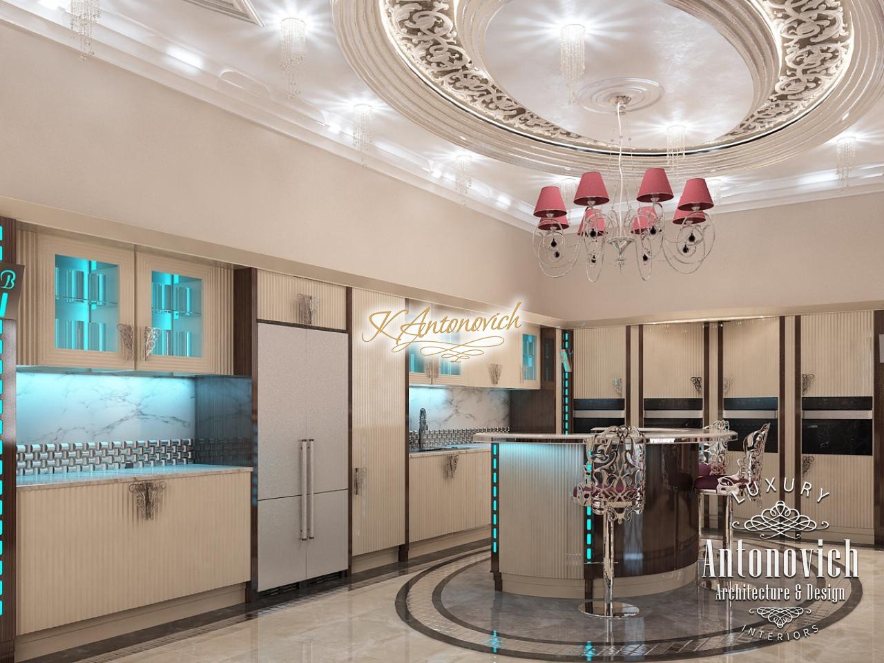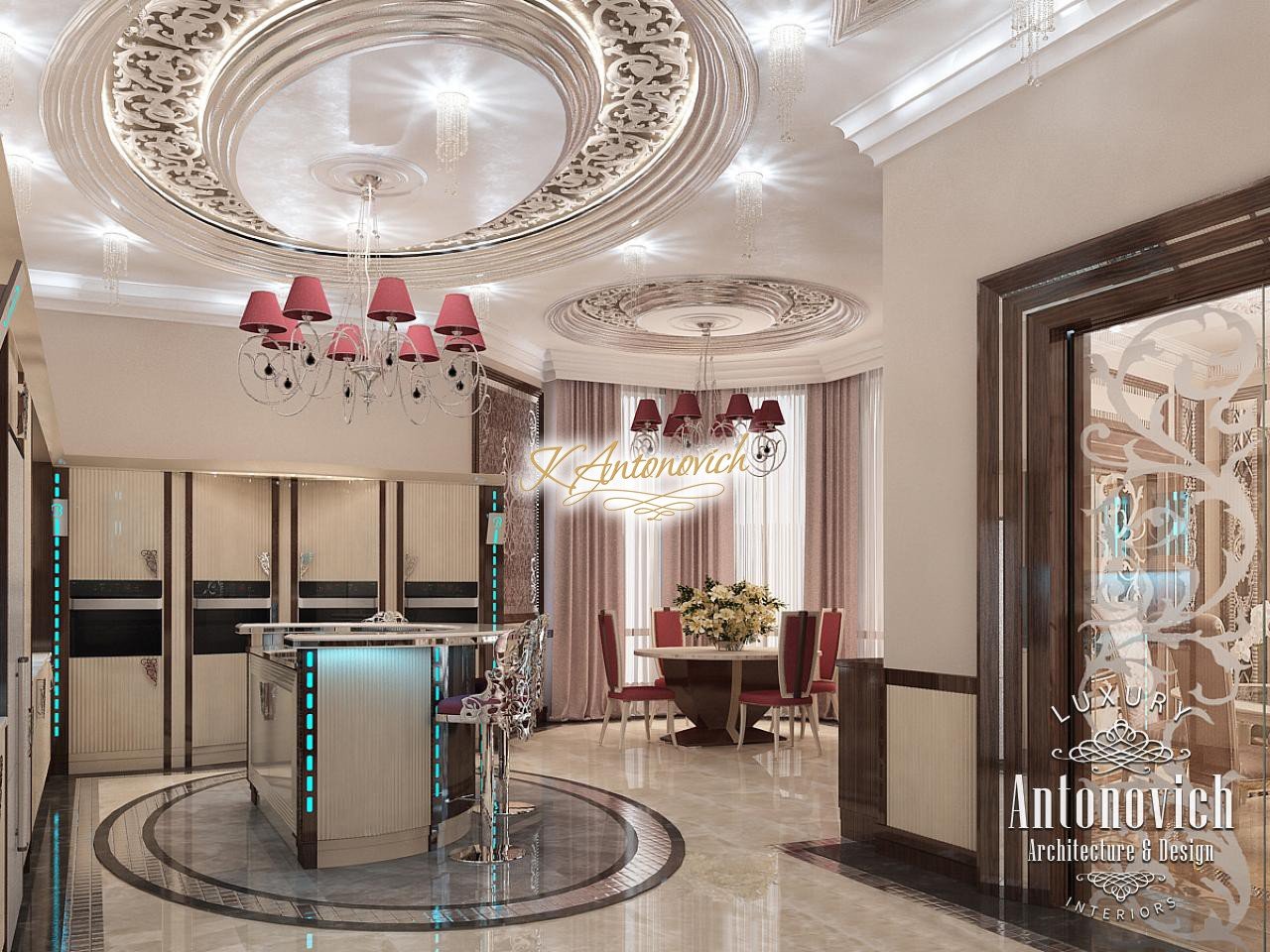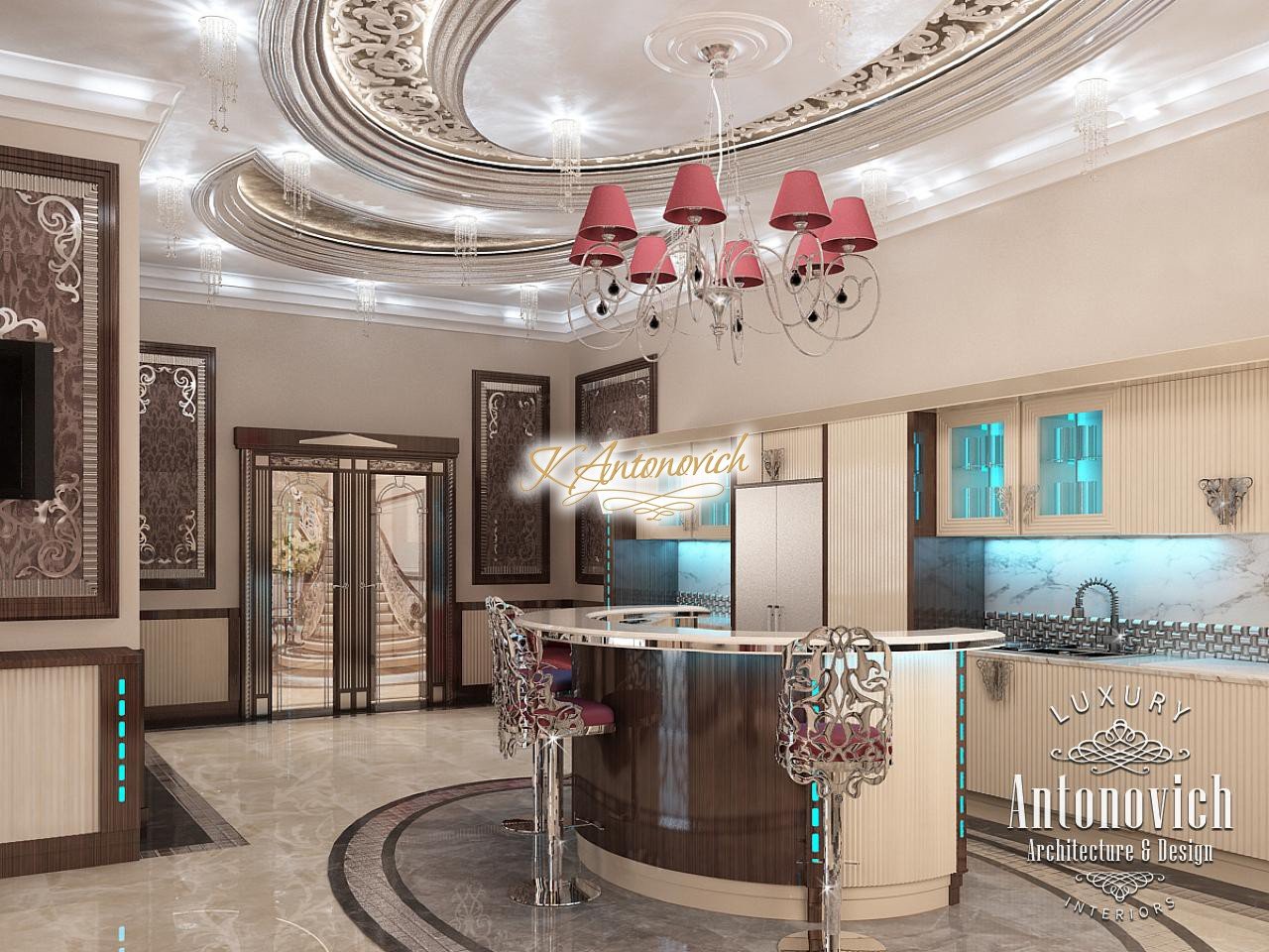 Once again, we invite you to look into the future of luxury and comfort. Modern style with its laconic features complemented by a few bright accents of art deco. Apartment design in Dubai reflects the modern character of its owners, their love for the new and ready for bold experiments. Quite spacious luxury apartment allowed to implement fully all design ideas. Kitchen interior design is closely connected with dining room design. The kitchen and living room divided by stylish glass sliding system with exquisite patterns. Smooth glossy facades of kitchen furniture in plain pastel colors elegantly conceal the latest storage systems and kitchen appliances. Interior Designers Dubai actively used LED lighting in the project to accent and make the kitchen interior more expressive. Elegant kitchen interior accent became bar surrounded by high metal chairs with carved backs. To enhance the image of a bright interior designers complement the kitchen interior with bright ceiling decor. Oval niche with exquisite decor and lighting in the center are decorated with ornate wrought-iron chandelier with curls and bright shades. Sophisticated, stylish and bright kitchen interior design expresses the integrity of the entire design concept of luxury apartment interior.