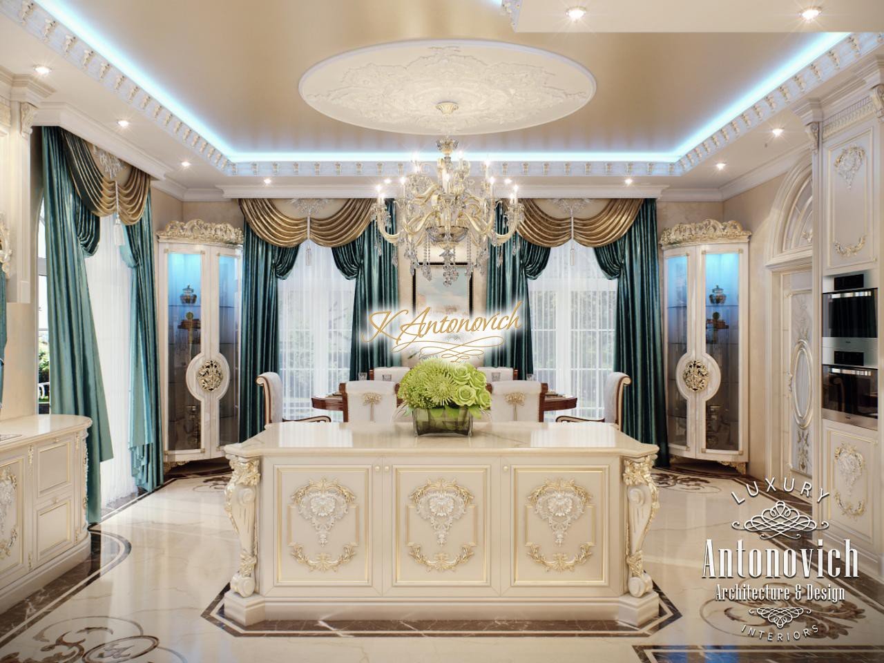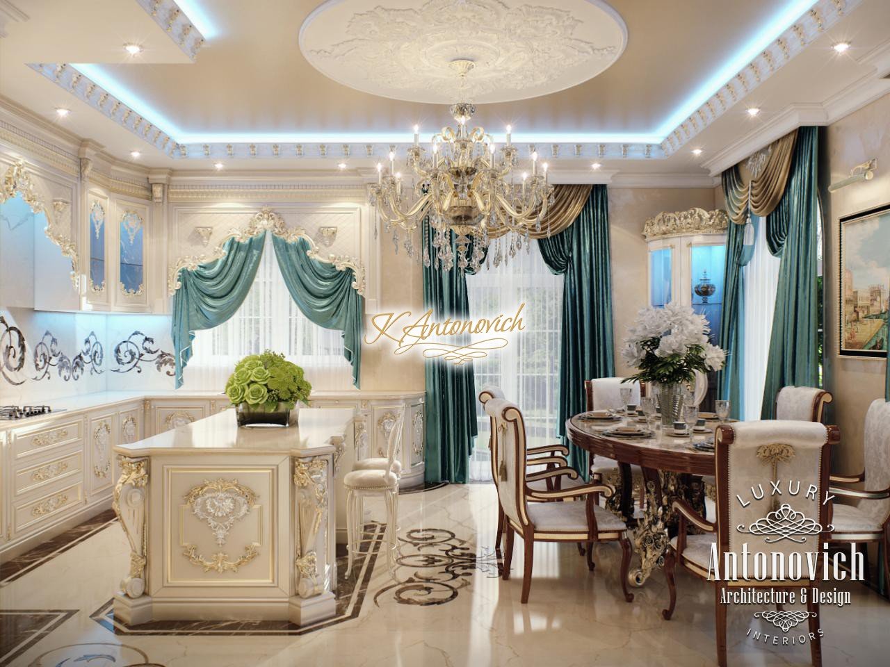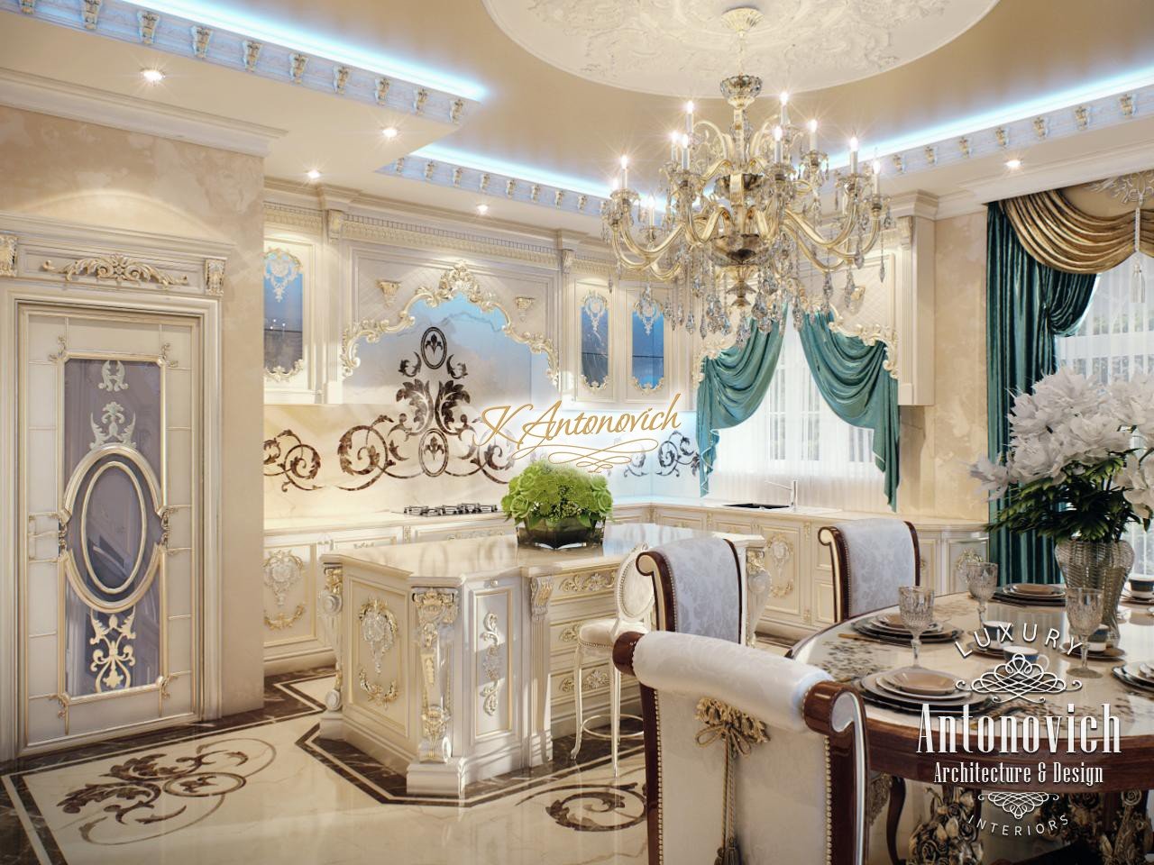 Kitchen design in classical style harmoniously continues expressive and beautiful image of the villa interior. Villa design Dubai is a luxury with a touch of respectability and a slight romantic mood. The space of the kitchen and dining area is a single entity. One of the main emphases of interior luxury and respectability became elite furniture. Furniture made of wood, which is painted in milky-white color, exquisitely inlaid with carved decor. Fragments of carved decoration are covered with gold leaf, making the interior especially luxurious. Interior designers Dubai repeated motives of carved decoration in carved marble ornaments on the floor and in the kitchen splashback|. This technique makes the kitchen interior harmonious and complete. Floor design in invariably luxurious interiors from design studio Dubai Luxury Antonovich Design is an excellent way to zone the space. Interior Designers Dubai use marble of different shades and patterns that define the boundaries of the interior zones. Ceiling design in this project became a uniting point. The ceiling is decorated with elegant classical chandelier, which complements the stylish line of LED backlight. Bright and juicy accent in the kitchen interior design became curtains. Gorgeous silk of emerald color looks very bright at the background of ivory kitchen furniture.