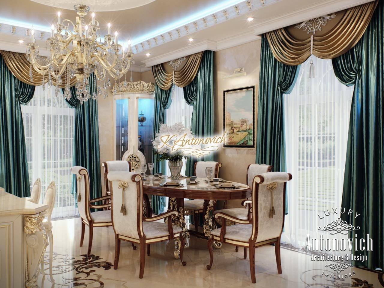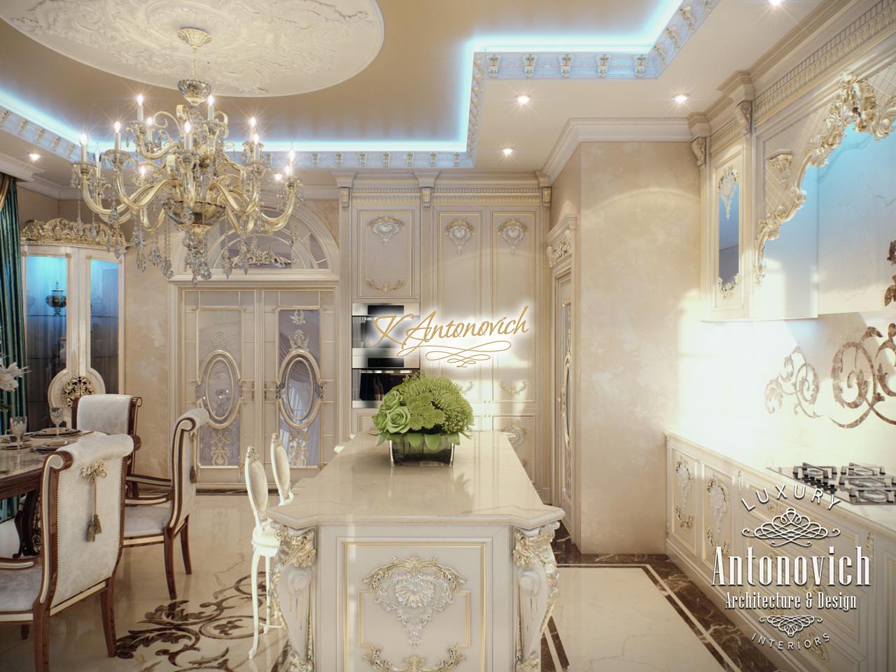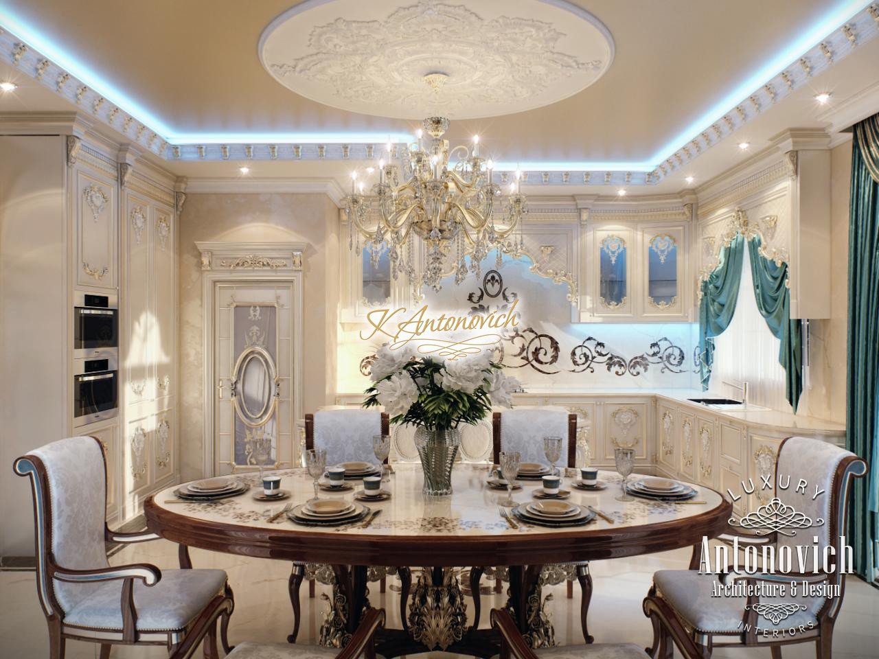 Kitchen design in classical style harmoniously continues expressive and beautiful image of the villa interior. Villa design Dubai is a luxury with a touch of respectability and a slight romantic mood. The space of the kitchen and dining area is a single entity. One of the main emphases of interior luxury and respectability became elite furniture. Furniture made of wood, which is painted in milky-white color, exquisitely inlaid with carved decor. Fragments of carved decoration are covered with gold leaf, making the interior especially luxurious. Interior designers Dubai repeated motives of carved decoration in carved marble ornaments on the floor and in the kitchen splashback|. This technique makes the kitchen interior harmonious and complete. Floor design in invariably luxurious interiors from design studio Dubai Luxury Antonovich Design is an excellent way to zone the space. Interior Designers Dubai use marble of different shades and patterns that define the boundaries of the interior zones. Ceiling design in this project became a uniting point. The ceiling is decorated with elegant classical chandelier, which complements the stylish line of LED backlight. Bright and juicy accent in the kitchen interior design became curtains. Gorgeous silk of emerald color looks very bright at the background of ivory kitchen furniture.