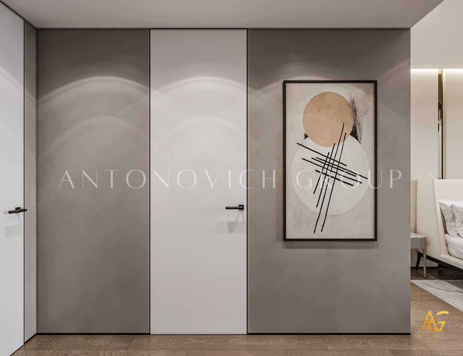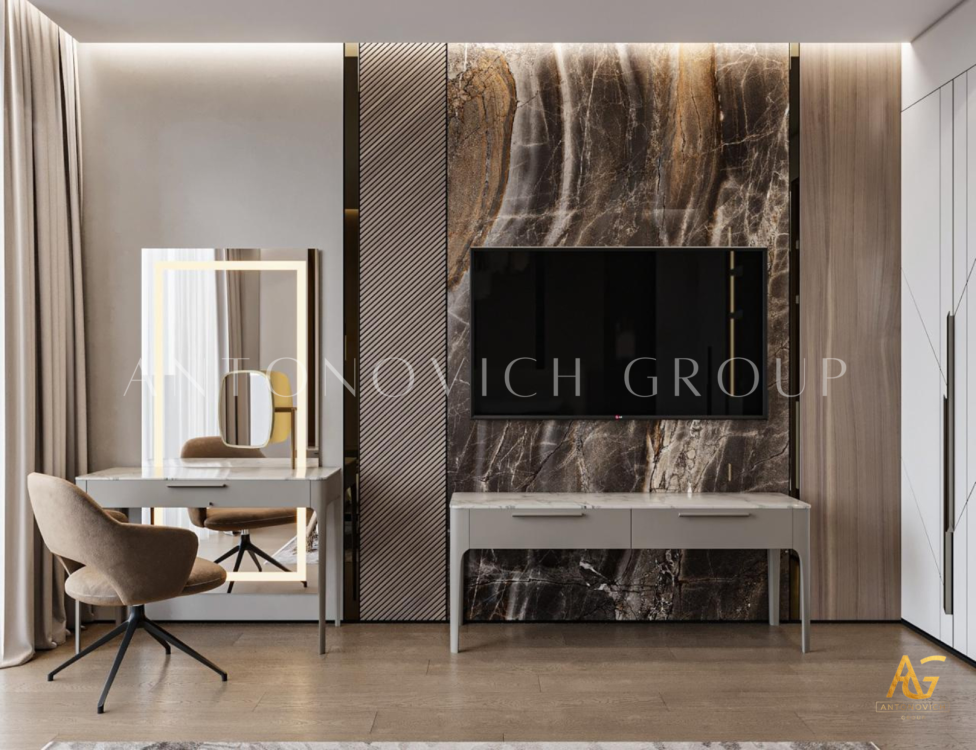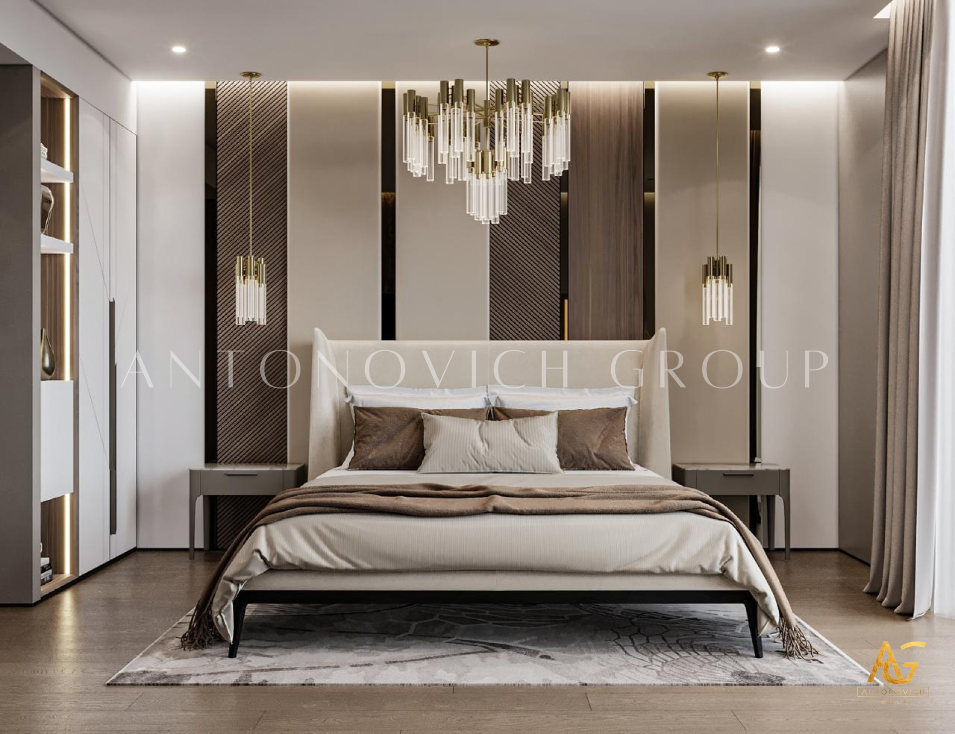 Wonderful moments when you fully immersed in moments of serene relaxation, sensual and aesthetic pleasure, often based on the beautiful environment that surrounds in the interior. The bedroom interior design with refined and exquisite accents became harmonious continuation of the design concept of apartment interior in Dubai. Interior designers have caught delicate motives of customers' dreams about perfect interior and bring them to a luxury apartment. Bright and passionate image of the interior is based on rich accents. One of such emphasis in the bedroom interior became curtains. A large window decorated with curtains of delicate velvet in ruby hue. They are trimmed with wide edging of cream shade and gathered in soft folds of drapery with the help of fine grabs. With such a bright and saturated image of windows decoration two armchairs, which are covered with light velvet, looks gorgeous. In the interior there is a beautiful improvisation and the game of contrasts. Chest of drawers of dark wood of valuable species is in sharp contrast with white walls. Also, the floor made of natural wood contrasts stylishly with a large carpet color. Dubai Interior designers have created a very expressive image of modern classics. Every detail is like a touch on a beautiful painting of the artist. Each element of the decor harmoniously fits into the overall picture of luxury and comfort. The warmth of home comfort is epitomized by luxury wallpaper, wall decor and luxurious decoration of the bed. Bedroom interior design is with a touch of elegance and gentility.