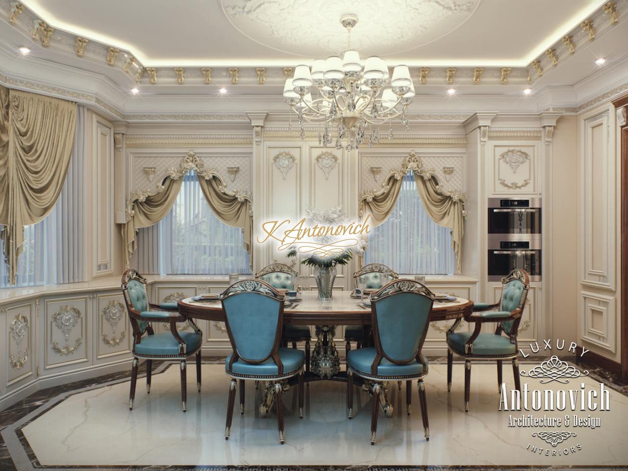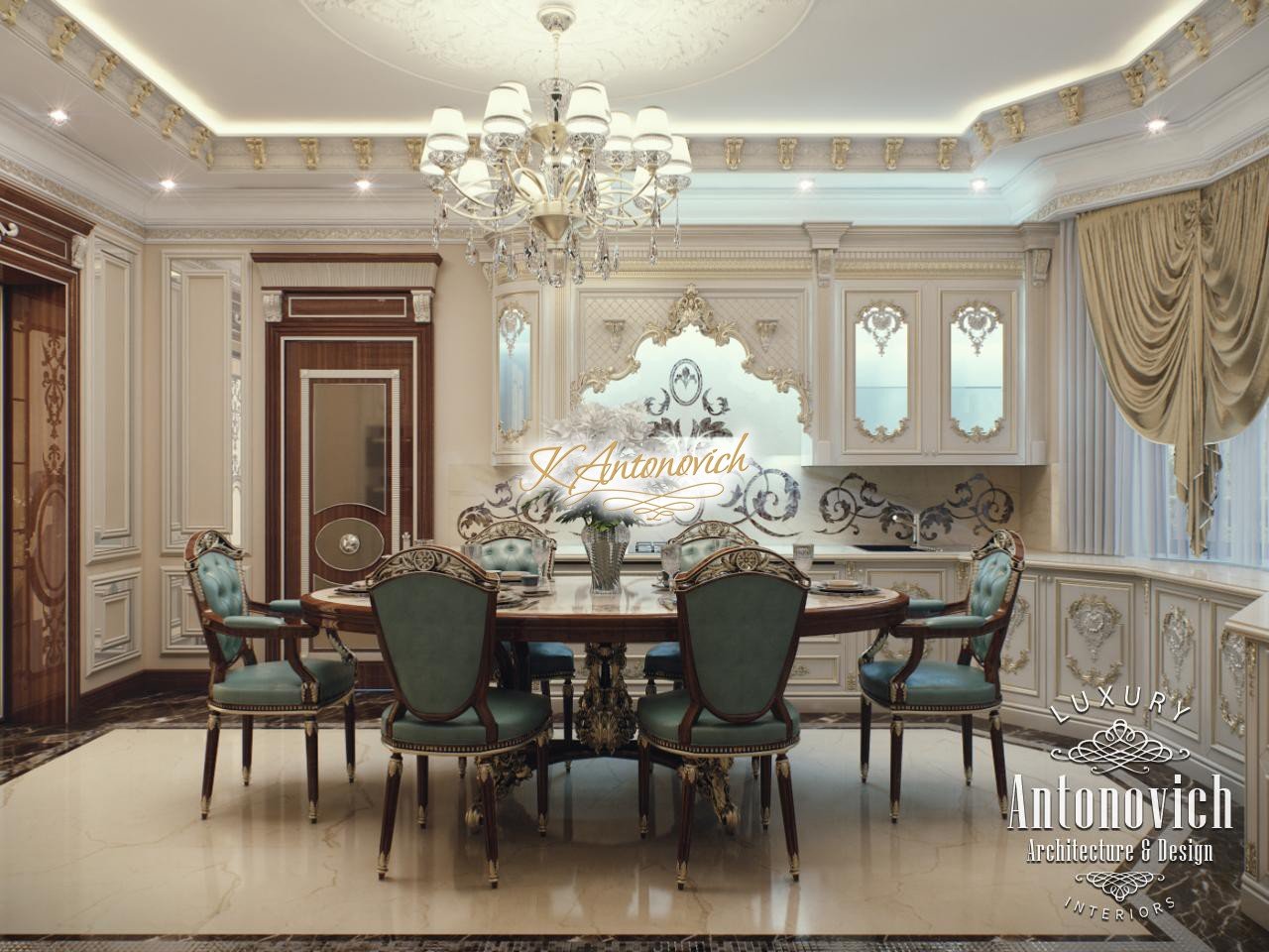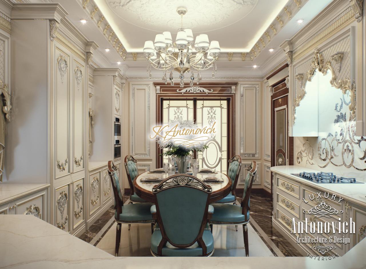 Kitchen interior design from studio Luxury Antonovich Design is a luxury image and perfectly organized space. Kitchen design always combines functionality, ergonomics and comfortable features. The interior design in classical style becomes an excellent way to reflect the respectability of homeowners and their impeccable taste. The kitchen design is full of exquisite details, which generally form solid and aesthetically perfect interior image. The interior gives a sense of aesthetic pleasure. Every detail captivates. Carved pattern on the kitchen splashback made of natural marble admirably reflects the curls of carved decoration on kitchen furniture. The ceiling design in the kitchen interior ideally suits to classical traditions. Fancy chandelier looks great surrounded by swirls of stucco decoration. The ceiling around the perimeter is outlined by exquisite moldings with gilded fragments. Ivory kitchen furniture inlaid with carved lace decoration, which is partially covered with gold leaf. On concise marble floor in the dining area furniture looks magnificently. High soft chairs with noble backs are decorated with carved decor. A large dining table is encrusted with different varieties of precious wood, carved and gilt ornaments. The window is decorated with a charming shade of precious silk.