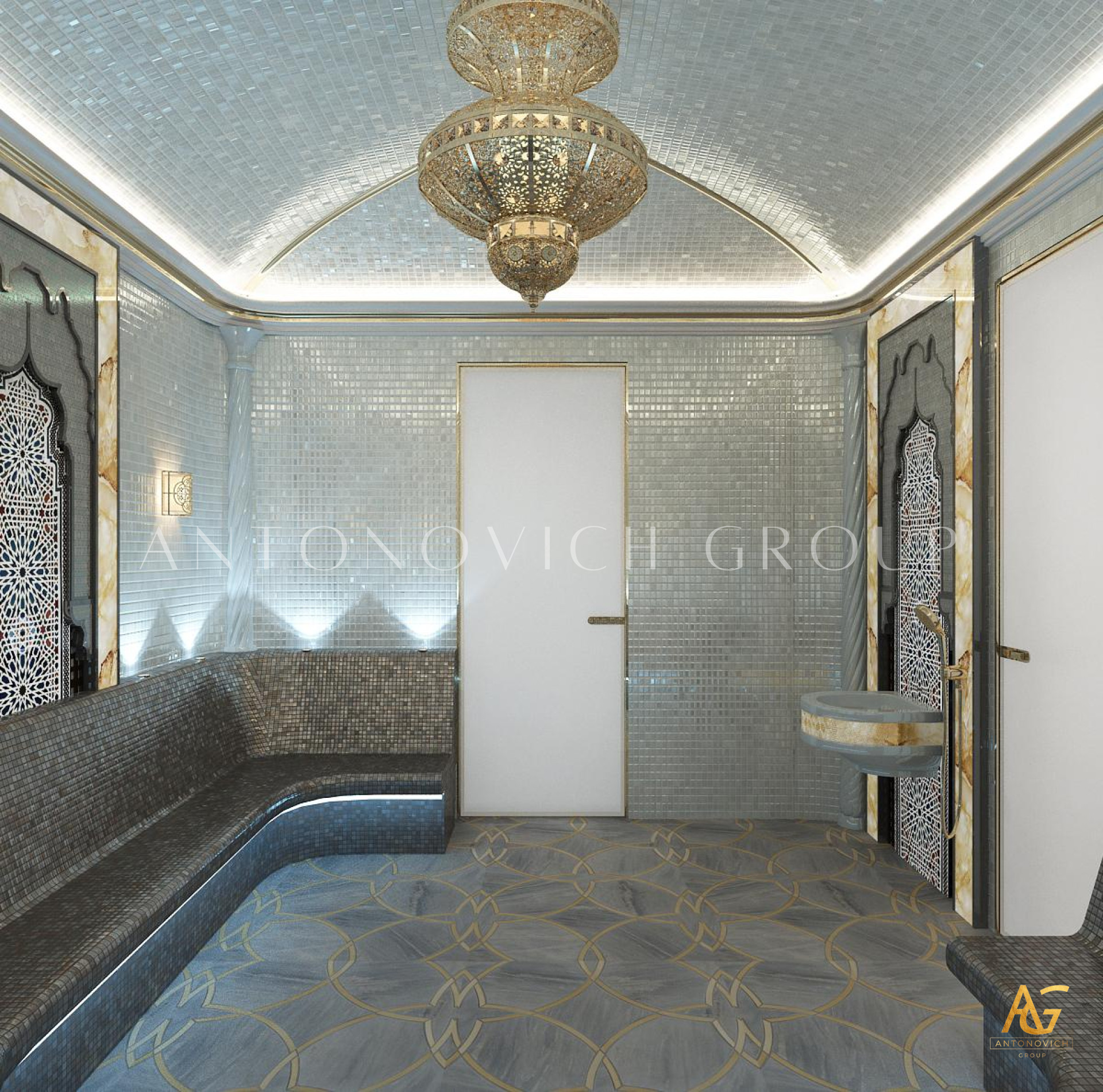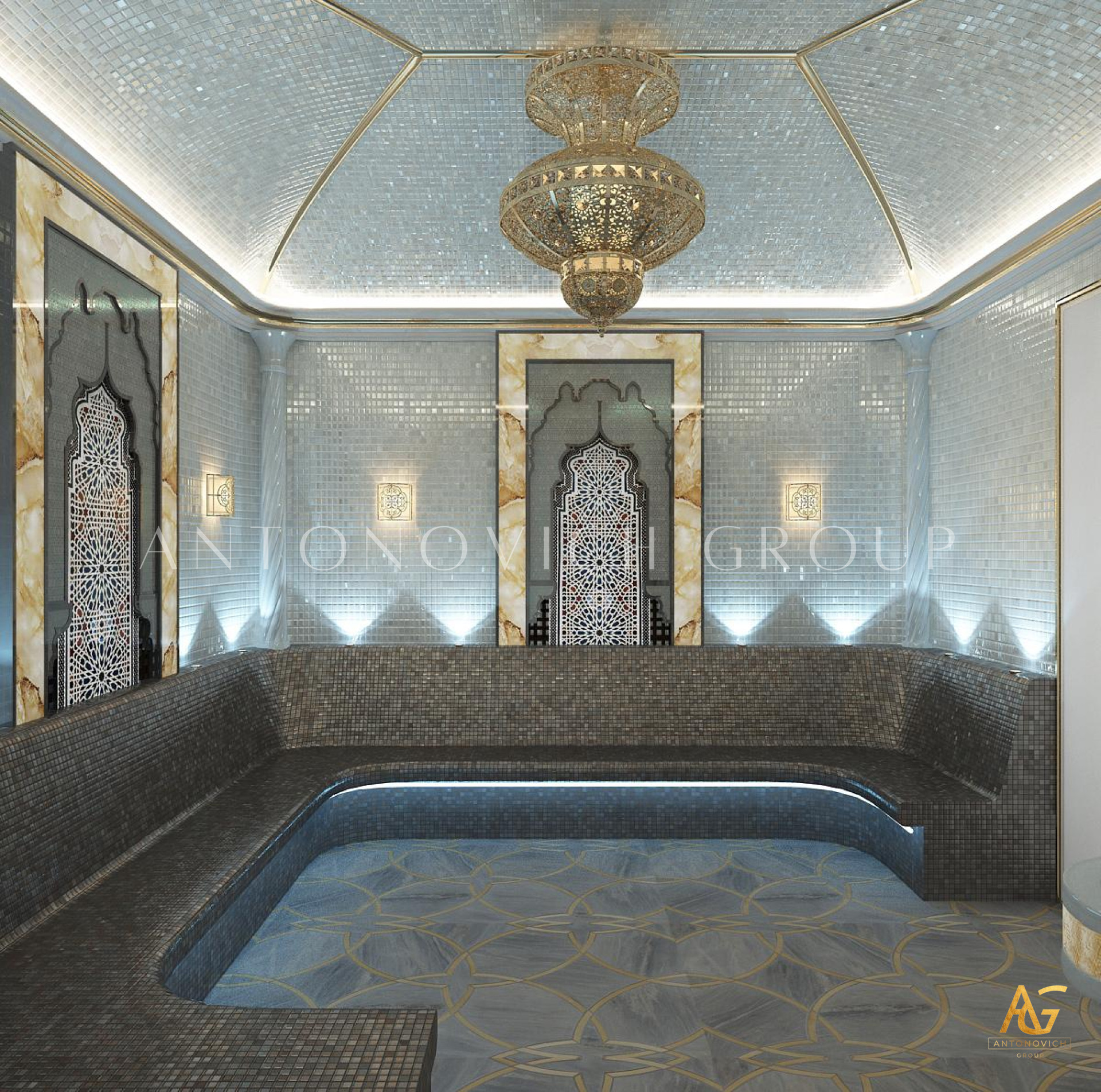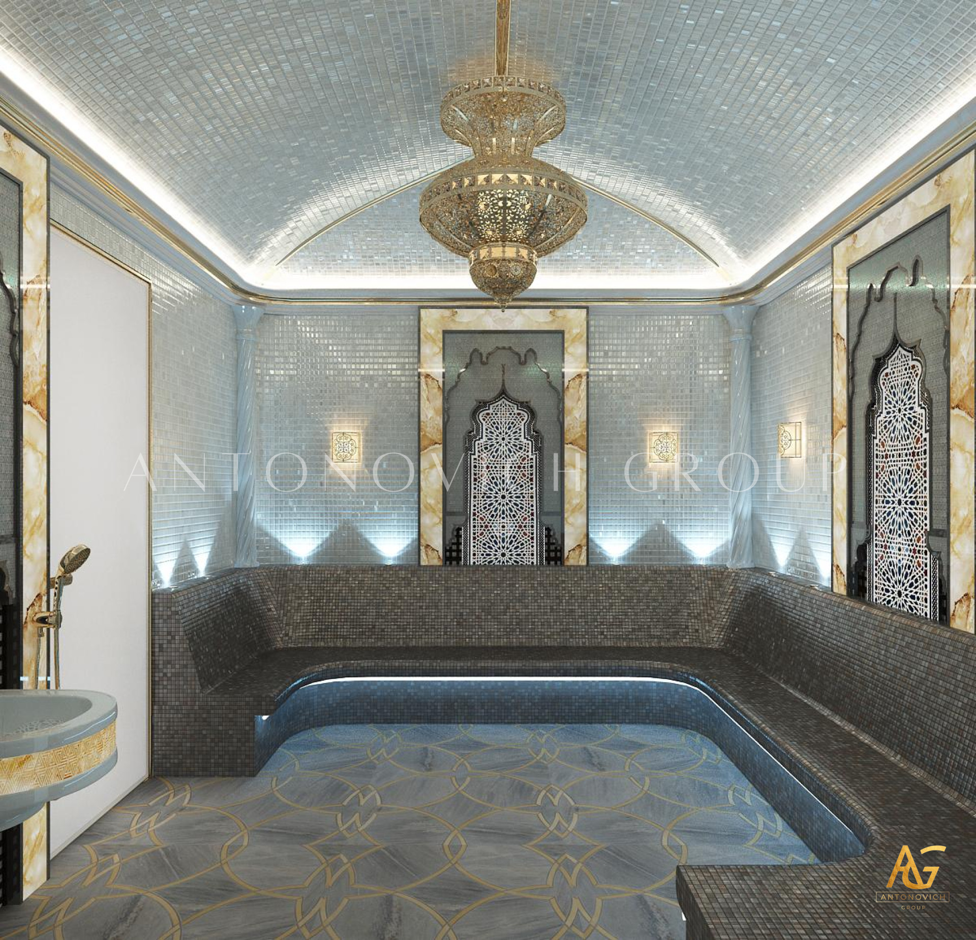 Ocean breeze, fantastic holiday magic mood. Interior Designers Dubai offered hamam design of a stunning beauty. Elite design UAE fully meets the highest standards of luxury. The interior design is maintained in a hammam, in association with the beautiful waves of the depths of the seas. A quamarine colour palette and artistic murals on the walls depicting the surface of the water and the raging waves contributes to this. Design Studio Luxury Antonovich always offers unique solutions and home owners are pleased with the author's refined decor. The floors and pool deck are decorated with flowery ornaments. In the walls decor graceful columns with gilded stucco capitals and exquisite sculptures look great.