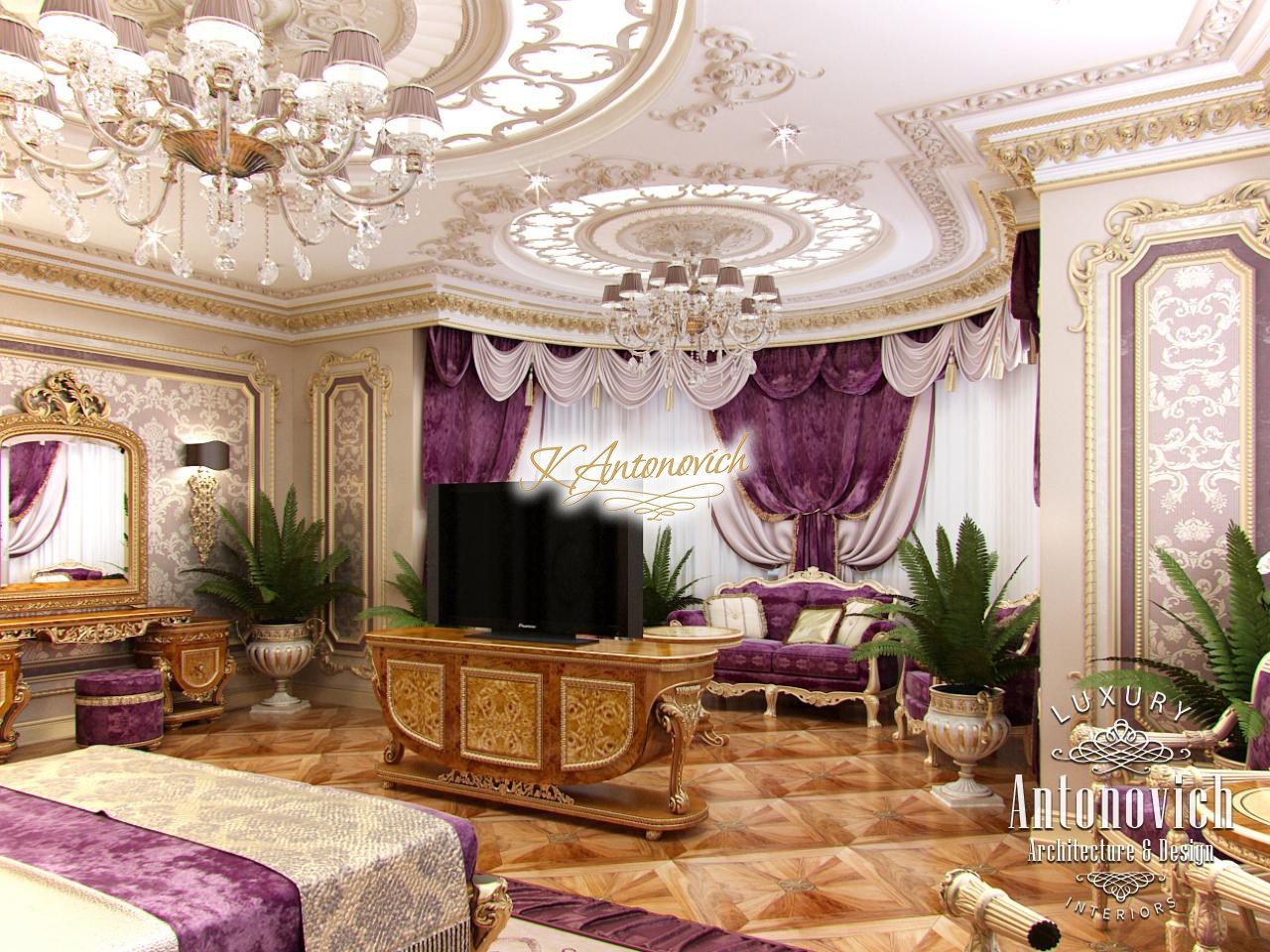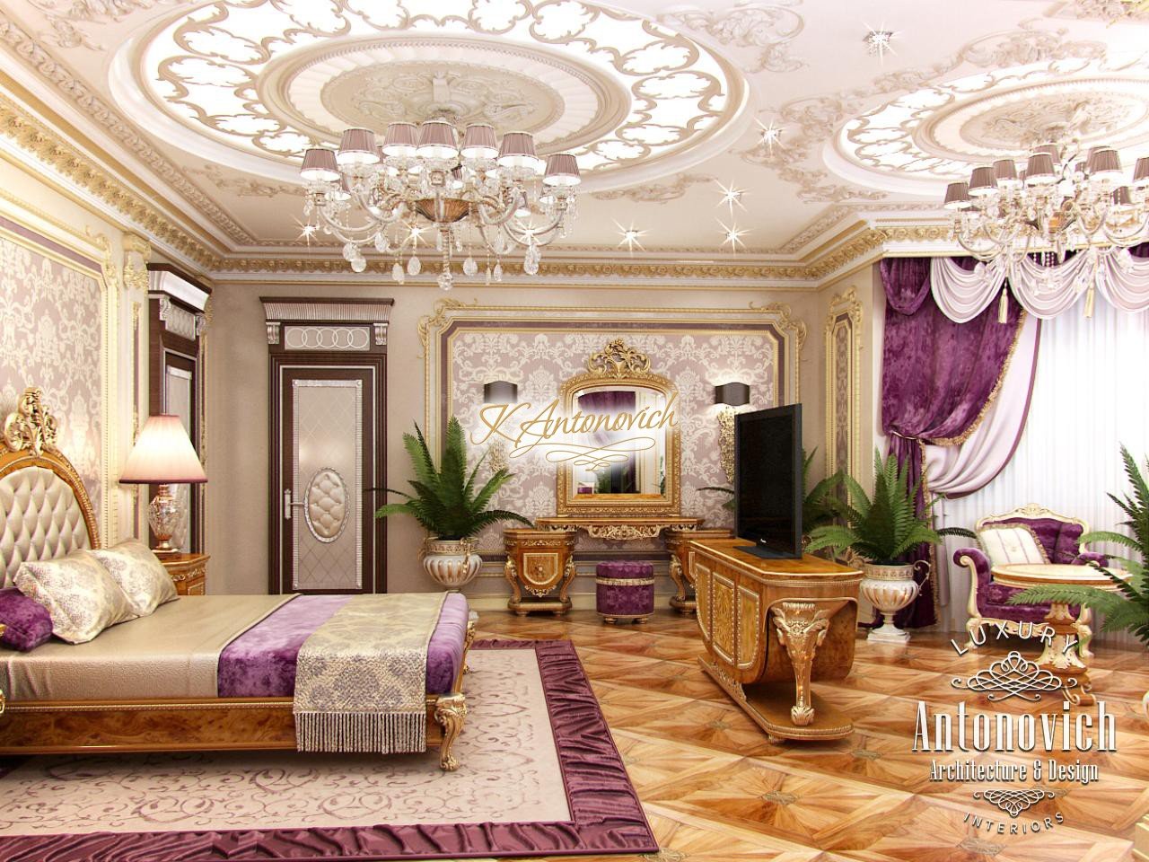 Like in the Garden of Eden under gentle sunlight, surrounded by flowering landscapes. Such association is brought by this delightful and luxurious bedroom interior from the studio Luxury Antonovich Design. We invite you to enjoy the contemplation of these beautiful apartment and feel the power of beauty and grandeur. Every year, talented interior designers of the studio Luxury Antonovich Design create unique beauty interiors for the valued customers around the world. Each project is unique as each of our customer is unique. This author's bedroom project anticipated wildest dreams of home owners in Dubai. Bright and festive mood of the interior is set by the ceiling decoration. Particularly this detail of the bedroom interior very clearly makes it clear how much it expanded scope for creative design with the use of modern technologies. The ceiling is decorated with round niches with illumination, through the delicate curls of carved decoration. Lush ceiling image is complemented with stucco, which plays a delightfully light and shade under the light of chandeliers and additional lighting. Bright and passionate image of bedroom interior is based on rich shades of silk velvet and gold glitter. The windows are decorated with luxurious curtains of velvet fuchsia. And soft pelmets of pink hue shade. Art parquet floor fills the interior with a pleasant mood of warmth of home comfort. In this space of a holiday of luxury and comfort a refined bed fits amazingly. Furniture made of wood of valuable species with exquisite carved decoration adds the interior elegance and respectability.
