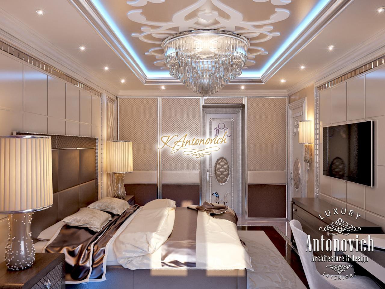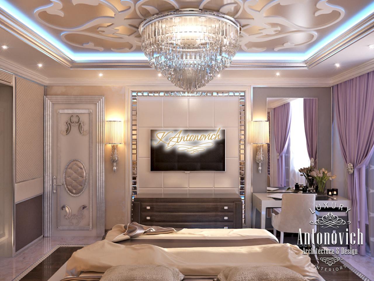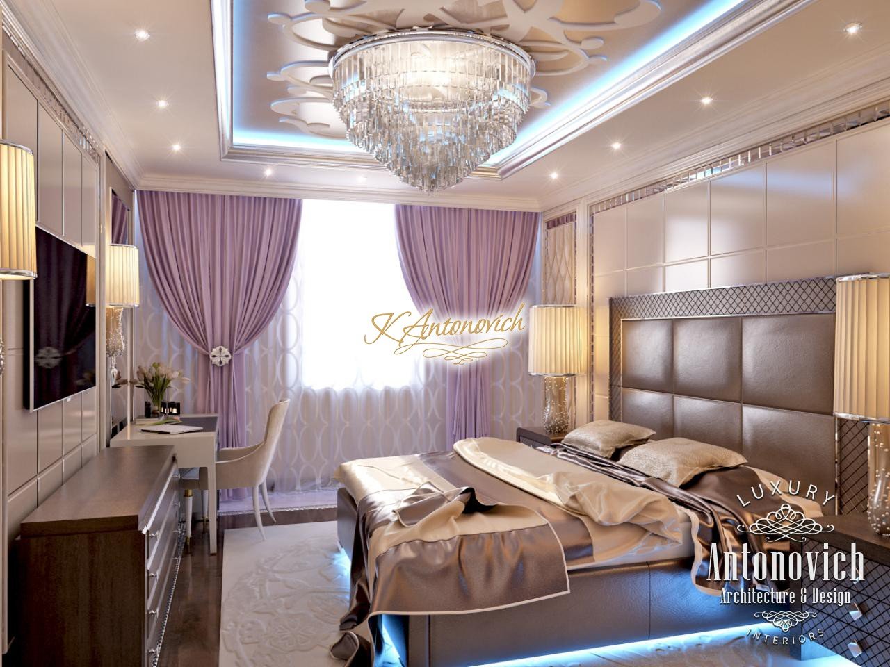 Incredibly comfortable and delicious bedroom interior in a modern style with touches of Art Deco was created by interior designers Dubai for luxury apartment. Bedroom design with a charming and seductive notes, as well as some intimate moments is intended to be as a place for the perfect rest of home owners. Apartment design in Dubai fully takes into account all the wishes of customers, largely surpassing their wildest hopes. The interior is completely dedicated to their comfort. Combinations of the usual canons and innovation are the basis of modern luxury. Absolute comfort and luxury are brought to works of the studio Luxury Antonovich Design, which give the joy of owning an ideal habitat. Bedroom interior design has a gentle accents. A small window is decorated with curtains of soft silk in purple hue, which is framed by delicate translucent tulle with a concise ornament. The highlight of the windows decoration has become stylish tough grabs as large flower buds. Luxury bed is upholstered in genuine leather of chocolate hue. Its high headboard looked harmoniously on pale beige wall. Glossy panel in wall decor filled the apartment with a little reserved and laconic mood. Furniture made of wood blends perfectly with the decor of the floor. Interior designers Dubai added traditional softness and warmth with a natural carpet in the middle of the room. To make bedroom interior more expressive and beautiful, the designers complement it with accents of lines of blue lights.