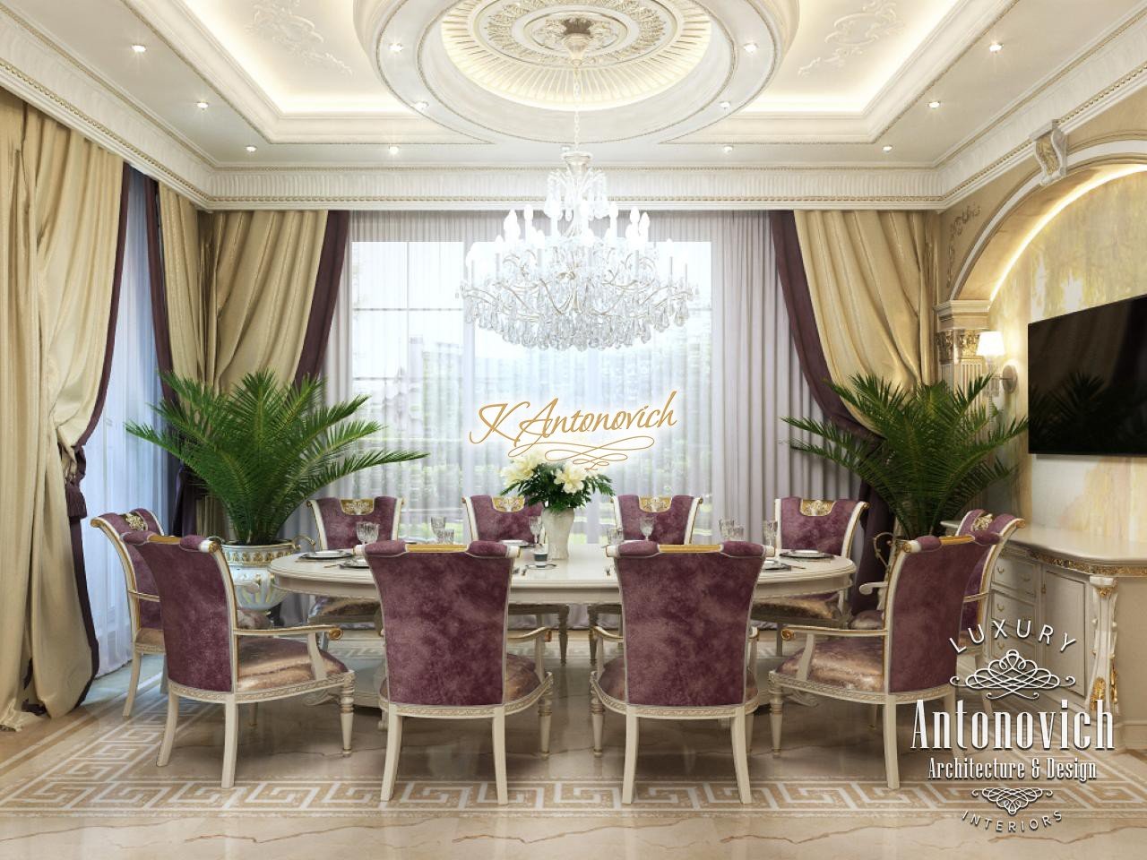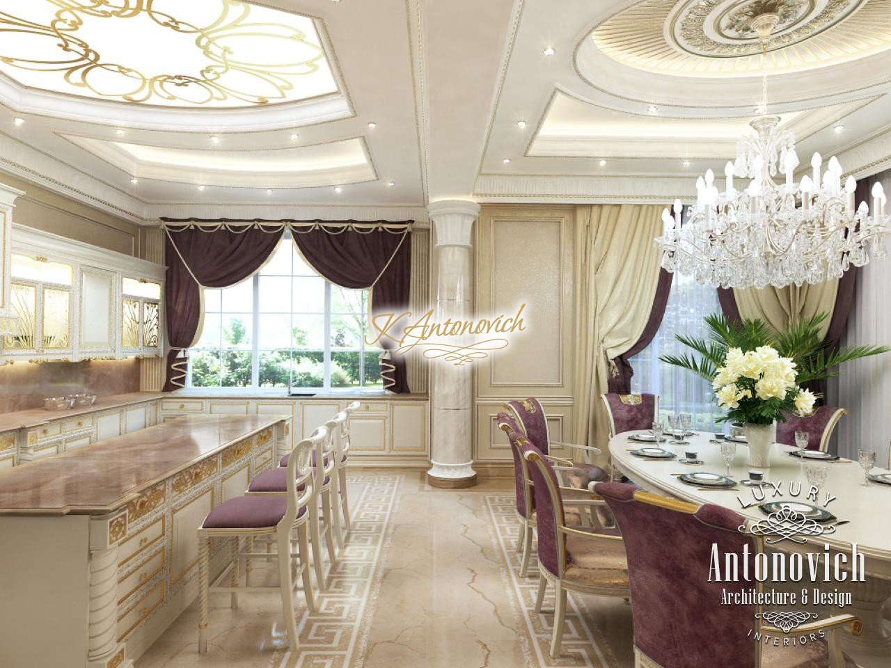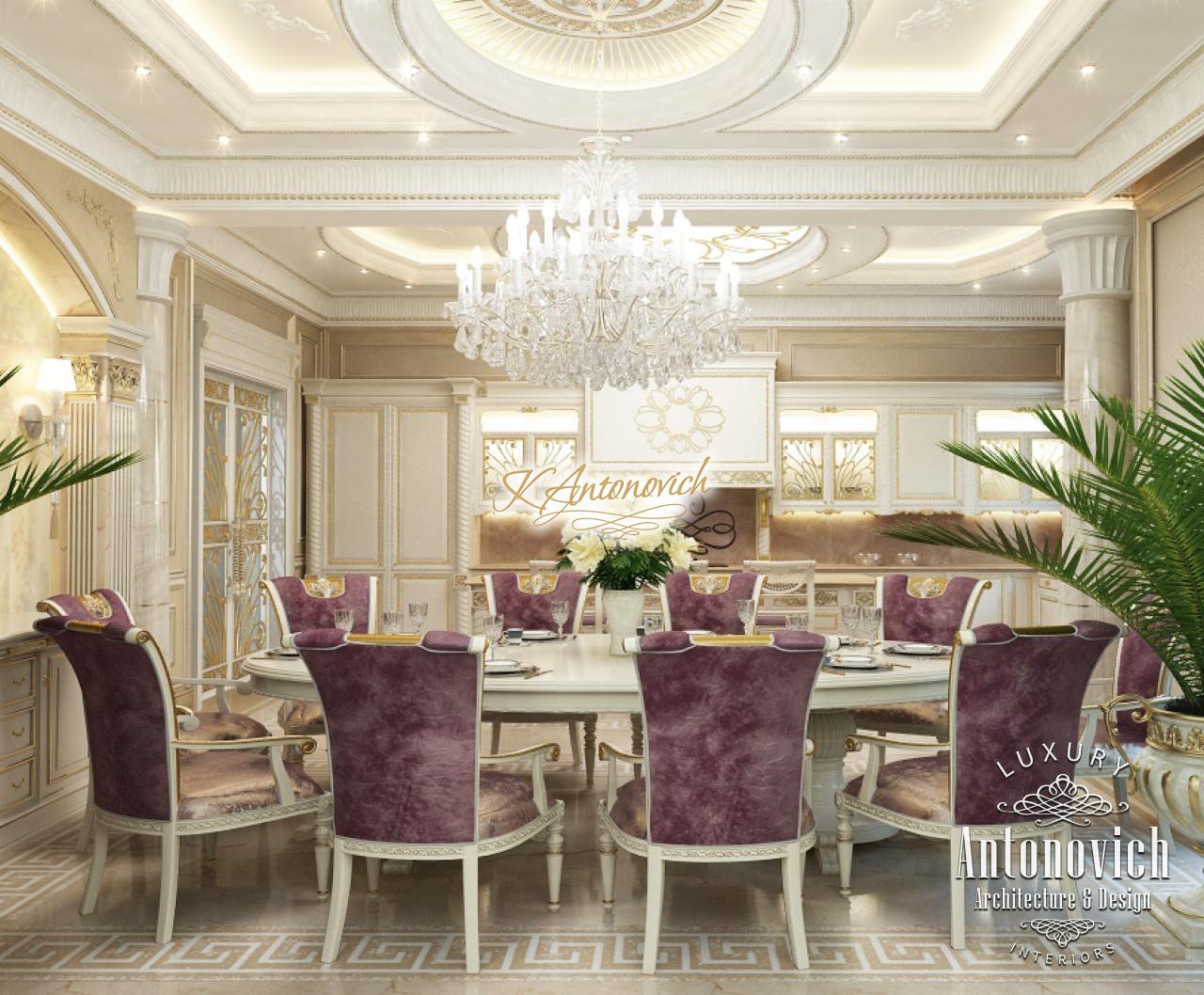 Light and sunny mood of the interior sets on pleasant emotions and fine dining. Villa Design in Dubai is in the spirit of modern classics. And each author's project of the elite interior design studio Luxury Antonovich Design here traced the perfect combination of unique author's ideas, support of traditions and trends of new technologies. Kitchen design continues the given design concept of the whole apartment. As befits a modern interior, the kitchen and dining space are combined. Interior Designers Dubai visually divided these two spaces by a ceiling decor. The ceilings complement the interior with light and romantic mood. Deep niches are fully illuminated from the inside through the graceful ornaments. Additional line illumination reinforce sunny mood of the interior. A small window in the kitchen was decorated with delicate shades of luxurious fabric of dark purple hue. Kitchen Design radiates harmony and comfort. The bright facades of kitchen furniture decorates the elegant furniture, exquisite carved decoration and stained-glass windows, which are built into the door. Countertops of natural marble emphasize the elite status of the interior. Kitchen design in many ways underscores the warm welcome and hospitality of the owners of the house. A dining area complements the focus of respectability and gentility. High chairs with noble backs give each meal a festive mood.