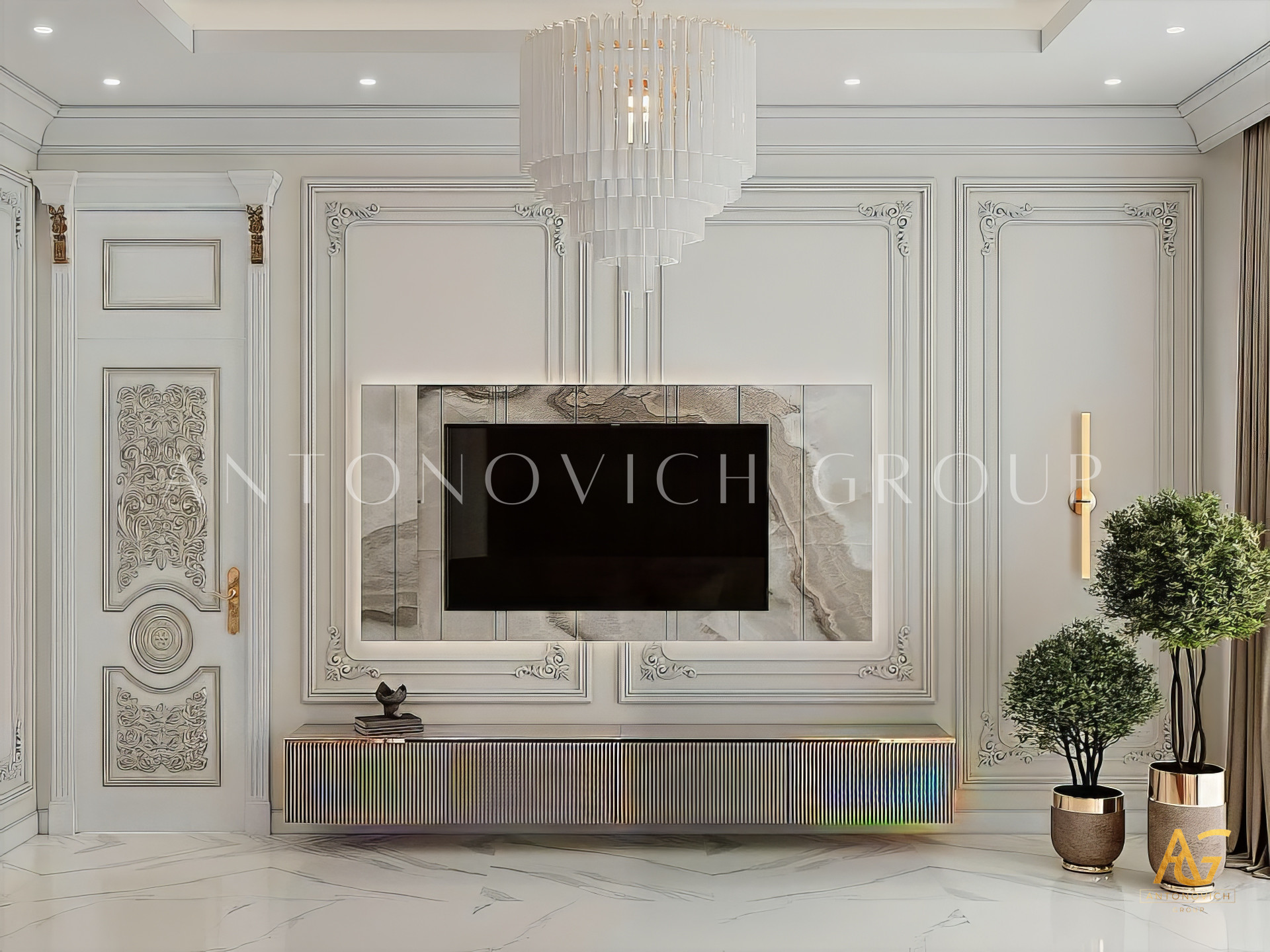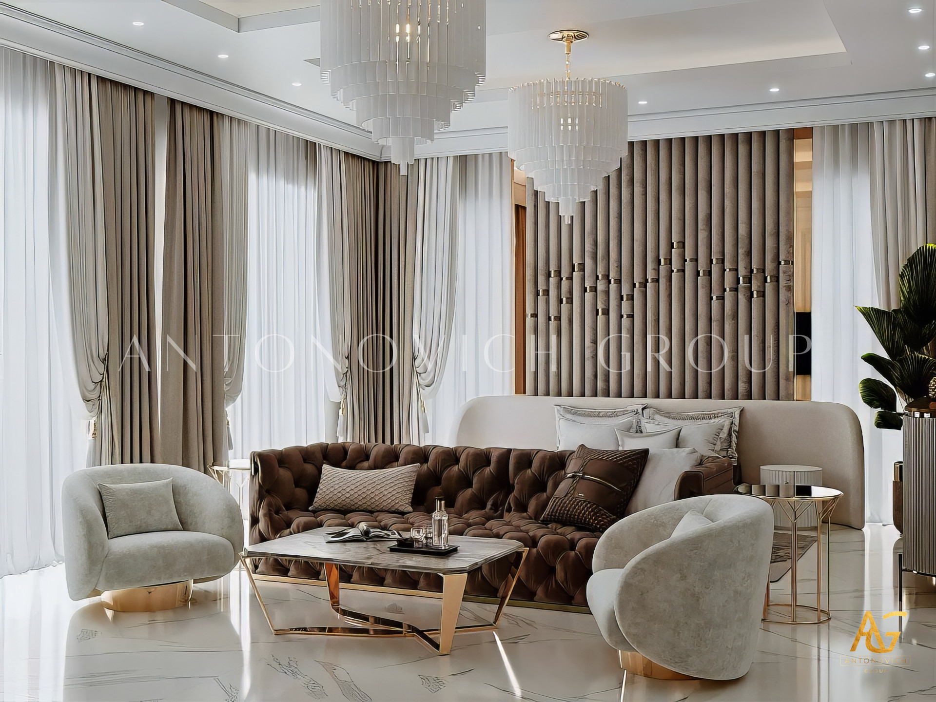The lush grandeur of the interior in a classical style fully reflects the high status and respectability of homeowners. House design Abu Dhabi reflects the elegant blend of tradition, innovation and genius design ideas. The interior design reflects the charm of the luxury palace. Gorgeous bedroom with exquisite motifs, unique solutions in the decor captivates by its magnificent decoration. Interior designers have created a project that gives aesthetic pleasure. Artistic expression of the bedroom interior is based on elegant combination of colors, textures and materials. The main decoration of the interior, as befits the bedroom is a large comfortable bed. Its image is closely linked with wall and window decoration. The headboard is decorated with carved lace decoration and upholstery made of soft natural leather of cream color. The headboard is framed by a shallow arched niche made of wood, painted in milky-white color, completed with carved decoration and exquisite pilasters. Inside the niche is filled with luxurious silk wallpaper with classical ornaments. And on the sides this elegant composition is framed by two stripes of mirror panels, which reflected and multiplied luster of the luxury interior. Wallpaper with a touch of pale emerald green is perfectly in tune with a window decor. The large windows draped with luxurious noble silk curtains with printed patterns. The interior design is intended to give pleasure from pleasant and relaxing stay in an environment of royal luxury. House Design Abu Dhabi in every square meter reflects the high degree of luxury and comfort.