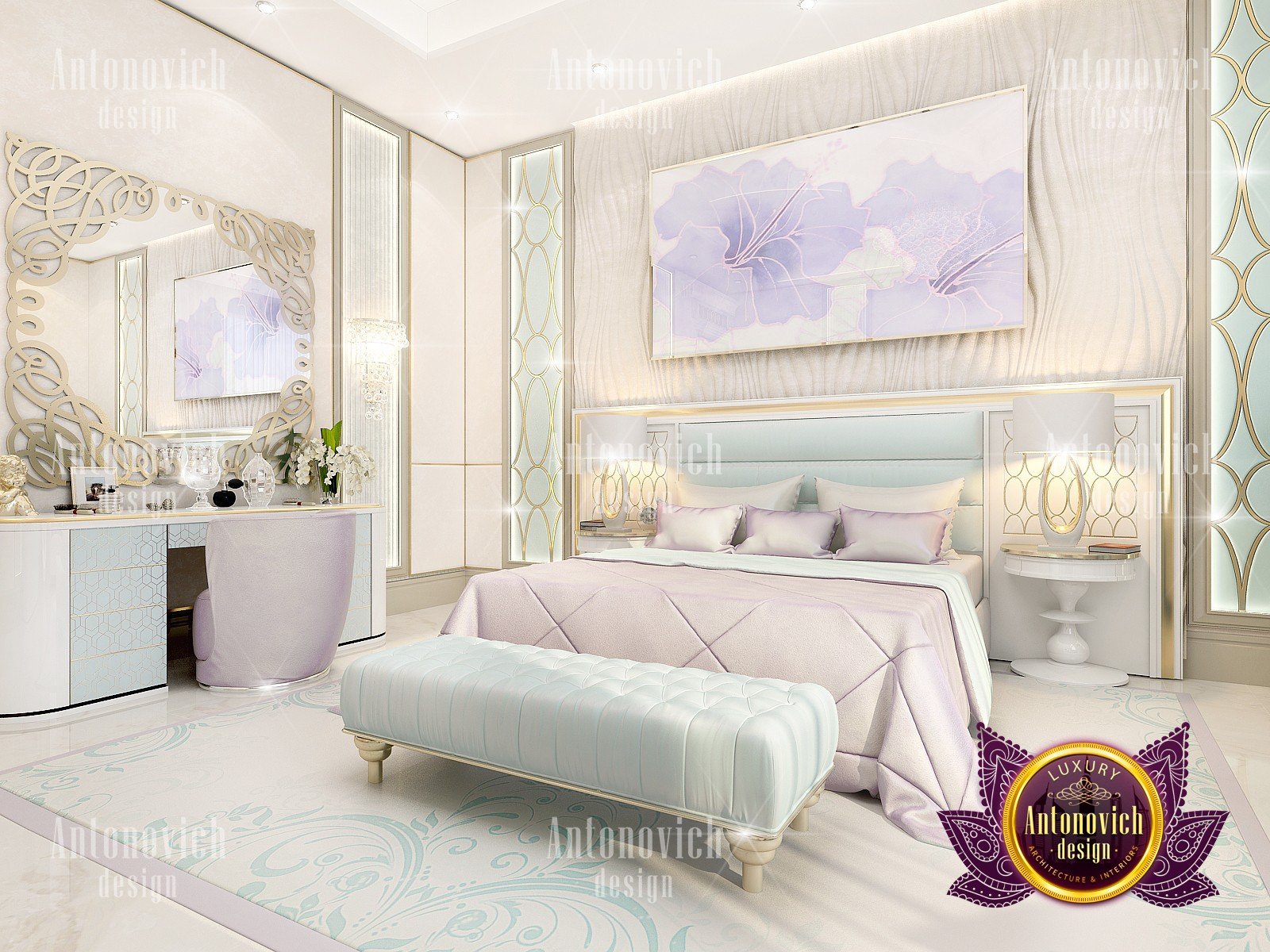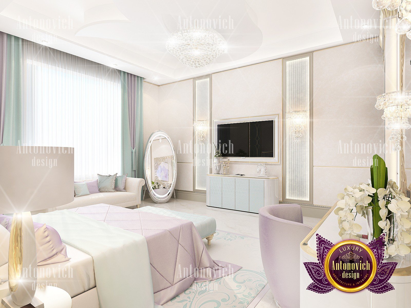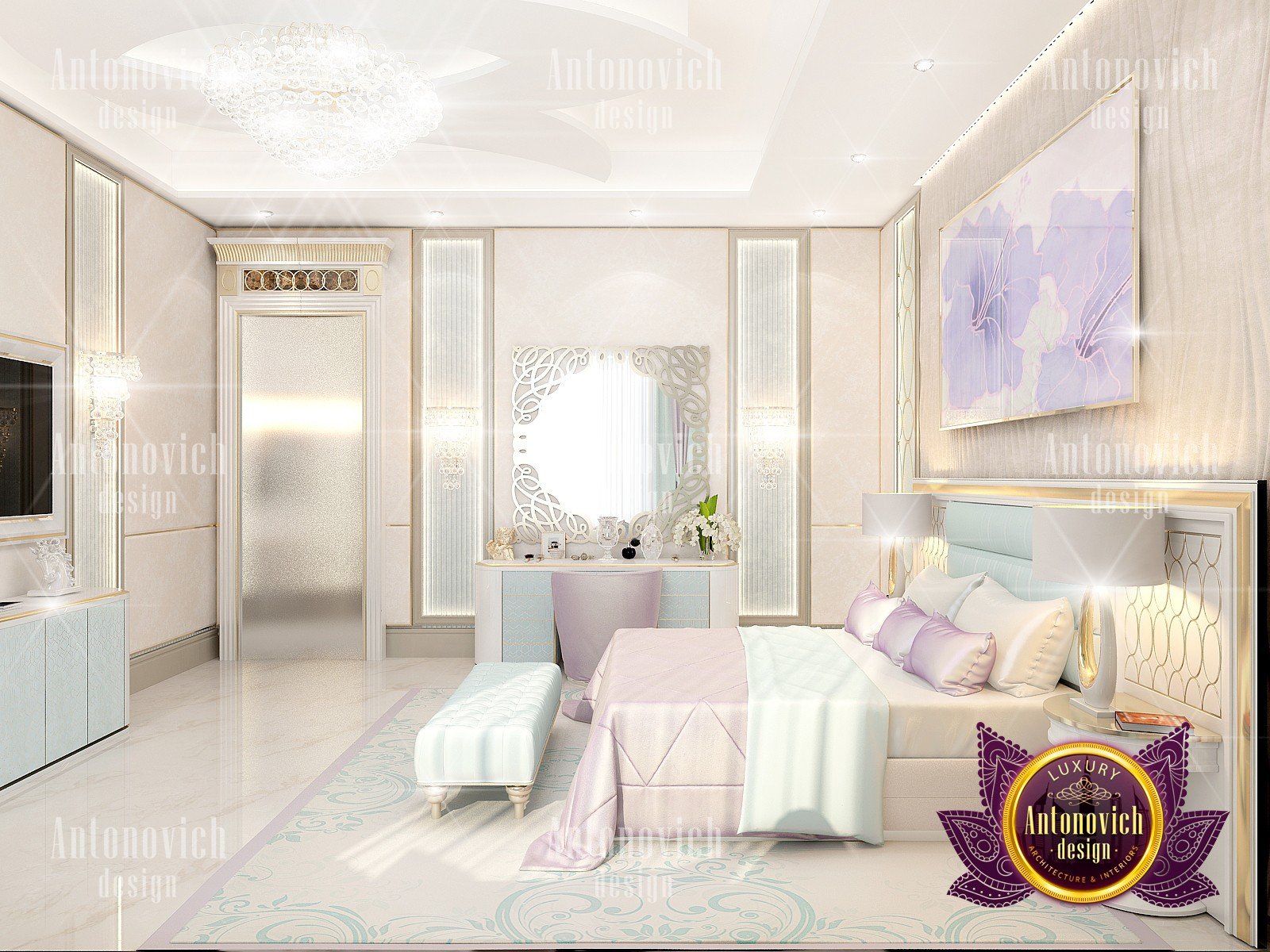Bedroom interior is full of passion, tenderness and subtlety. Interior Designers Dubai in the authors apartment project elegantly repeated all the dreams of the owner of the apartment about her perfect interior. Art Deco combined with neoclassical style perfect fits for the realization of all the wishes of the customer. Each fragment of the interior has a bright character. The windows in the semicircular portal are draped with curtains of luxurious noble silk in light beige color, which is supplemented with wide edging of dark chocolate color and finely picked up with large tassels. The interior is full of exquisite designs. Very stylish and colorful fragment became wall decor behind the headboard. The high milky upholstered headboard look luxuriously at the background of the wall. The walls are decorated with bright elite wallpaper with black ornament on a cream background. With the ceiling design the designers give the space harmony and expressiveness. Stretch creamy ceiling is complemented by point crystal chandeliers and elegant chandelier in the center with lots of neat white lampshades. Bedroom interior design has an elegant and stylish character, which clearly expressed emphasis of home comfort warmth. As a rule, for luxurious bedrooms interior designers Dubai offer floors decor of natural wood of valuable species, and additional i tems as carpets and fur rugs. Bedroom design perfectly matches bright and catchy interior design concept.
