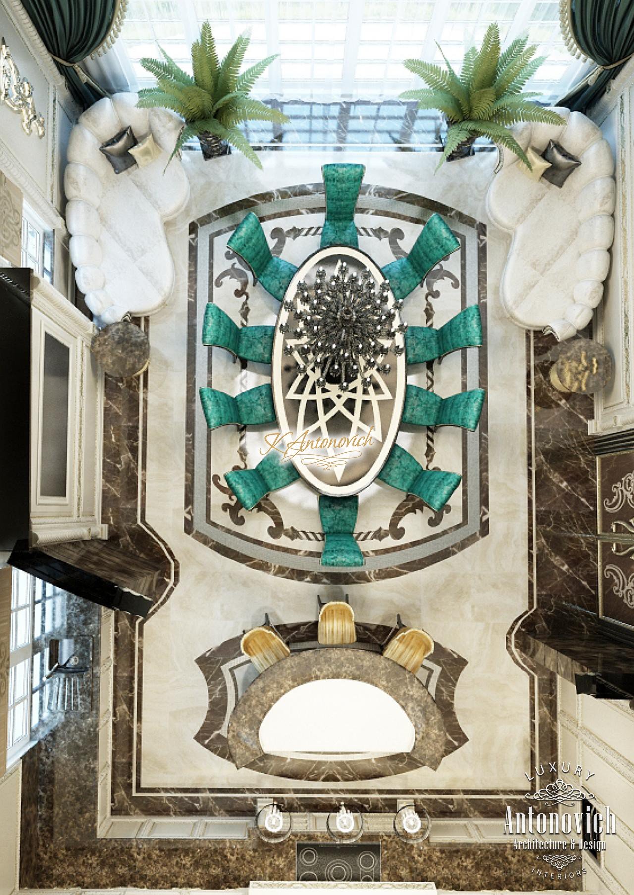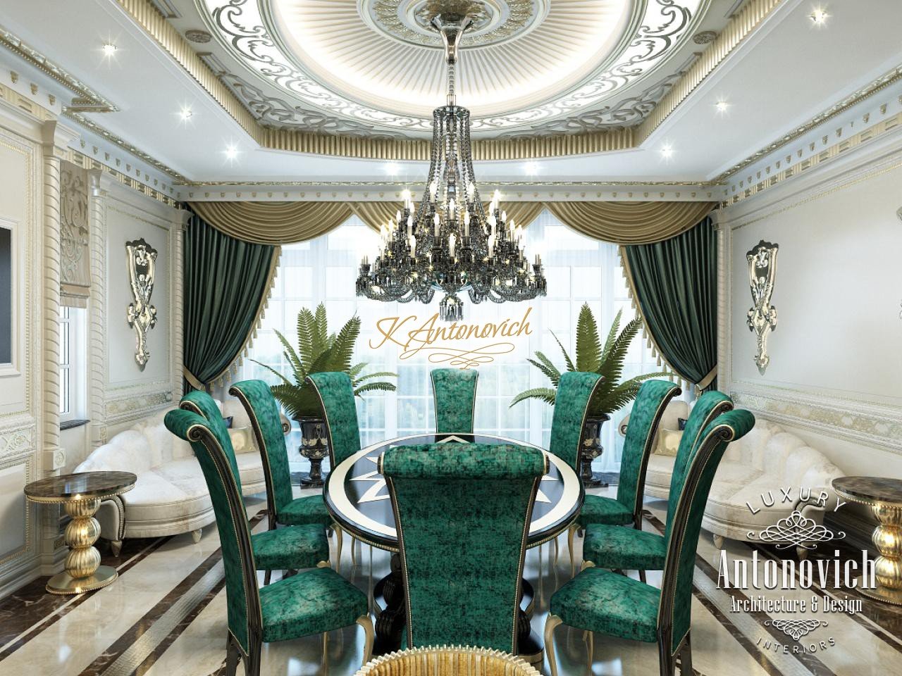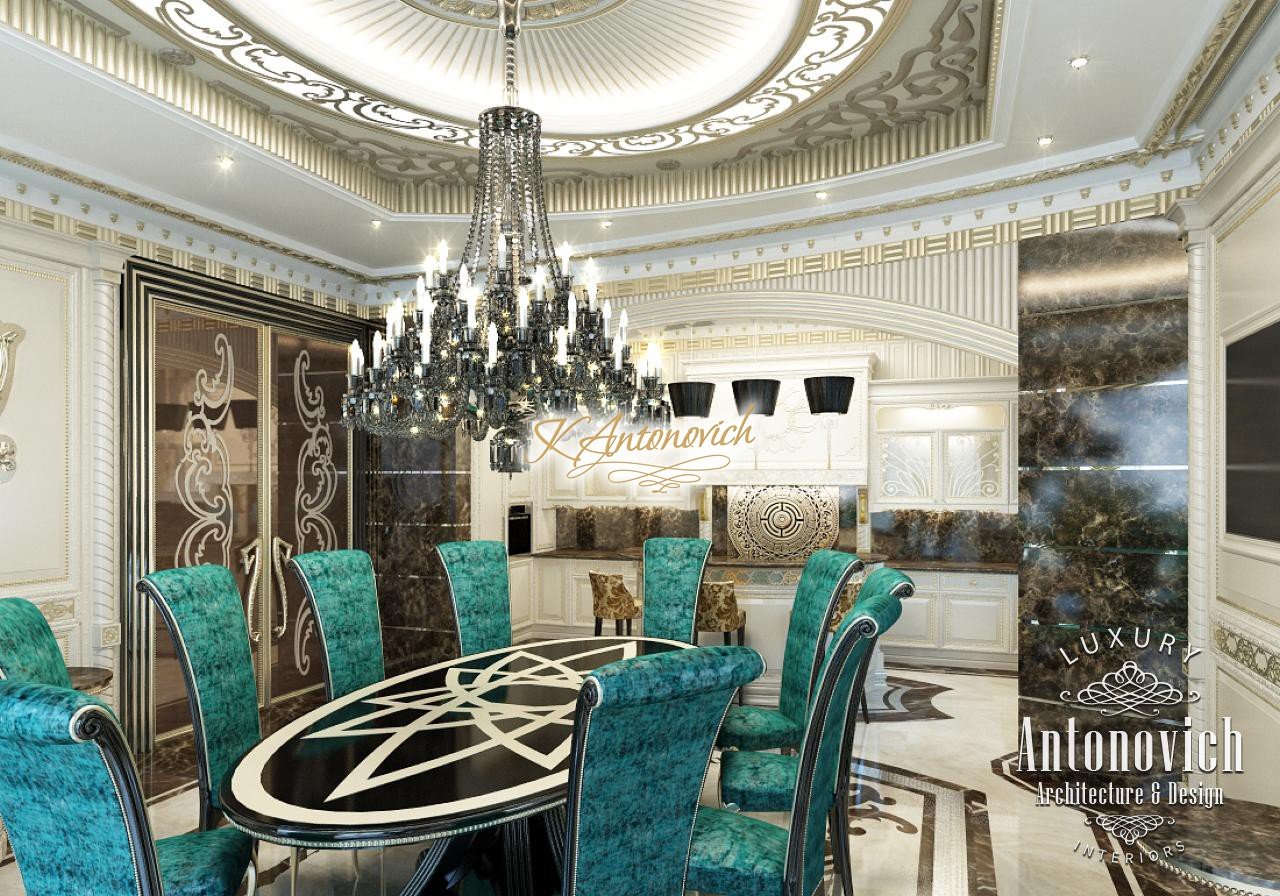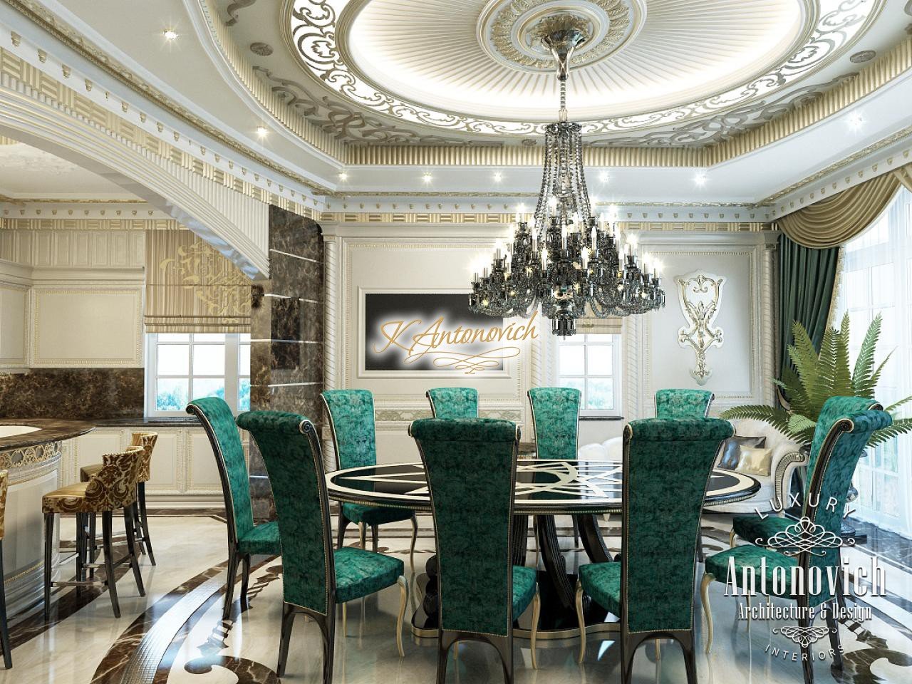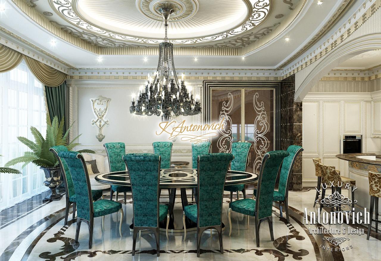 Very bright and stylish villa interior in Abu Dhabi confirms that owners of apartment are people with great taste and understanding of beauty. Kitchen design is a continuation of the spacious dining room interior. Interior Designers Abu Dhabi perfectly organized the space. The kitchen interior with its elegance and laconism highlights the vivid image of the large dining room. Everything here speaks of the warmth and hospitality of home owners. Kitchen interior design reflects the desire of absolute comfort and aesthetic perfection. The kitchen area is separated from the dining area with elegant arch. Milky stylish facades contrast with working surfaces of dark natural marble. Bright accents became lamps with black shades over the bar. With floor decor interior designers Dubai zoned interior space, separating the dining area and the kitchen area. The dining room reflects the wonderful celebration of life surrounded by luxury and comfort. Bright individuality of the interior underlines the bright and unusual nature of the home owners. Soft chairs with noble backs are upholstered with sumptuous velvet of emerald hue. Expression of interior is added with a dark table with a clear geometric patterns. A festive mood is set with the ceiling with exquisite niche and a massive crystal chandelier.