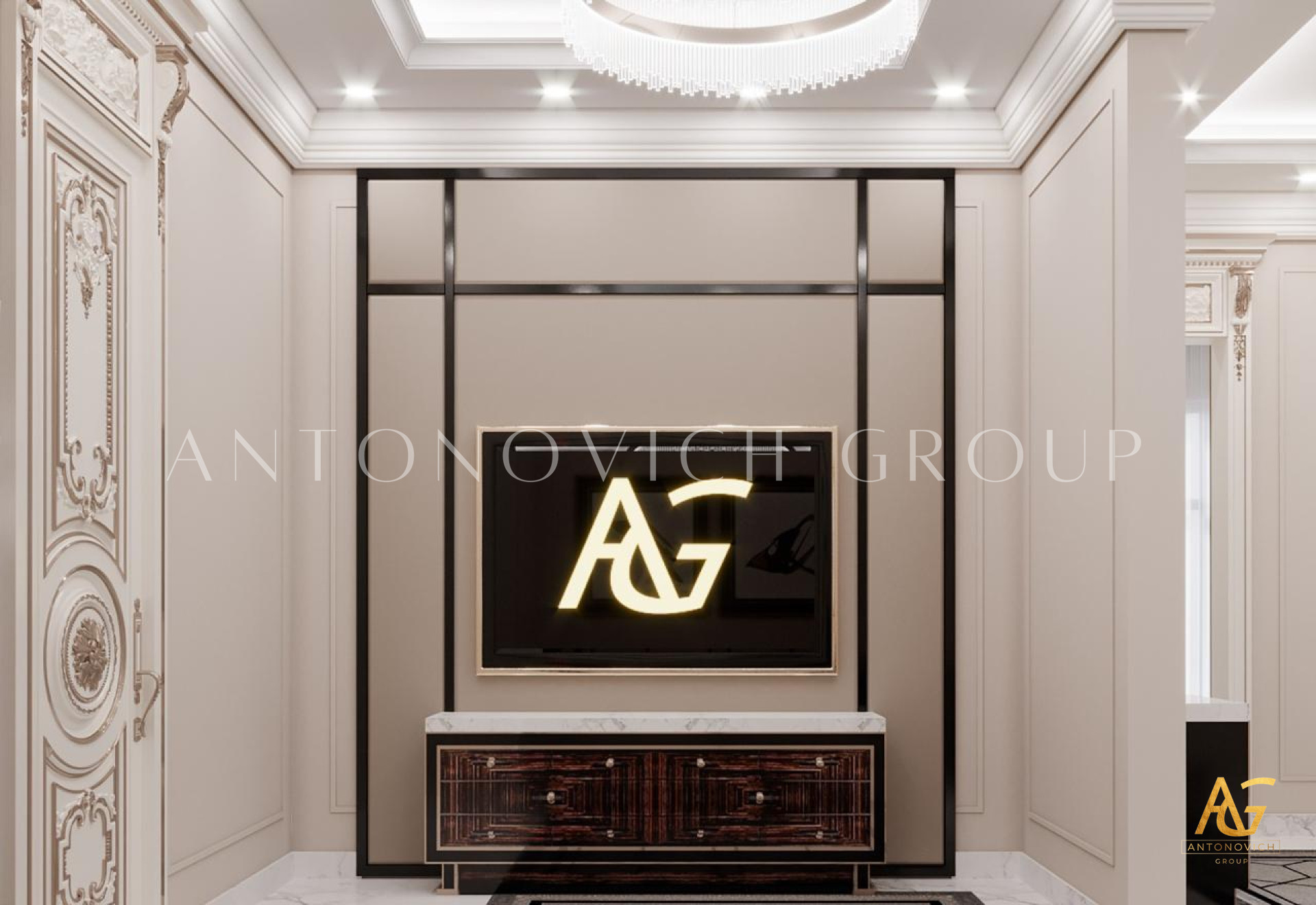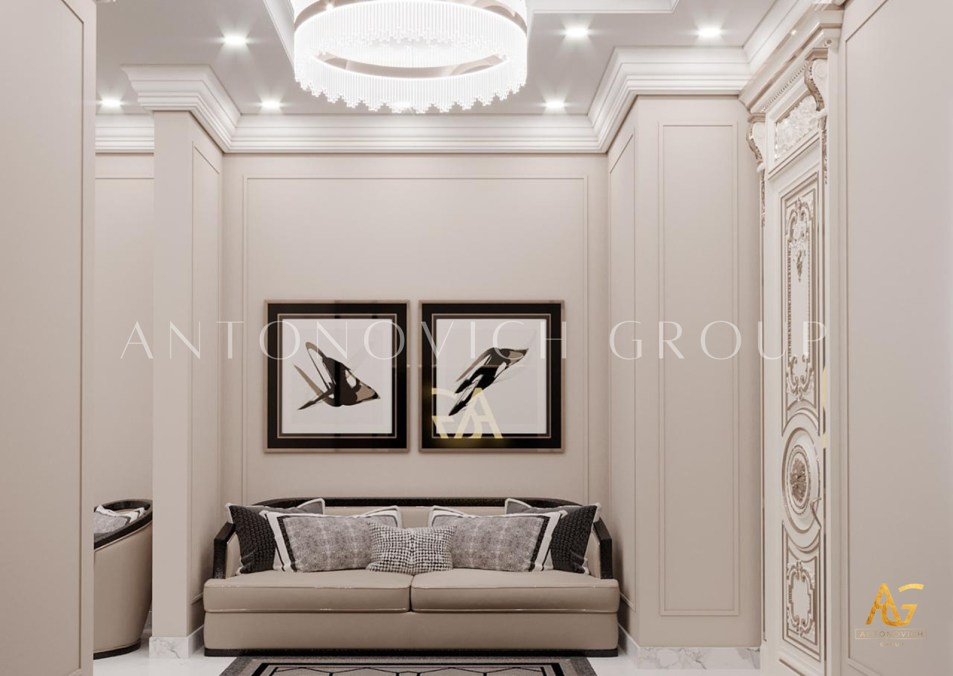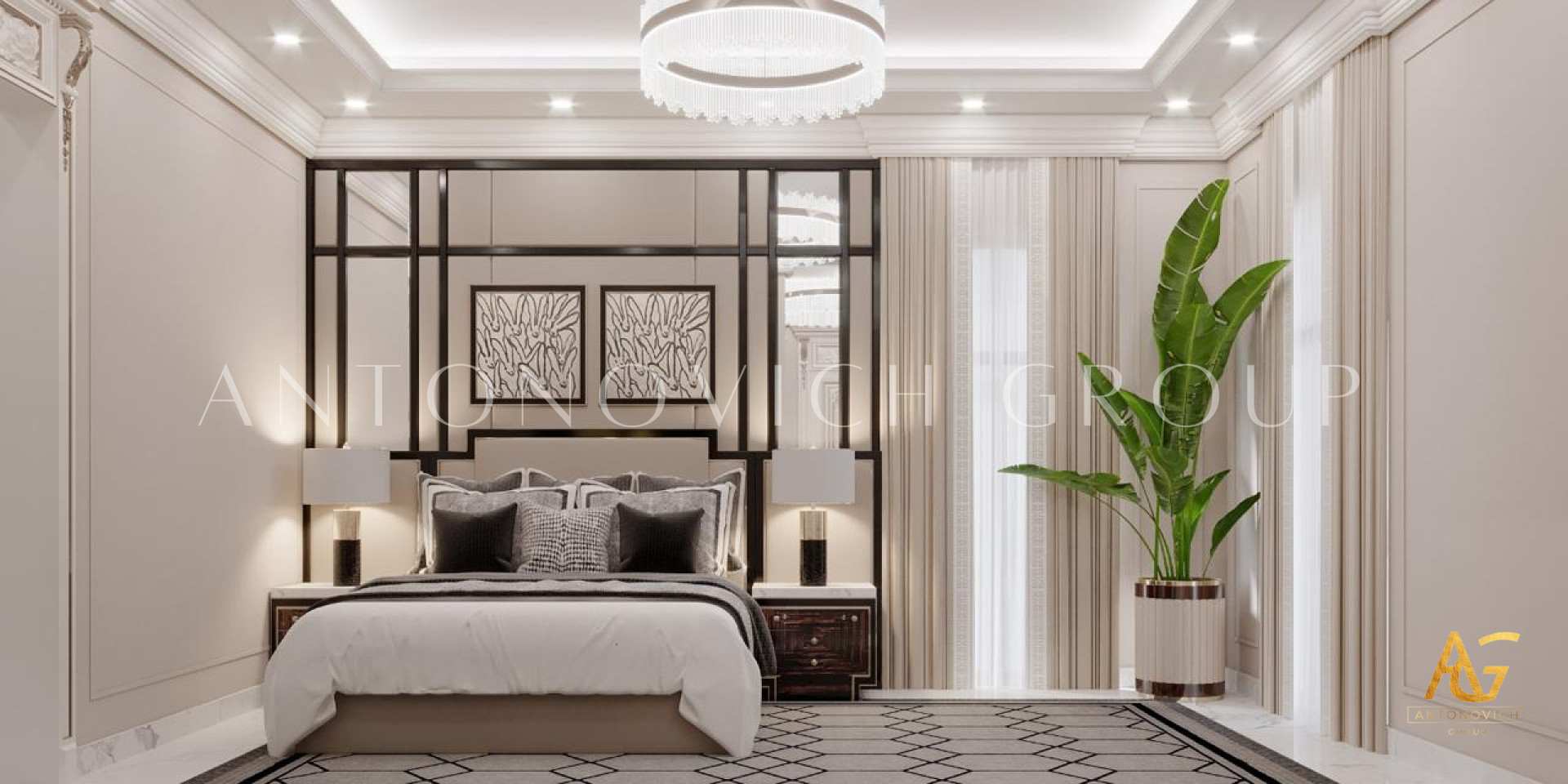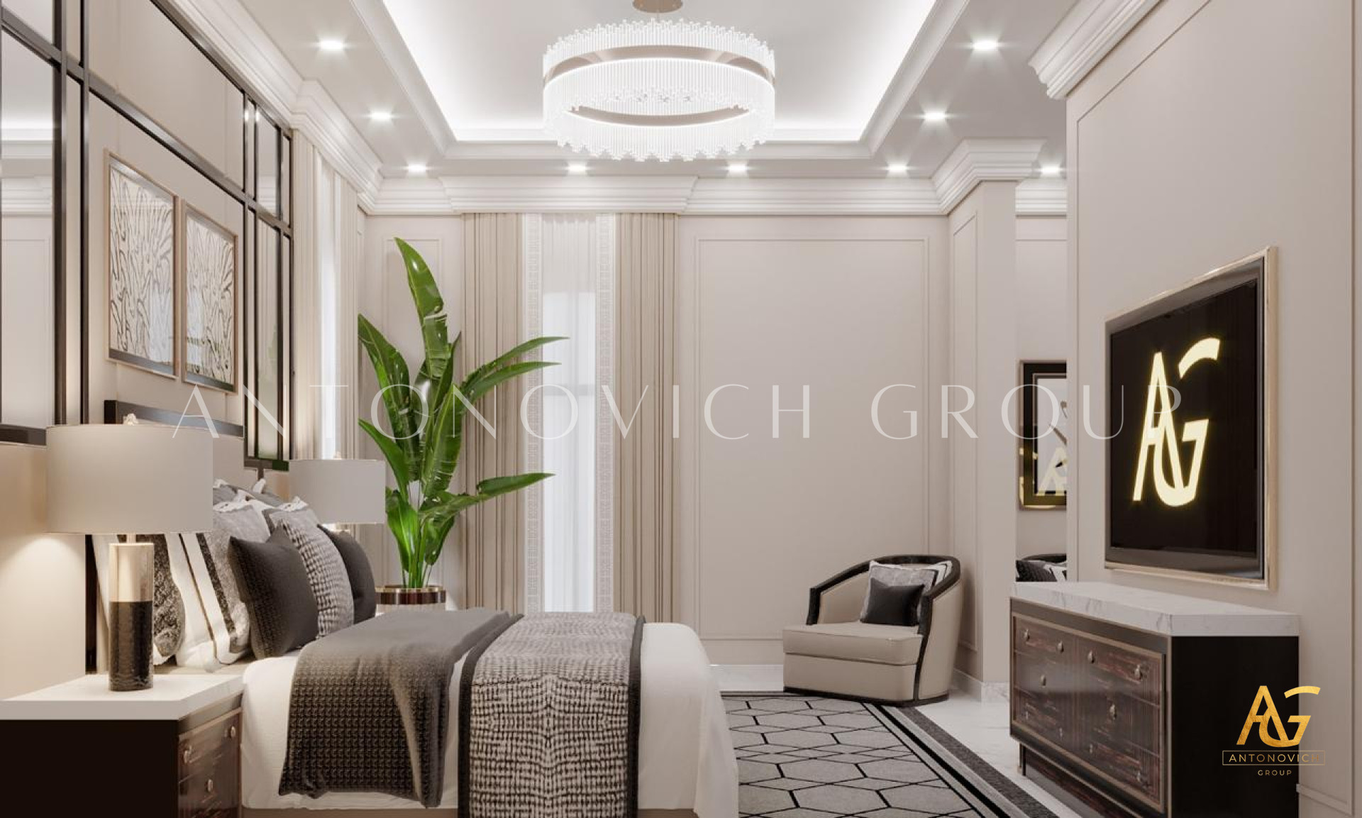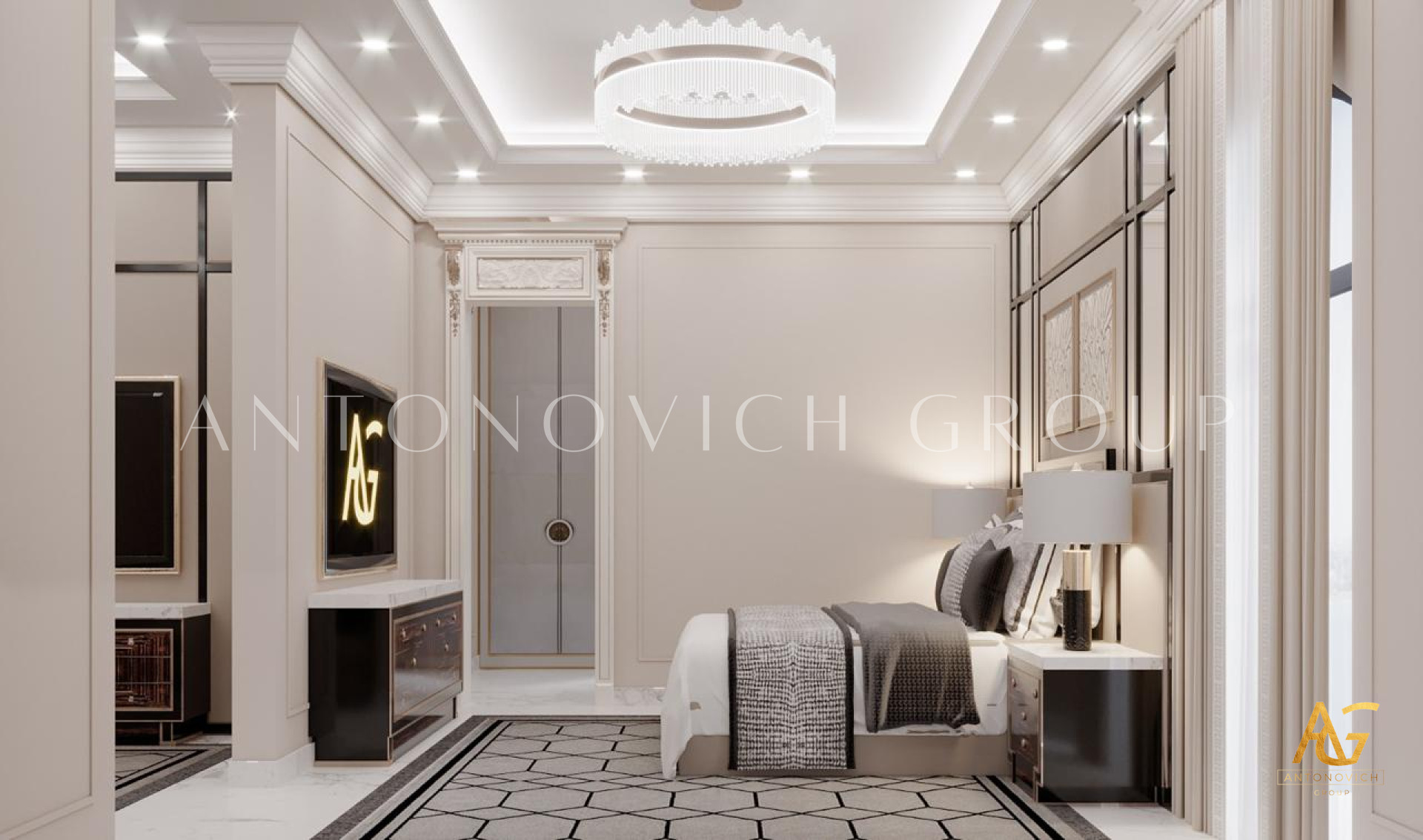 Bedroom interior design harmoniously combined contemporary and classical art deco. In the room everything is created to serve as a feeling of absolute comfort. Interior designers Dubai create a luxury of a new era in which ingenious design ideas, time-tested traditions and modern technology are perfectly combined. Bedroom space is perfectly organized and highlights the advantages of the architectural layout. For bedroom a room with large corner windows was allocated. Therefore, in the bedroom interior curtains became very bright accent of festive mood. For curtains interior designer suggested noble silk of lilac shade. It embodies the perfect combination of tradition and innovation of the ceiling decor. Elegant chandelier in the style of Art Deco is located in the center of the medallion with stucco. This item is decorated with a large mirror panels with delicate swirls ornament. In this panel luxury bedroom interior reflects and everything is shining with mood of the eternal celebration of life. The bedroom interior lighting is complemented with small ceiling lights, which are placed evenly along broad snow-white molding. Bright and luxurious accents became elegant furniture. Comfortable bed is decorated with an exquisite headboard with carved decoration. The walls decoration perfectly combines silk wallpaper of lilac shade with silver ornaments and mirrored panels. Bedroom design combines elegance, nobility and enjoyable holiday with a cozy romantic mood.