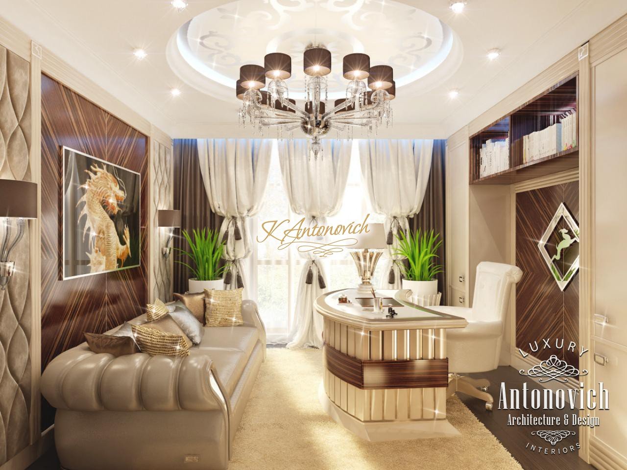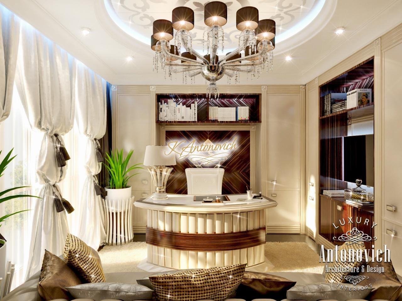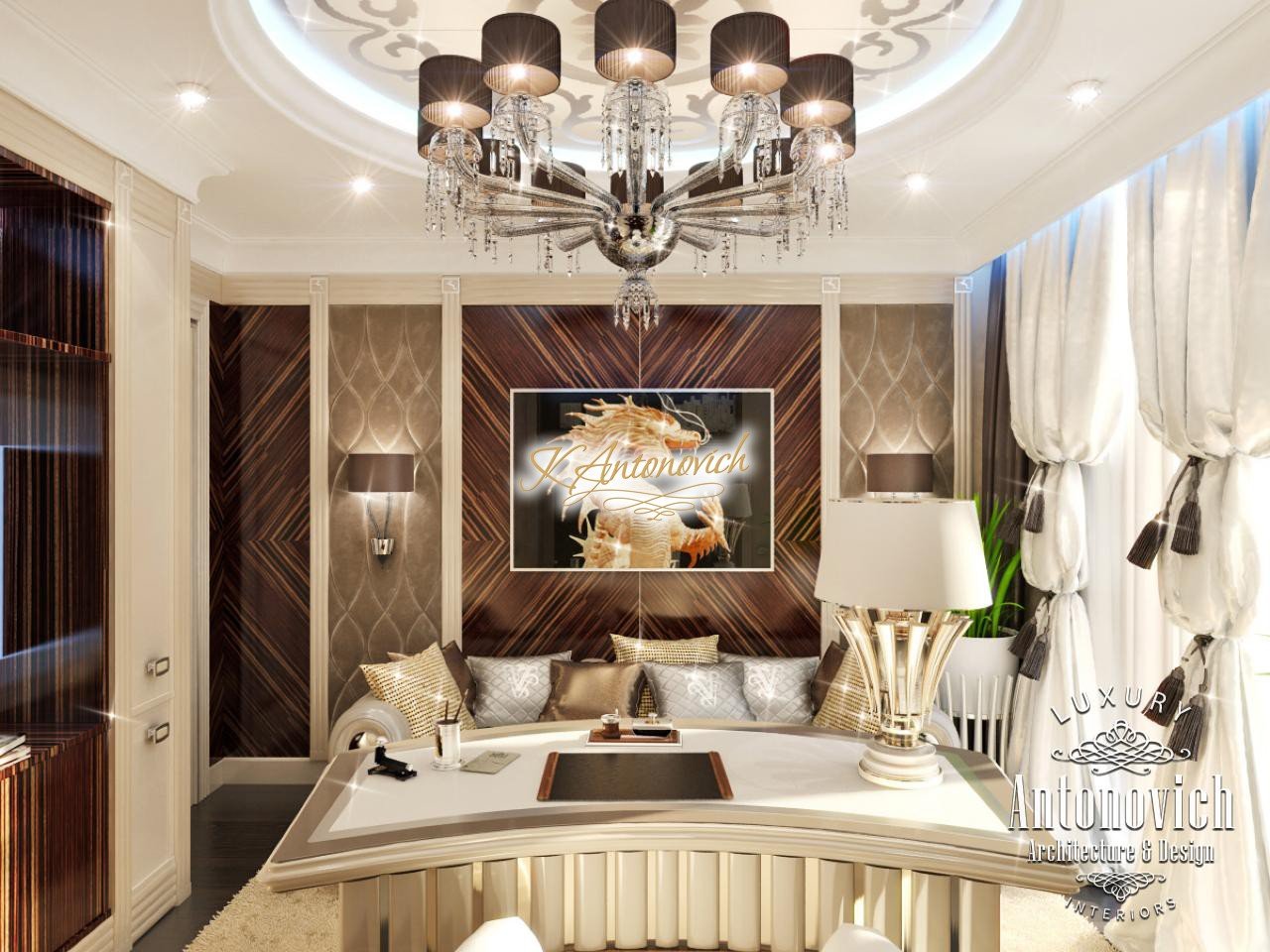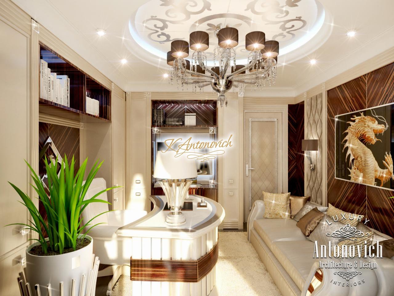 Masterly work of interior designers in Dubai reflects the fact that this office belongs to a successful business woman with a refined taste. A bit gentle character of the interior subtly repeats the refined nature of the owner of the apartment. Invariably, a harmonious combination of working atmosphere and warmth of home comfort inherent in the luxurious interior of the study. Office interior design is a separate direction in the art of design. Here it is necessary to combine the comfort of home and business atmosphere. In this author's project of the study a wonderful emphasis on comfort and warmth became the window decoration. Curtains in the study of the noble silk are picked up with large tassels. The ceiling is decorated with elegant chandelier and original decor. Respectability of the office is emphasized with solid wood of valuable species in the decoration of the walls. Inserts made of soft textile panels and elegant scone perfectly fit into the interior. Luxury office interior design includes the development of designer furniture that has an aesthetic and ergonomic perfection.