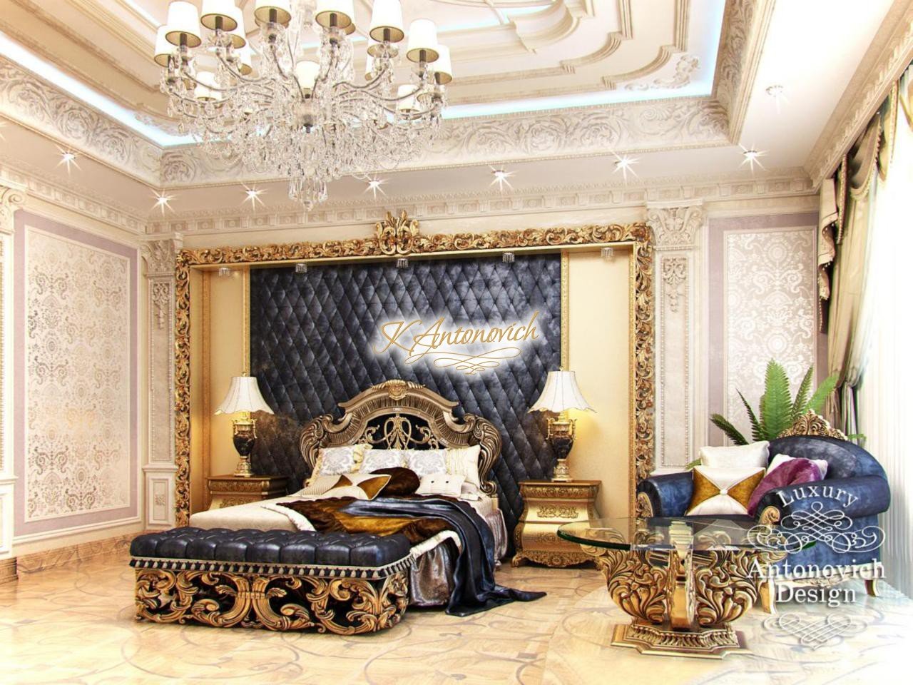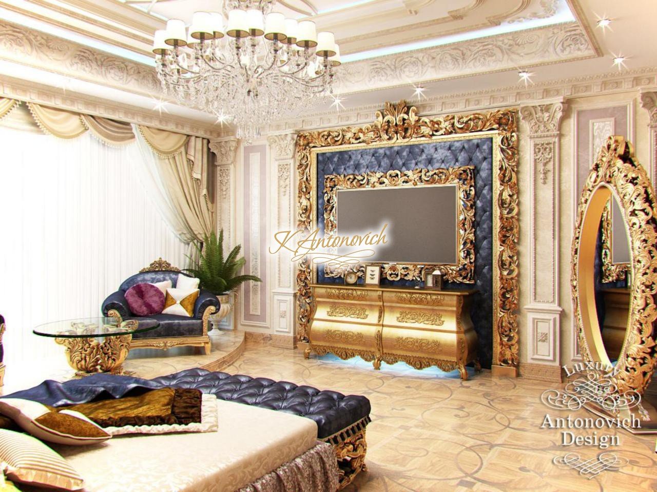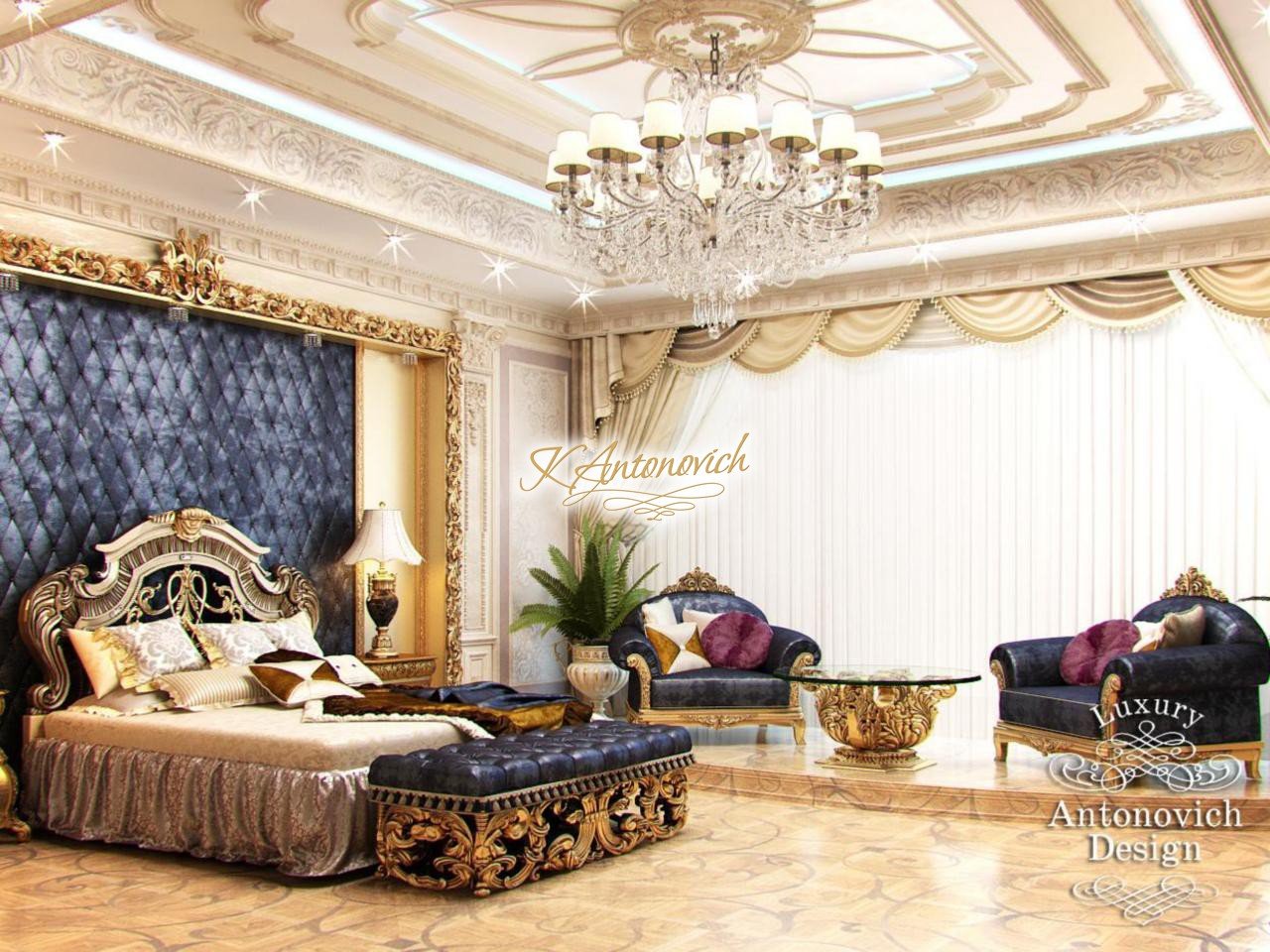 The magnificence of the bedroom interior admires for its beauty and luxury. Interior Design Dubai, which is offered to customers by Antonovich Group reflects the trend of grandeur and comfort at the peak of urgency in this beautiful country. Bedroom design has become a part of the authors project of one of the luxury villas in Dubai. Spacious place with high ceilings has been created by talented interior designers in Dubai, giving a truly palatial splendor. The ceiling is decorated with a niche with multiple tiers. Fine outlines of the niche are illuminated with a line of the soft blue backlight. This beauty is complemented by a wide strip of curls stucco decoration, festive lights of the massive chandelier, and a variety of ceiling lights. An elite design studio in Dubai offers the best that exists today. In this authors project, the basis of a luxurious bedroom image is a comfortable bed with a high carved headboard. All carved decoration in the bedroom interior is covered with gold leaf. Gold looks very impressive against the backdrop of a soft wall panel, which is upholstered in noble velvet of blue nightshade. This composition is accompanied by opposite wall decor. Bedroom design is in the best traditions of modern luxury.