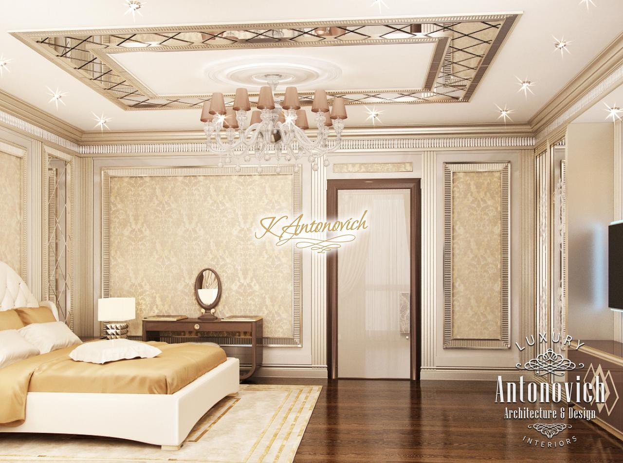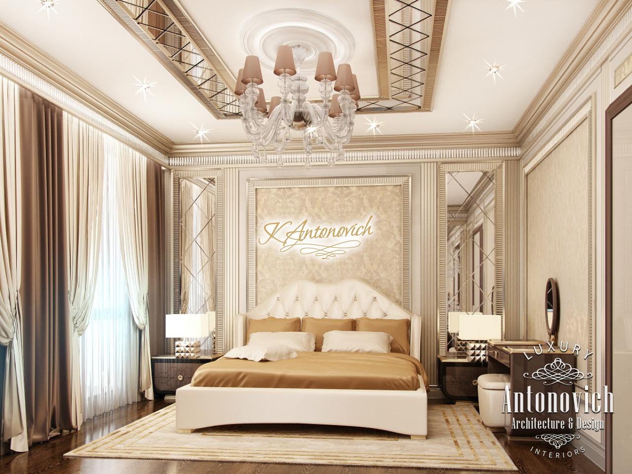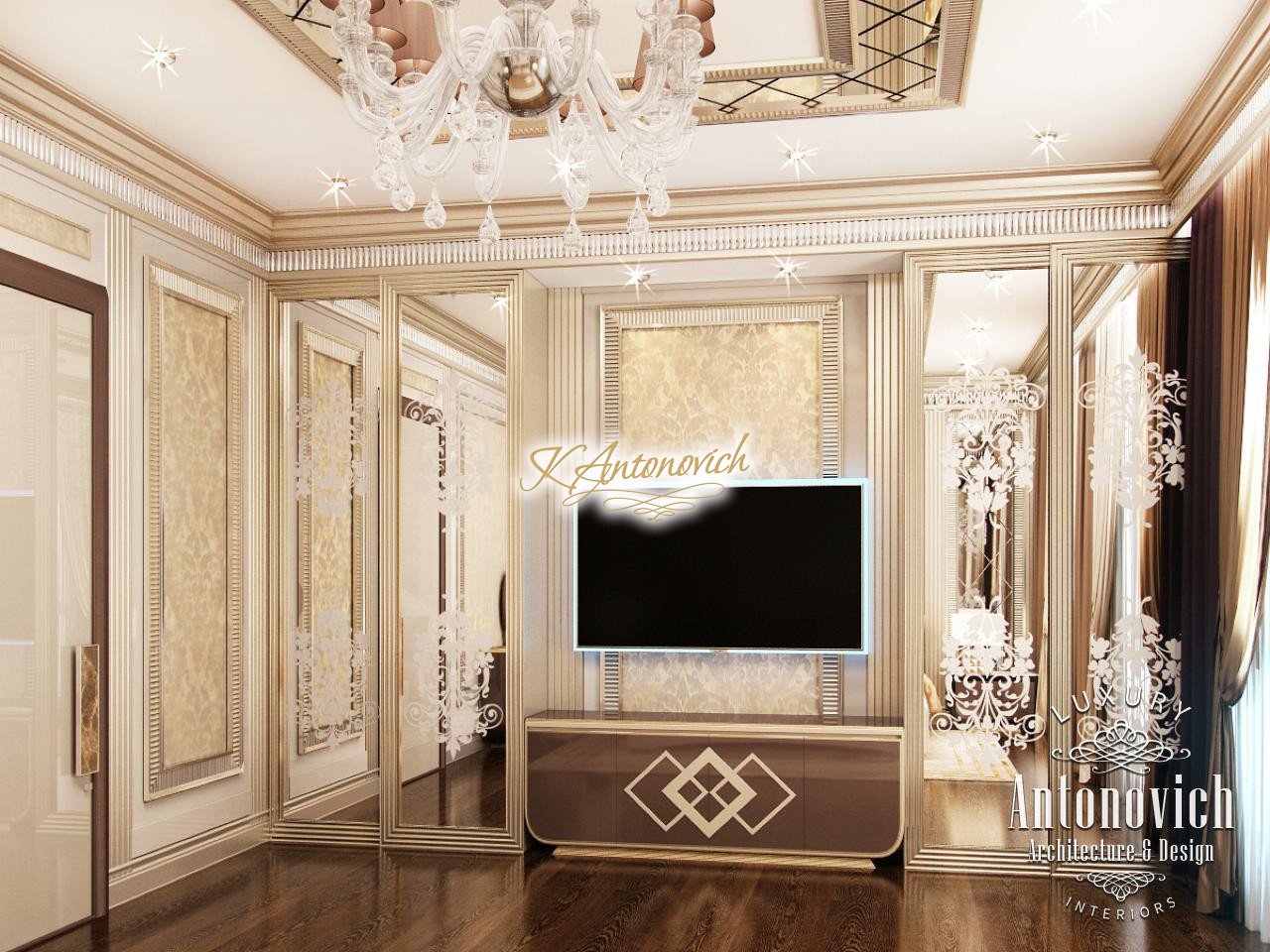 Luxury interior design from studio Luxury Antonovich Design is always deep and multifaceted process. Working on the project, interior designers Dubai take into account dreams and desires of each family member. The villa design includes the design of several bedrooms and several children's rooms. For a large and happy family an ideal space was created, in which every member of the family feels completely comfortable. Bedroom design was developed for the mother of the owner of the house. Respect and love to her are fully expressed by the luxurious interior. Bedroom design radiates warmth of home comfort. Floor of wood of valuable species is covered with a special varnish and completed with a large natural carpet, on which a comfortable bed is located. Soft headboard is upholstered in natural milky leather. The diamond marks with gilt buttons look charming, contrasting with silk bedspreads of caramel color. Luxury bedroom interior features are enhanced with mirrored panels, which interior designers Dubai used in the decoration of the walls and ceiling. Boiserie behind the headboard is decorated with creamy pearlescent plaster. Lighting in the bedroom is provided with elegant chandelier with crystal pendants and flavorful coffee color shades, as well as ceiling lights. In total creamy caramel palette bright accents became furniture of chocolate shade and curtains. In the decoration of the windows interior designers use silk of milk and chocolate hues as a fine contrast.